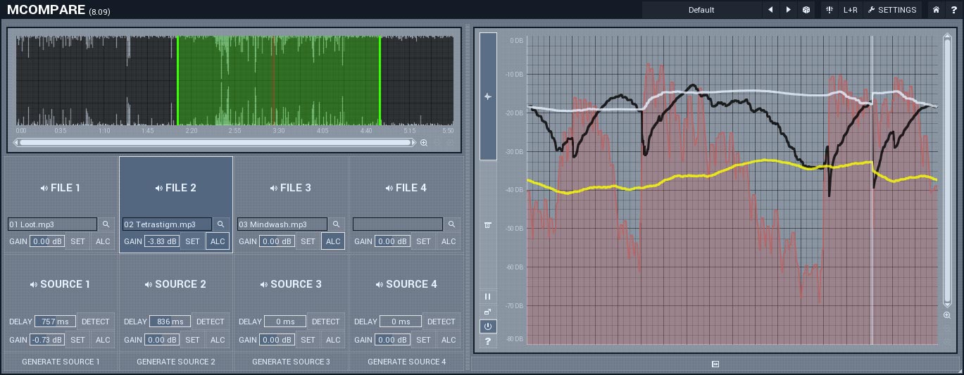 MCompare vous permet de rapidement comparer votre mix ou votre master à des morceaux de référence ou des états antérieurs de votre chaîne de traitement dans un seule fenêtre.