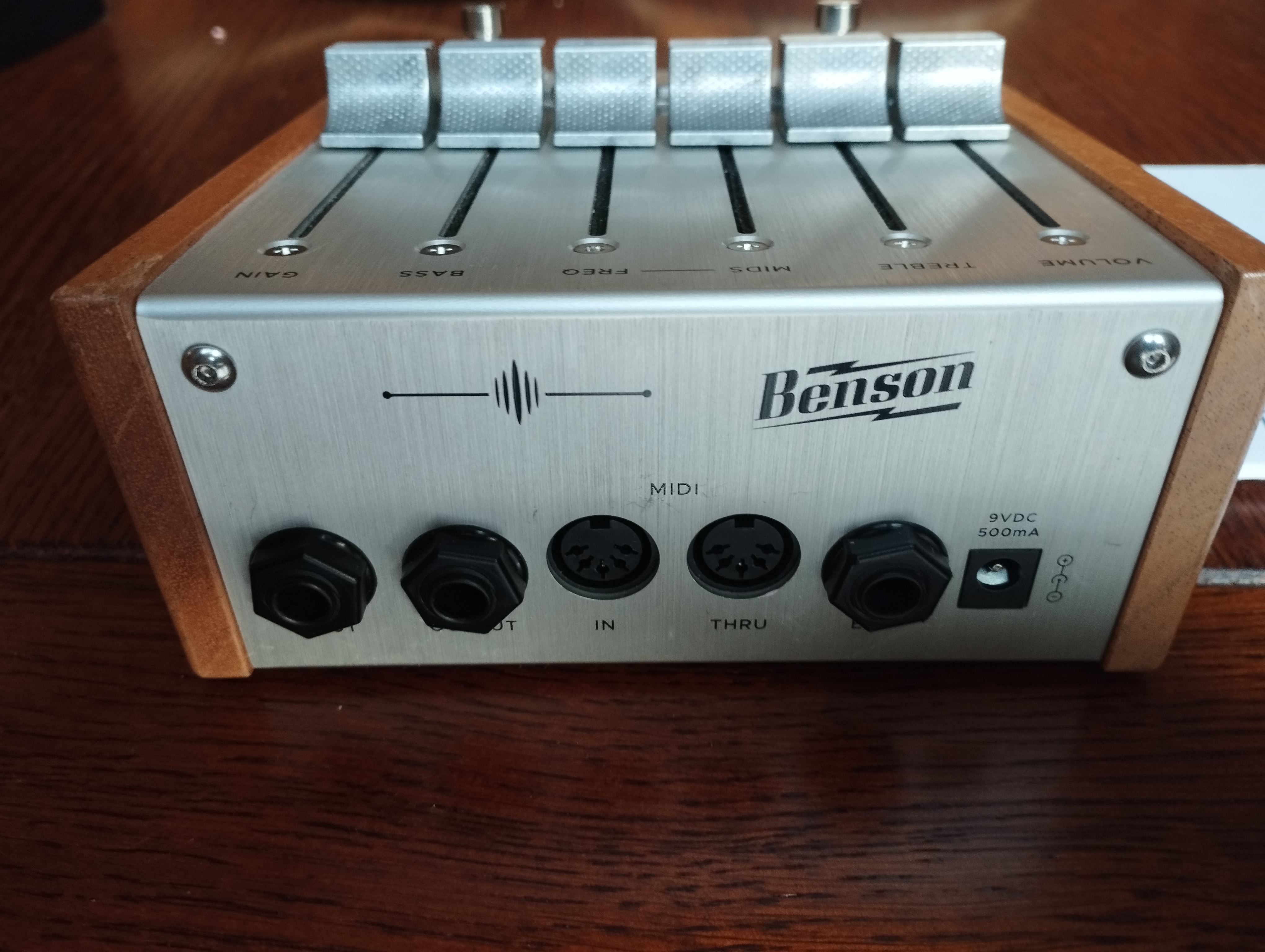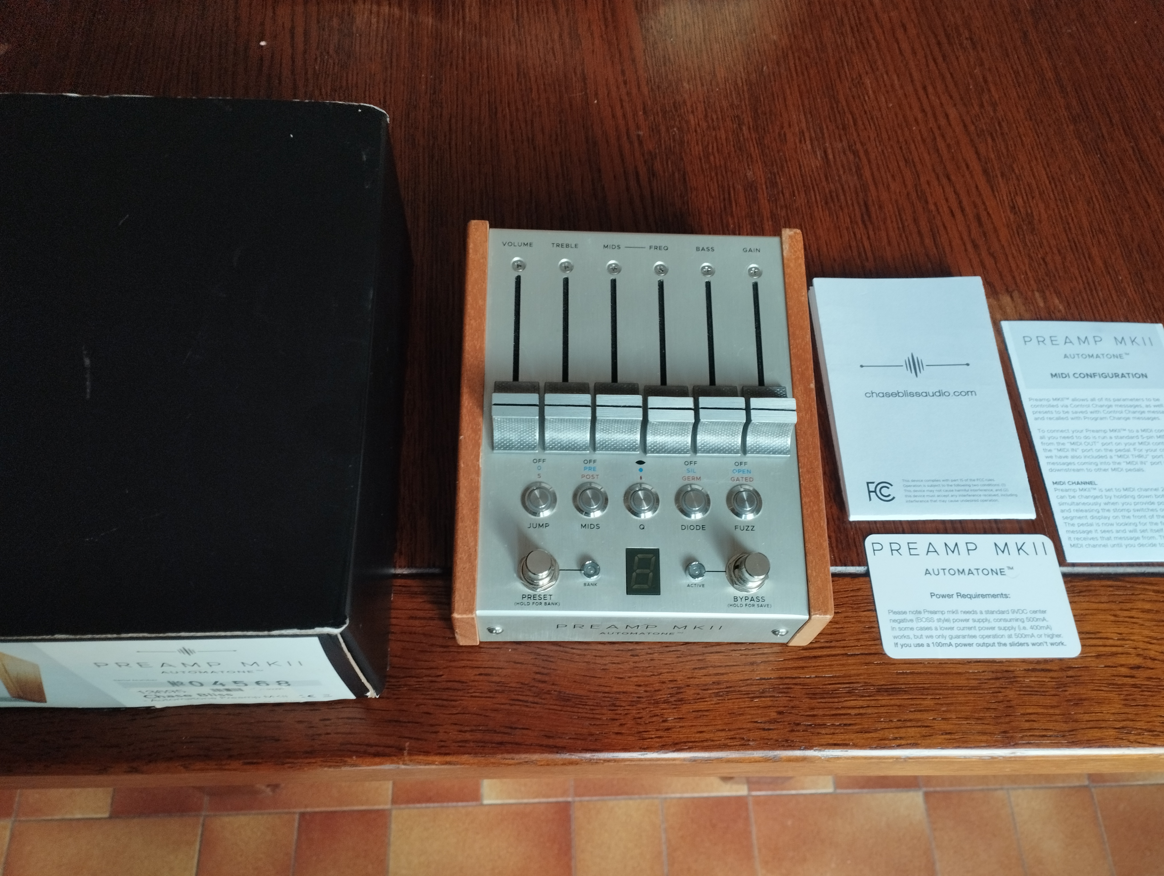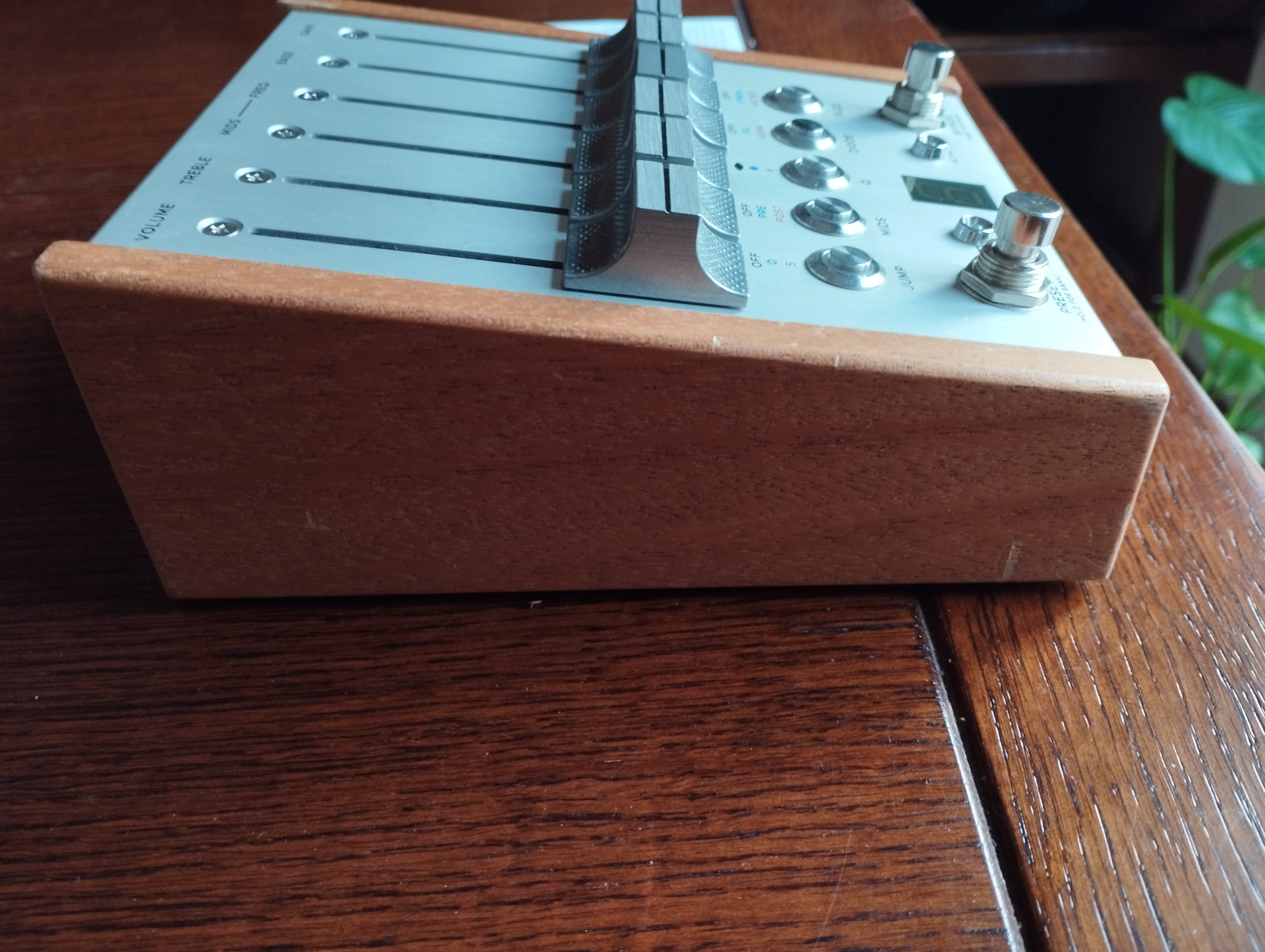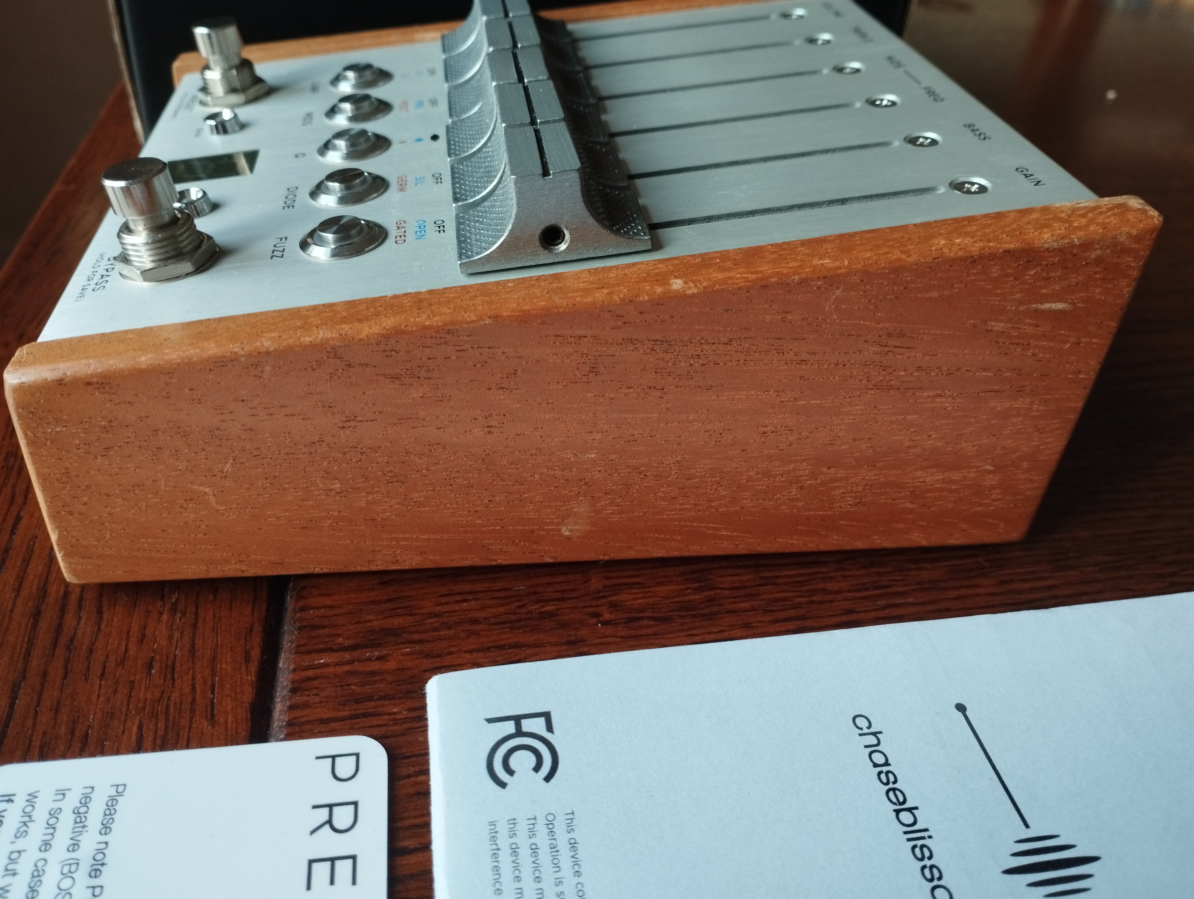 Preamp, overdrive, équaliseur paramétrique et fuzz.En excellent état de fonctionnement, quelques traces d'usage sur le bois qui marque assez facilement, bien mises en relief sur les photos à la lumière du jour.