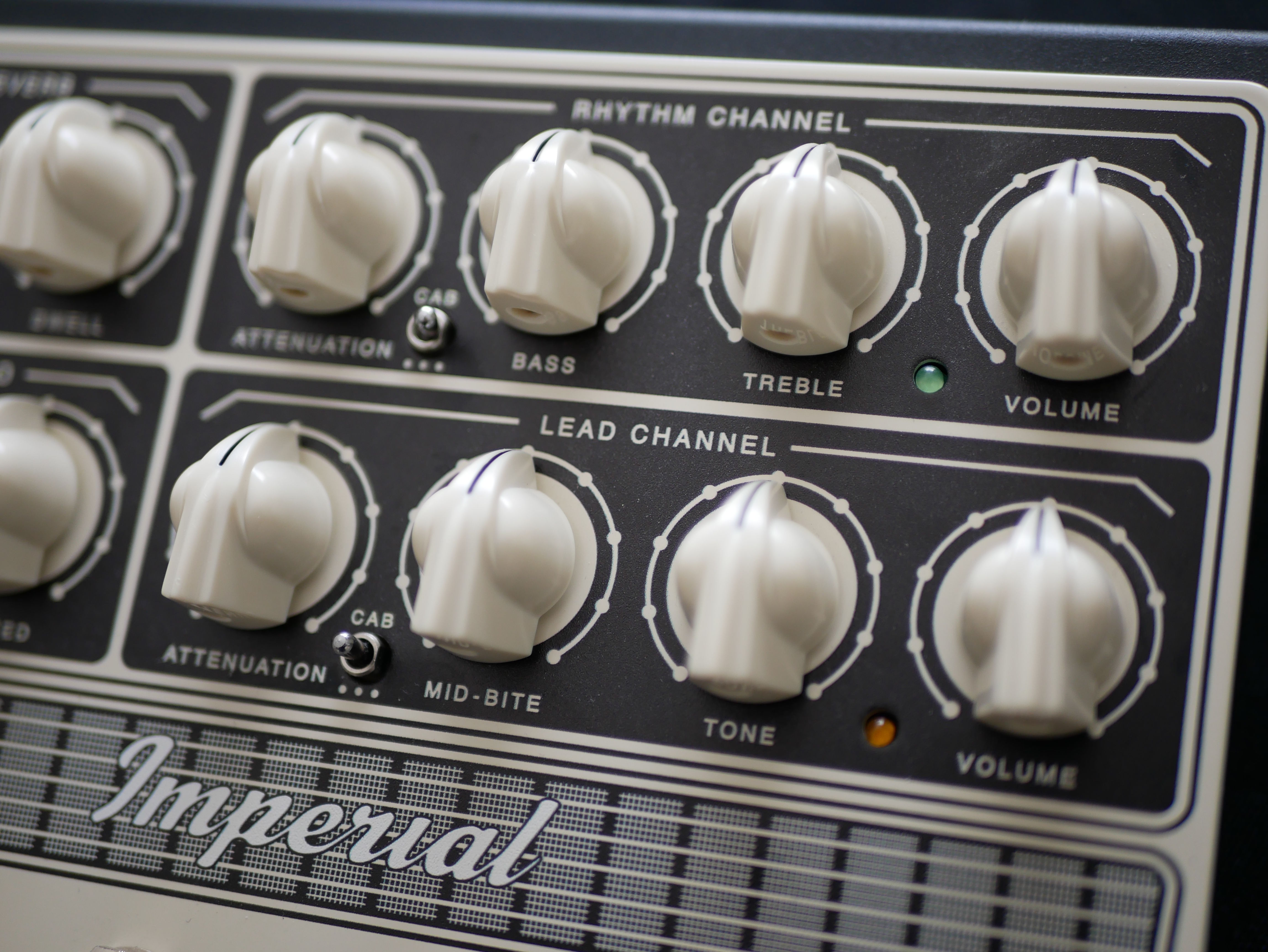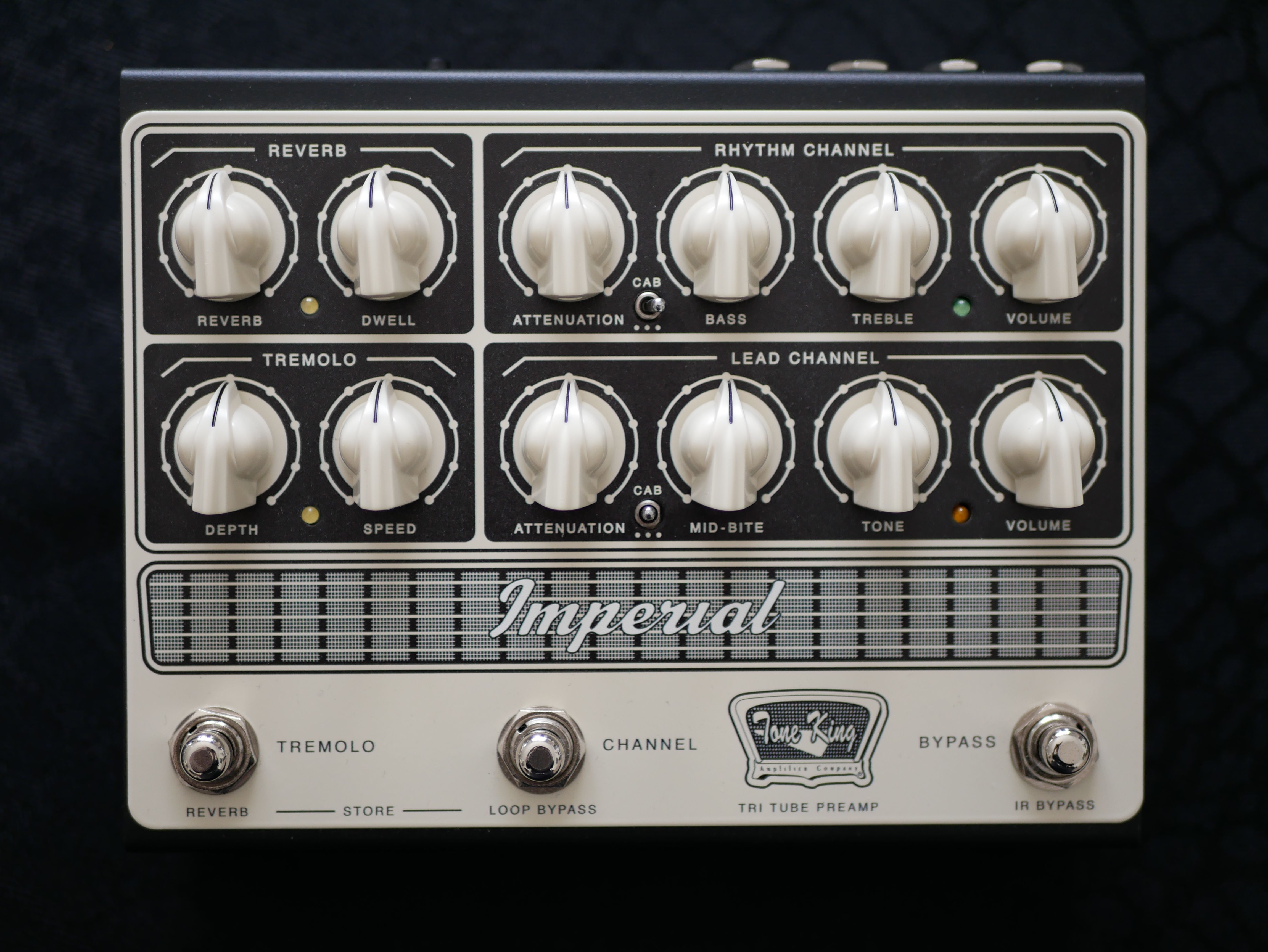 À cela s’ajoute une section d’effets intégrée reprenant deux éléments emblématiques de l’ampli Imperial. La réverbération à convolution de type spring dispose de réglages REVERB et DWELL, permettant d’ajuster à la fois le niveau et la profondeur de l’effet. Le trémolo, lui, propose les contrôles DEPTH et SPEED pour gérer respectivement l’intensité et la vitesse de modulation. À cela s’ajoutent trois footswitches : TREMOLO/REVERB, CHANNEL/LOOP BYPASS et BYPASS/IR BYPASS.