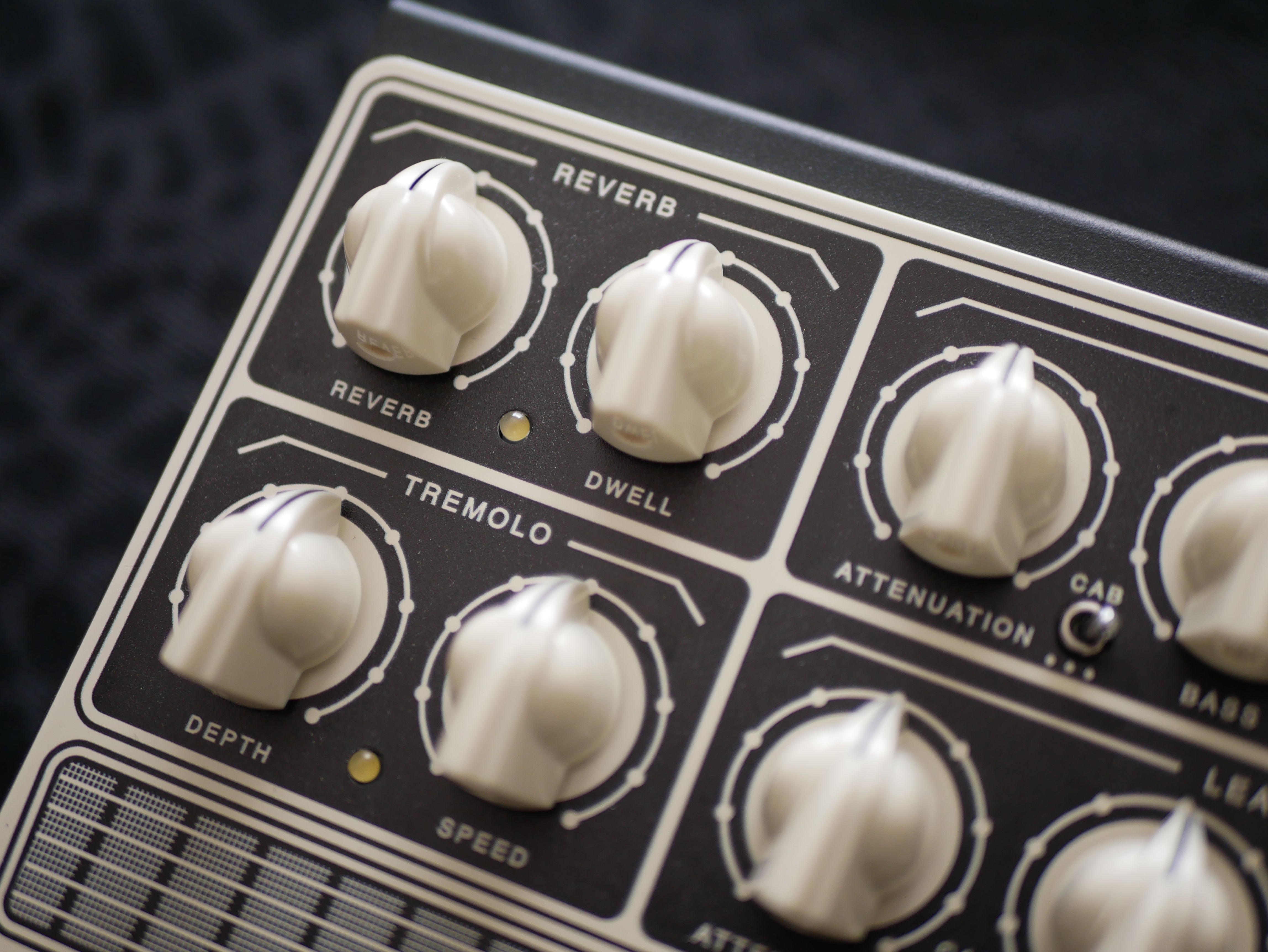 La surface supérieure accueille un ensemble de potentiomètres répartis en deux sections correspondant aux deux canaux de la pédale. Le canal RHYTHM s’inspire des combos blackface des années 60 et dispose de réglages Volume, Bass et Treble, tandis que le canal LEAD vise des sonorités plus typées tweed, avec les contrôles Volume, Tone et Mid-Bite, ce dernier permettant de resserrer les graves tout en ajoutant présence et gain. Chaque canal bénéficie également d’un potentiomètre Attenuation, permettant d’ajuster le niveau de sortie général tout en conservant le caractère du préampli, notamment en compensant certaines pertes dans les hautes fréquences.