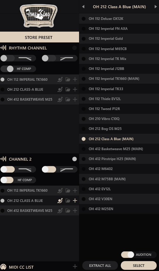 Concernant ce dernier point, il faut noter qu’il est possible de stocker et d’accéder directement depuis la pédale à trois IRs par canal. La bonne nouvelle, c’est que dans cet univers parfois un peu indigeste des réponses impulsionnelles, Tone King a eu la bonne idée de fournir une vingtaine d’IR OwnHammer, que j’ai trouvées particulièrement bien choisies et équilibrées. Bien entendu, il reste tout à fait possible d’importer ses propres fichiers (WAV de 44,1 à 96 kHz) ou encore de bypasser complètement cette section.