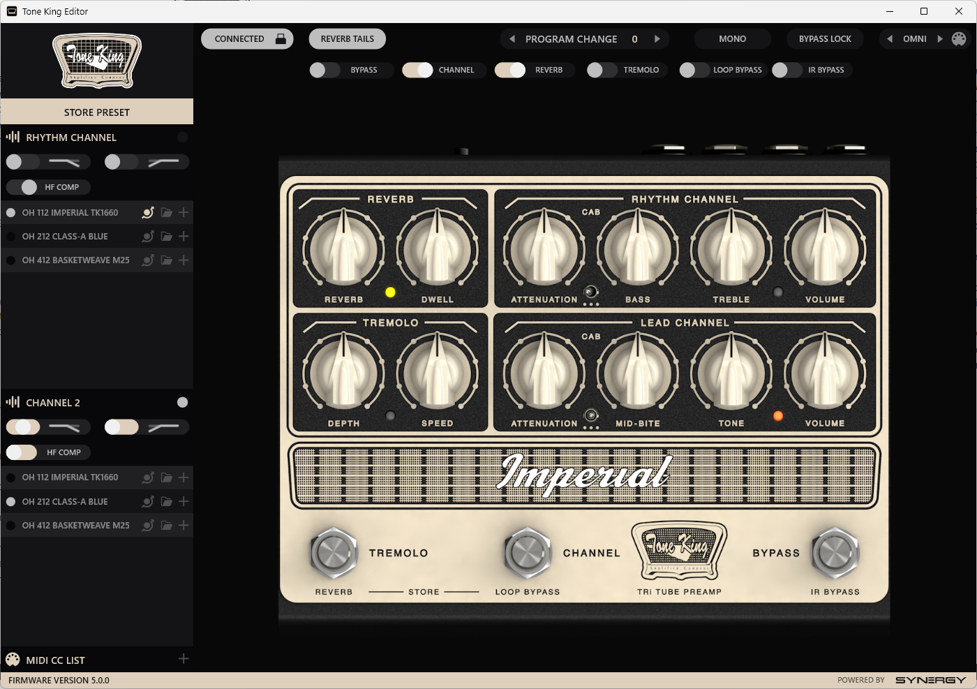 La pédale dispose également d’une application PC/Mac baptisée Tone King Editor, à laquelle on accède en connectant le préampli via le port USB-C. Cette dernière m’a semblé particulièrement réussie : la connexion est stable et immédiate, et l’interface reste claire et facile à comprendre.