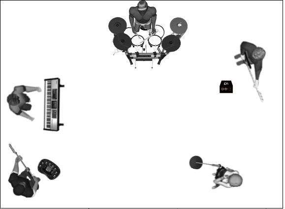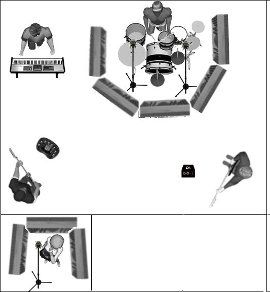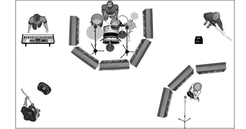 Si le groupe comporte un instrument acoustique, par exemple une guitare, vous devrez sûrement l’enregistrer a posteriori sous forme d’overdub. Si les autres musiciens ont besoin de l’instrument acoustique comme témoin pour enregistrer, utilisez une guitare électrique en prise directe pour le témoin. Vous enregistrerez la guitare acoustique définitive ultérieurement. Personnellement, j’éviterais d’utiliser une guitare acoustique dans la même pièce que la batterie parce qu’elle pourrait passer dans les micros du kit.