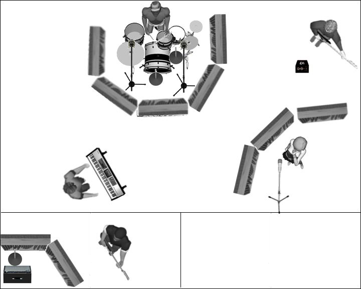 Voici une configuration comportant un seul lieu d’enregistrement. La basse et les claviers sont enregistrés en direct tandis que la guitare passe par une modélisation d’ampli. La prise de voix témoin est chantée aussi doucement que possible pour éviter qu’elle passe dans les micros de la batterie. |