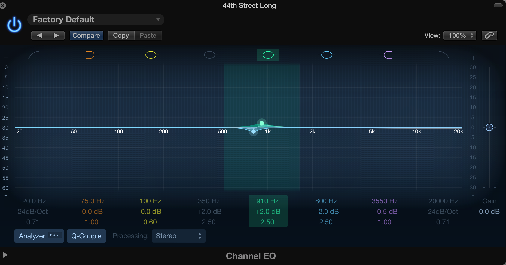 Tout d’abord, un grand classique que nous allons voir au moyen d’un exemple théorique pour faire simple. Supposons que vous ayez deux guitares jouant la même rythmique. Localisez la zone du spectre la plus chargée par ces deux guitares ; pour notre exemple, disons qu’il s’agit d’une zone tournant autour des 800 Hz. Sur l’une d’entre elles, atténuez légèrement cette fréquence (ici −2 dB à 800 Hz avec un Q de 2.5) au moyen d’un filtre en cloche. Ajoutez alors un deuxième filtre en cloche et amplifiez d’autant de décibels que vous avez atténués, avec la même largeur de bande, mais à une fréquence située juste en dessous ou juste au-dessus de la fréquence d’atténuation. Pour notre exemple, nous dirons +2 dB à 920 Hz. Maintenant, appliquez une égalisation strictement inverse sur l’autre guitare. Dans notre cas, cela donne +2 dB à 800 Hz et −2 dB à 920 Hz, toujours avec un facteur Q de 2.5. Vous devriez alors obtenir deux instruments bien articulés et ne se gênant plus l’un l’autre.
