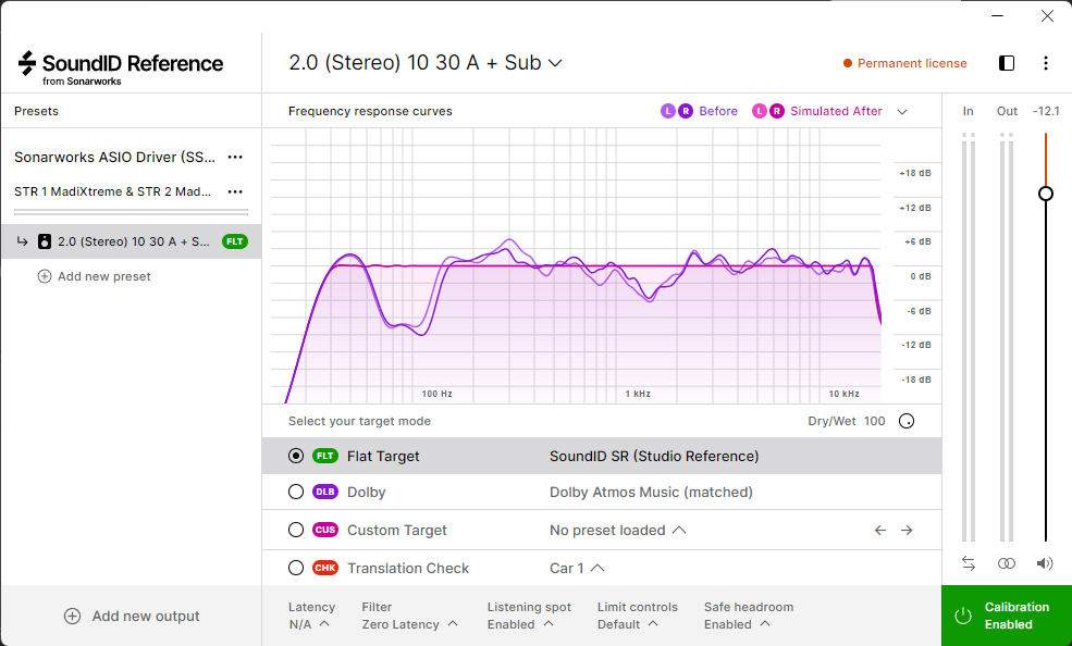 Nous avons donc procédé à deux mesures de notre paire de moniteurs. La première a été faite sans le caisson de graves, et la deuxième avec, afin d’évaluer le produit dans toutes ses capacités. Le réglage préalable du sub, tant en termes de niveau que de fréquence de coupure, n’est pas particulièrement mentionné dans SoundID.