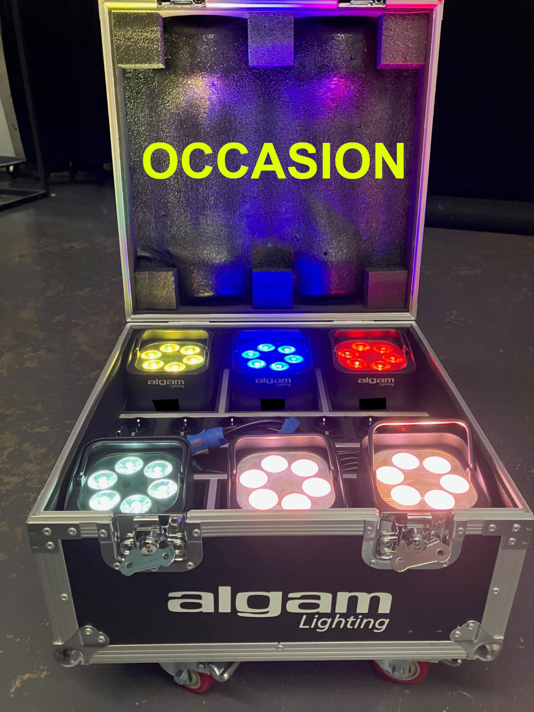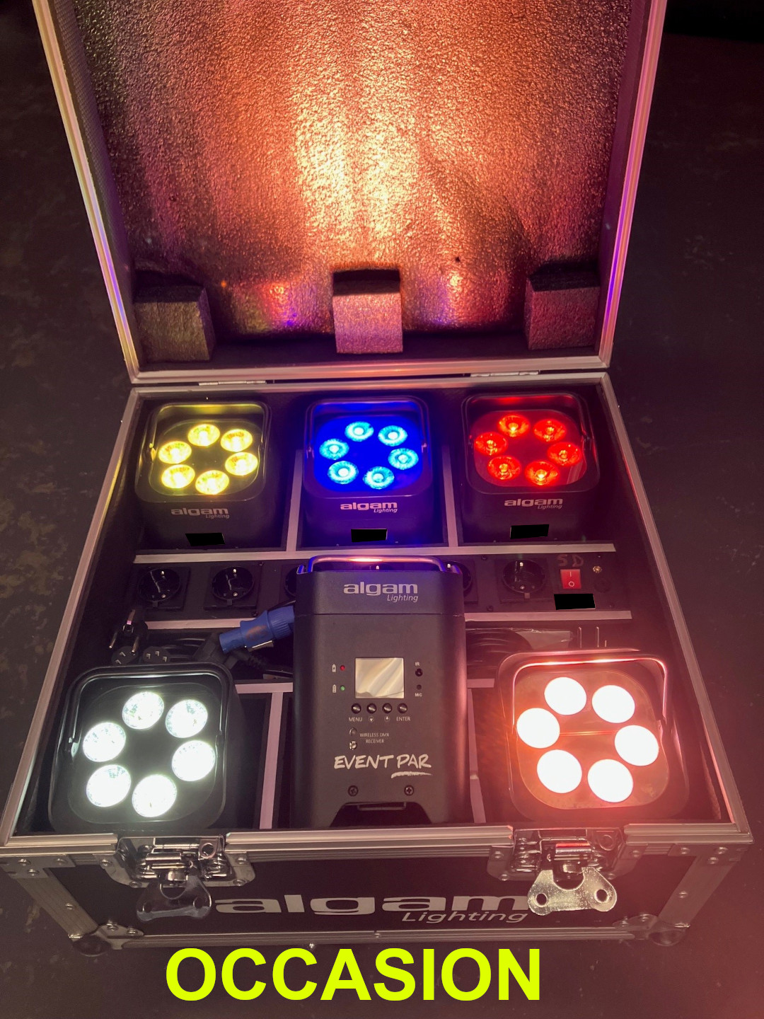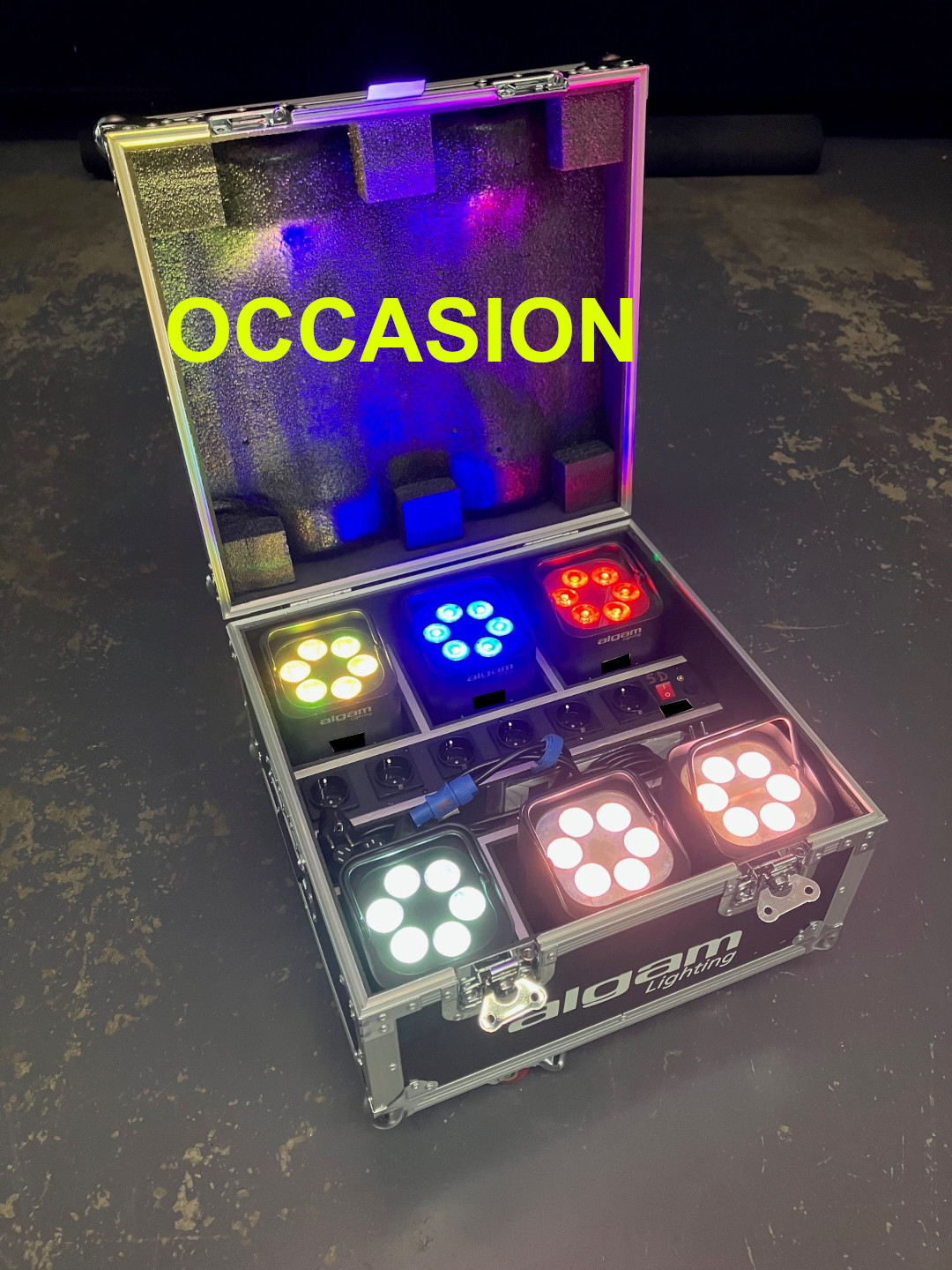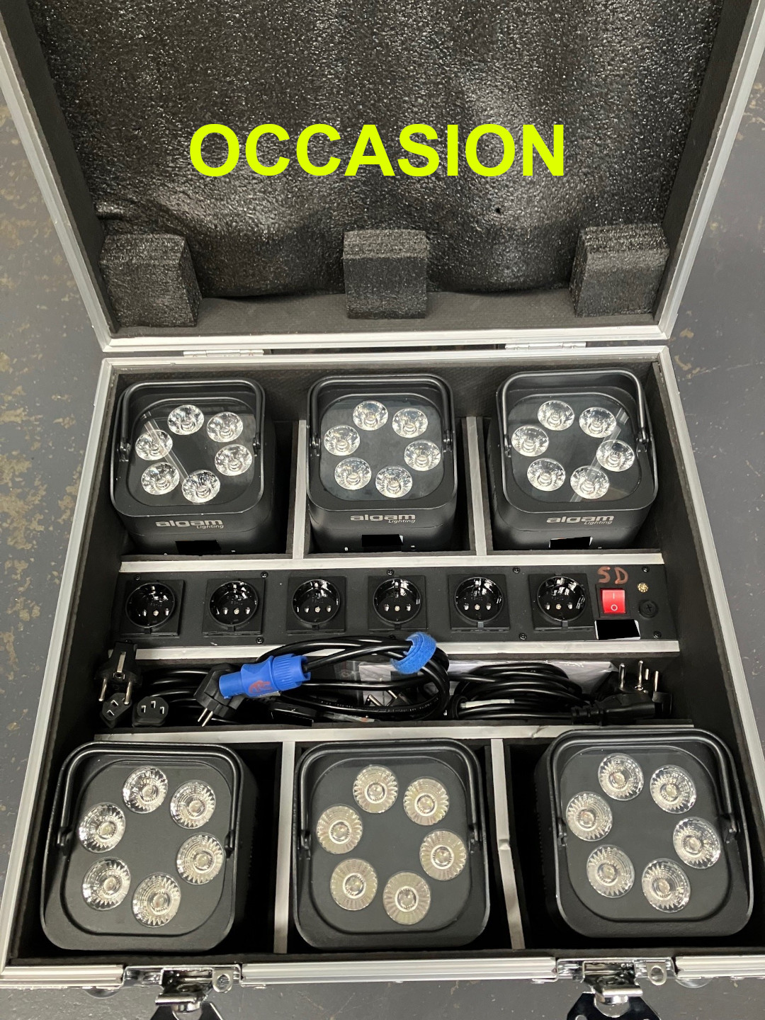 Vends d'occasion Kit composé de 6x PAR LED sur batterie Algam Lighting Event Par + Flight-Case chargeur sur roulettesQuelques traces d'utilisations