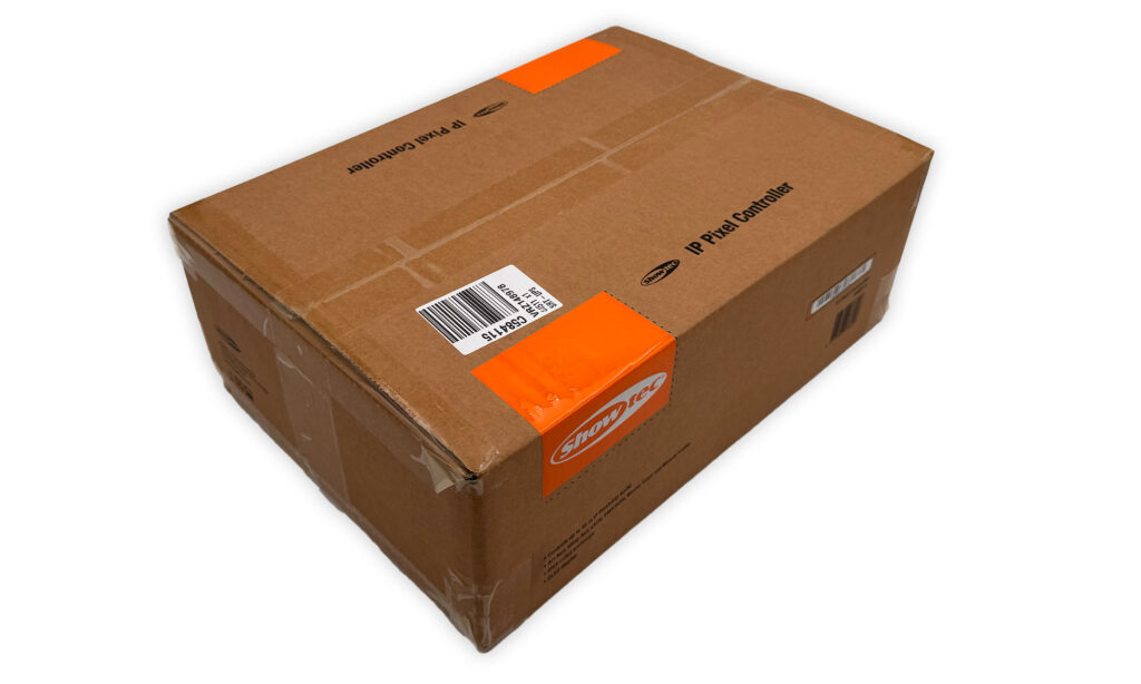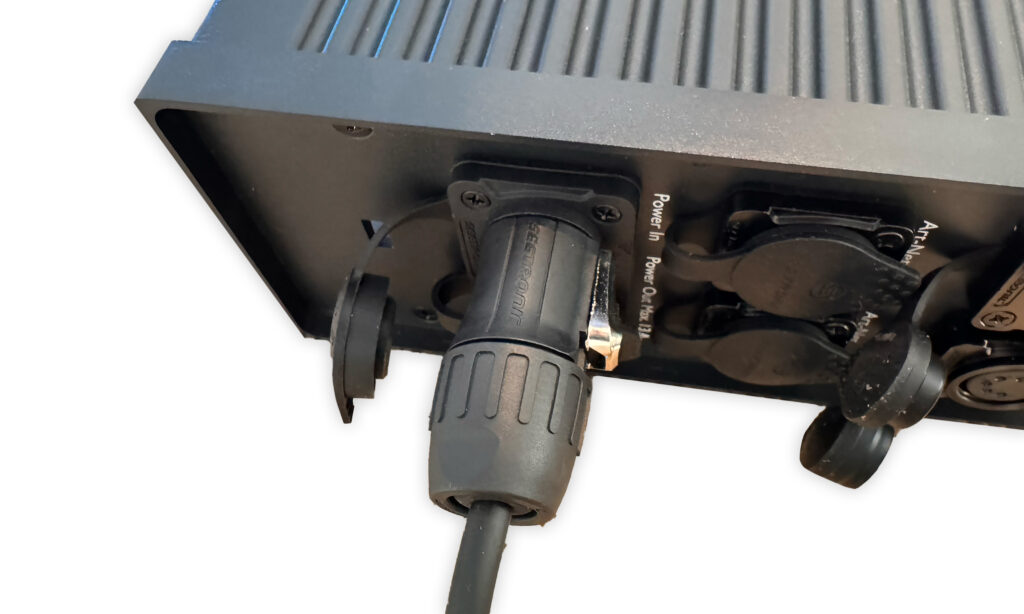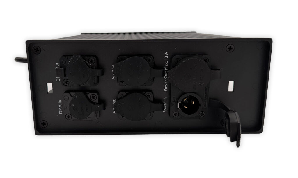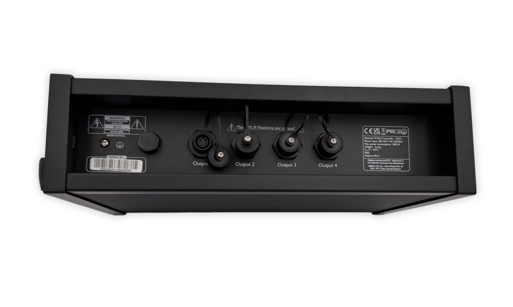 Le système de refroi­dis­se­ment passif garan­tit un fonc­tion­ne­ment silen­cieux. Le contrô­leur four­nit une tension de sortie de 48V avec une consom­ma­tion maxi­male de 500 watts et est équipé d’en­trées et de sorties Power Twist TR1. D’un côté se trouvent toutes les entrées et sorties pour les signaux de contrôle. De l’autre côté se trouvent quatre sorties d’ali­men­ta­tion permet­tant de connec­ter diffé­rents groupes de Pixel­strips en série. Il mesure 89 × 219 × 322 mm et pèse 5 kg, et reste donc suffi­sam­ment compact pour une utili­sa­tion mobile, tout en étant assez puis­sant pour des instal­la­tions de plus grande enver­gure. Le contrô­leur est fourni avec un support Omega et un câble d’ali­men­ta­tion TR1. Cepen­dant, les rallonges ne sont pas incluses dans l’em­bal­lage. Elles doivent être ache­tées sépa­ré­ment si néces­saire.