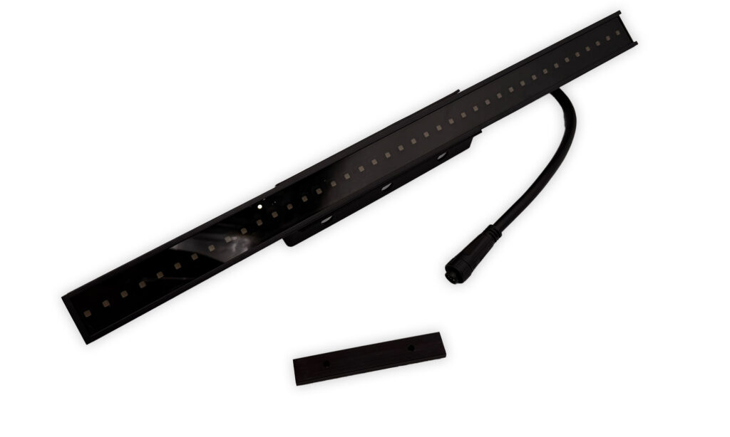 La face avant est domi­née par l’en­semble de LEDs, qui sont montées de série derrière un panneau en plexi­glas teinté. Ce panneau est remplaçable en déver­rouillant le côté et en le tirant hors du rail de guidage. Toutes les LEDs sont instal­lées de façon perma­nente et proté­gées des intem­pé­ries par un joint en plas­tique. Les Pixel­strips arborent une fini­tion noir mat clas­sique. Outre une construc­tion en métal rigide, un revê­te­ment en poudre confère aux châs­sis une appa­rence soignée et une protec­tion supplé­men­taire.