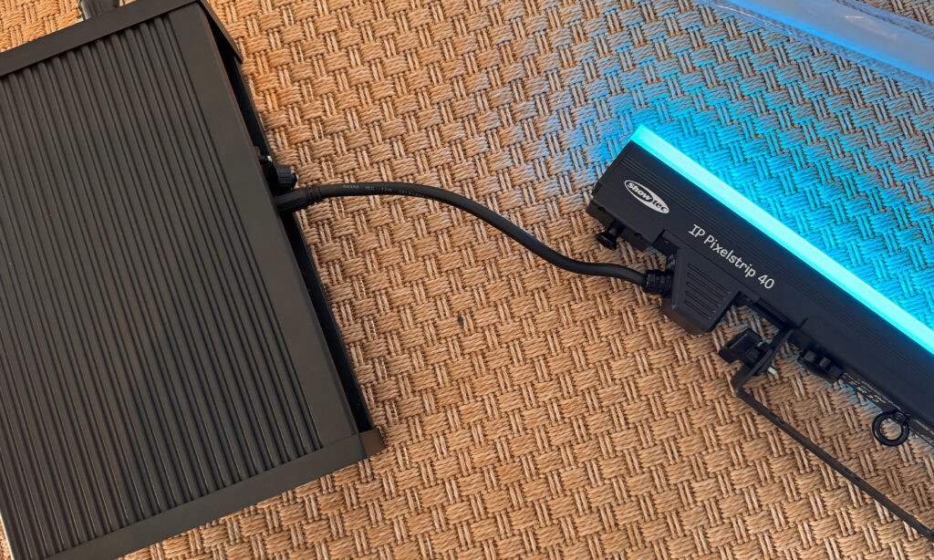 La mise en route est d’une simpli­cité enfan­tine : bran­chez le contrô­leur sur une prise secteur (il n’y a pas de bouton marche/arrêt) et il démar­rera instan­ta­né­ment. On installe un câble pour relier la sortie à la première barre, et le tour est joué : le Pixel­strip s’al­lume et commence immé­dia­te­ment à émettre de la lumière. Aucun temps de démar­rage, aucune attente. Le seul incon­vé­nient : le câble d’ali­men­ta­tion des barres est extrê­me­ment court. Sur une scène où la prise de courant est éloi­gnée, l’uti­li­sa­tion de rallonges sera donc abso­lu­ment indis­pen­sable.