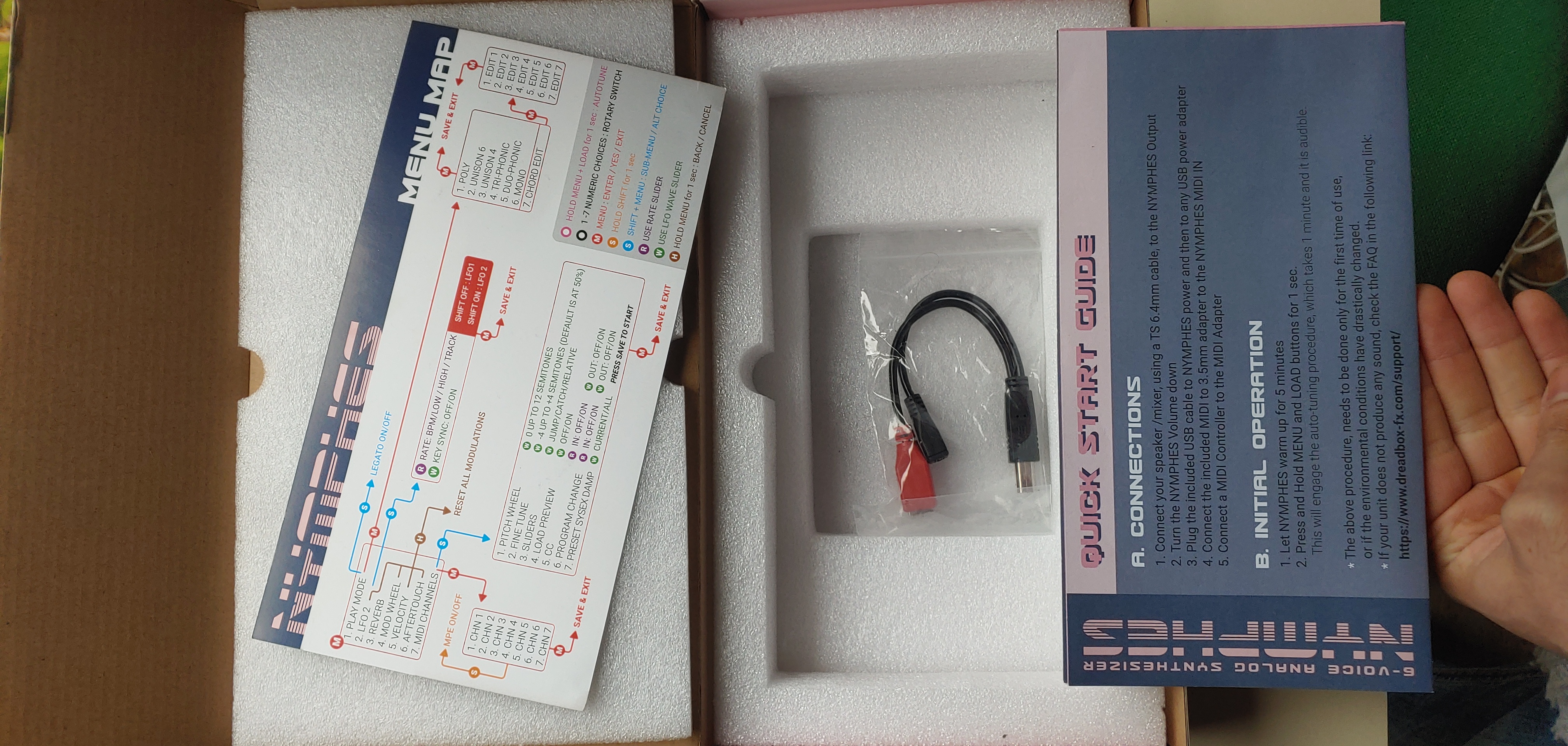 Avec boite d'origine, cable d'alimentation usb double, adaptateur mini jack vers midi din et manuel