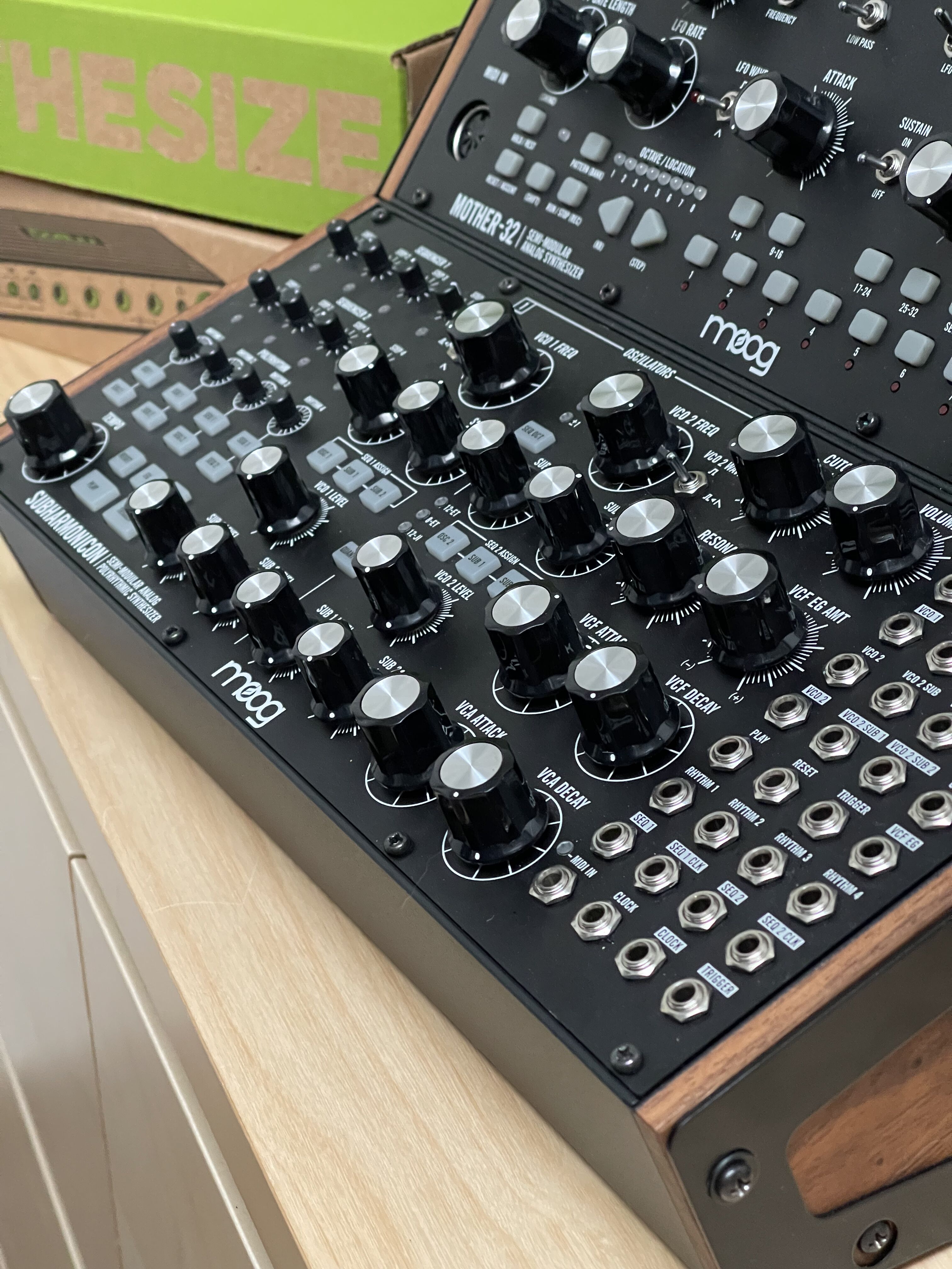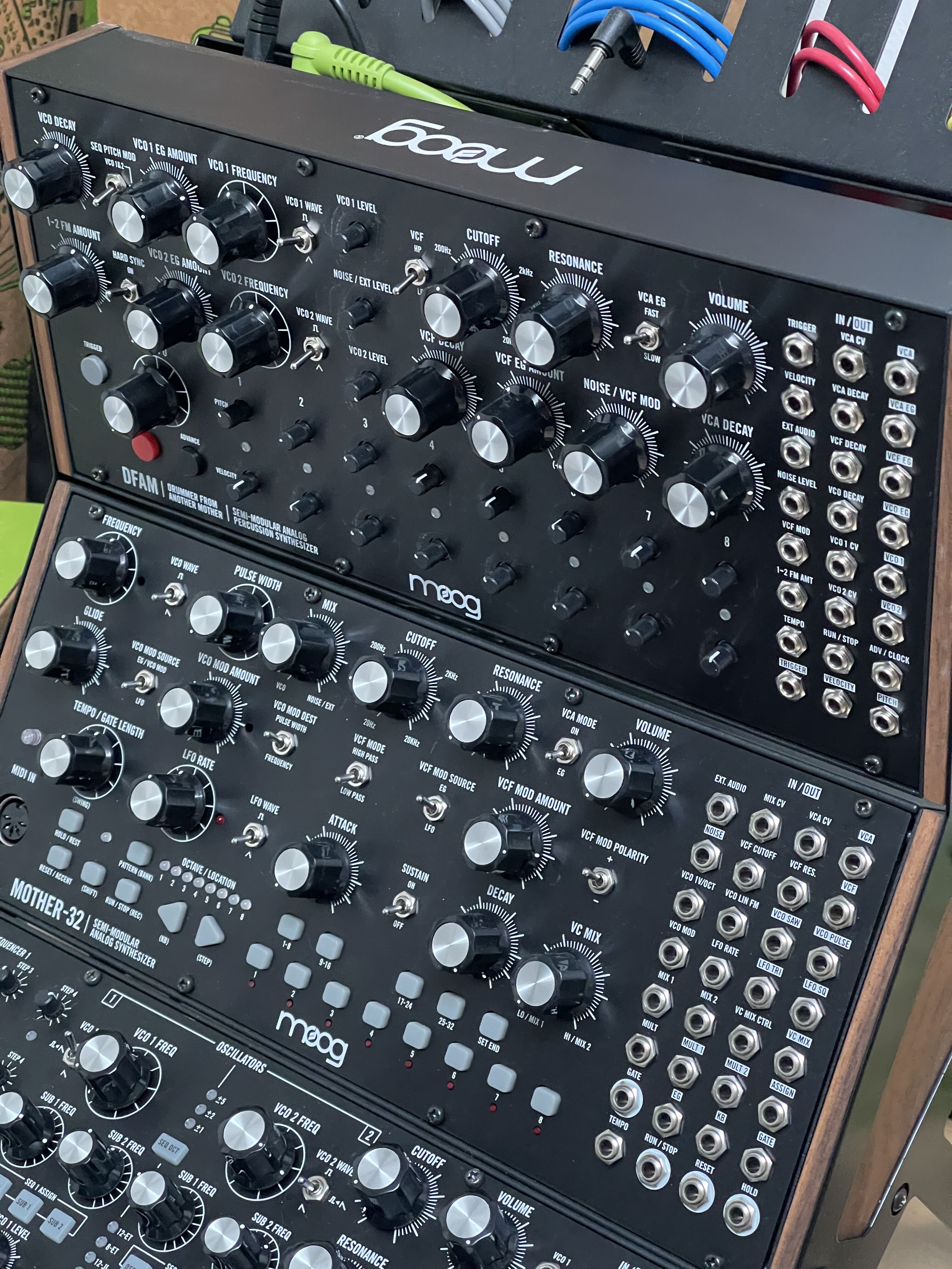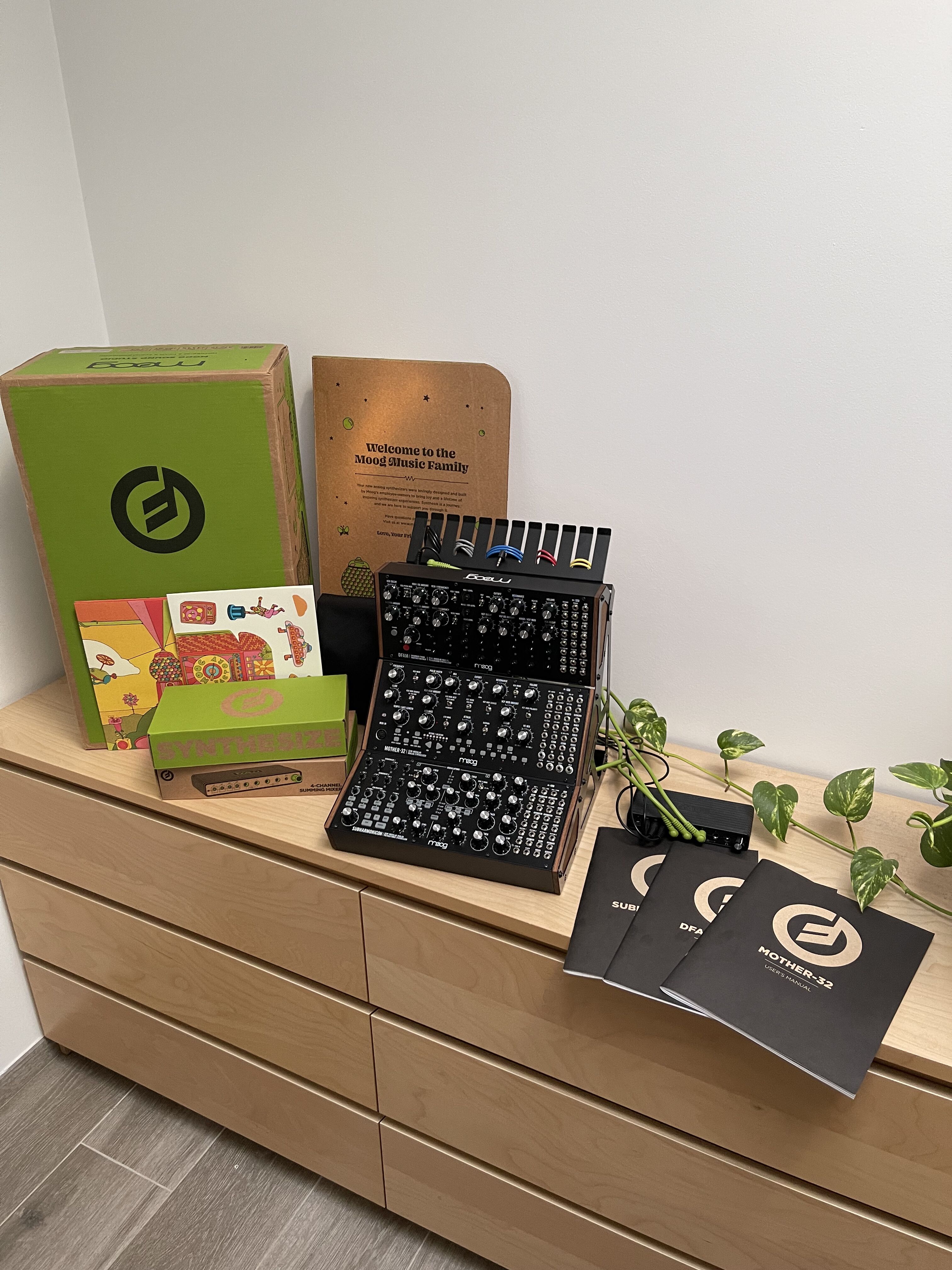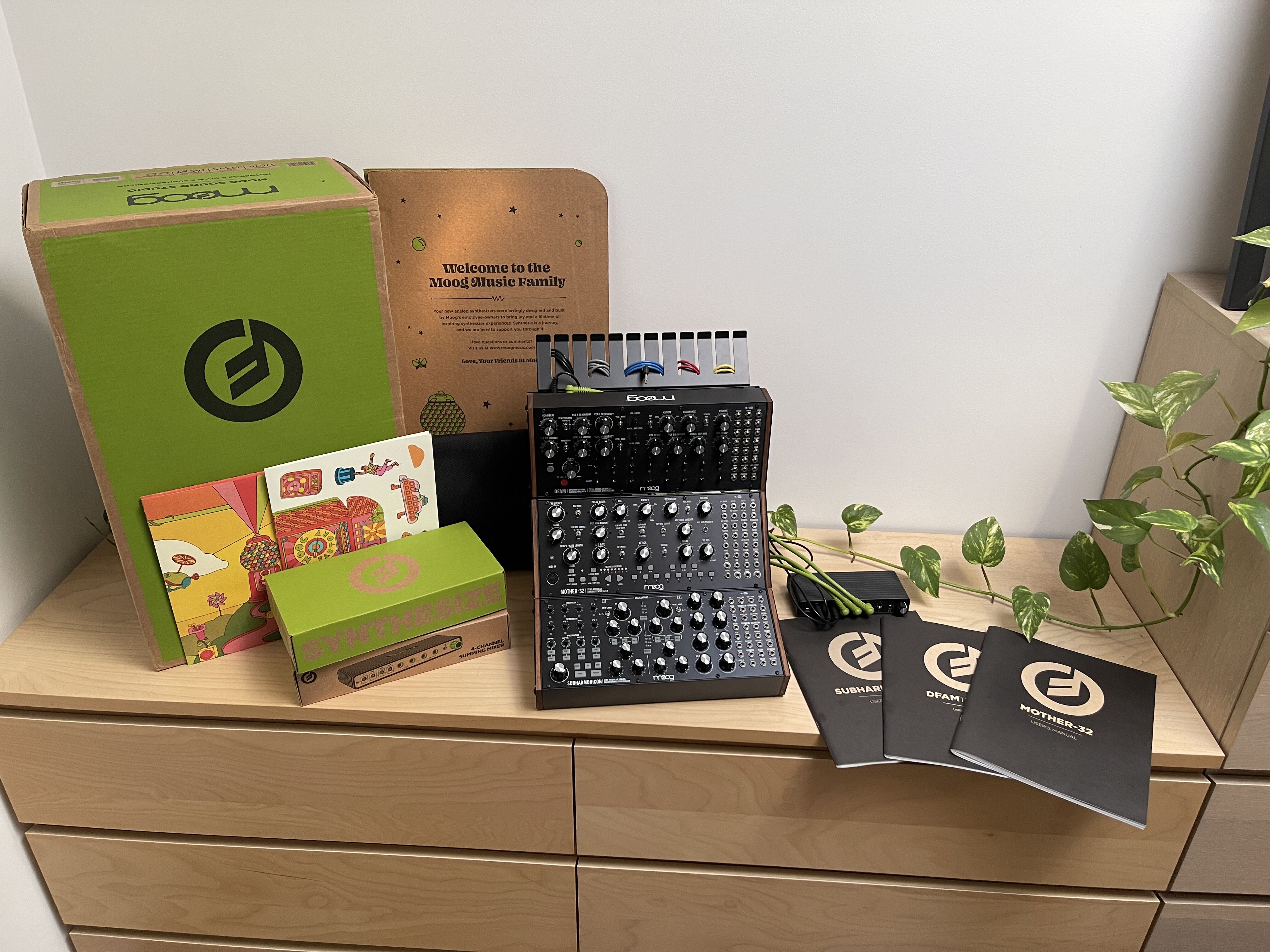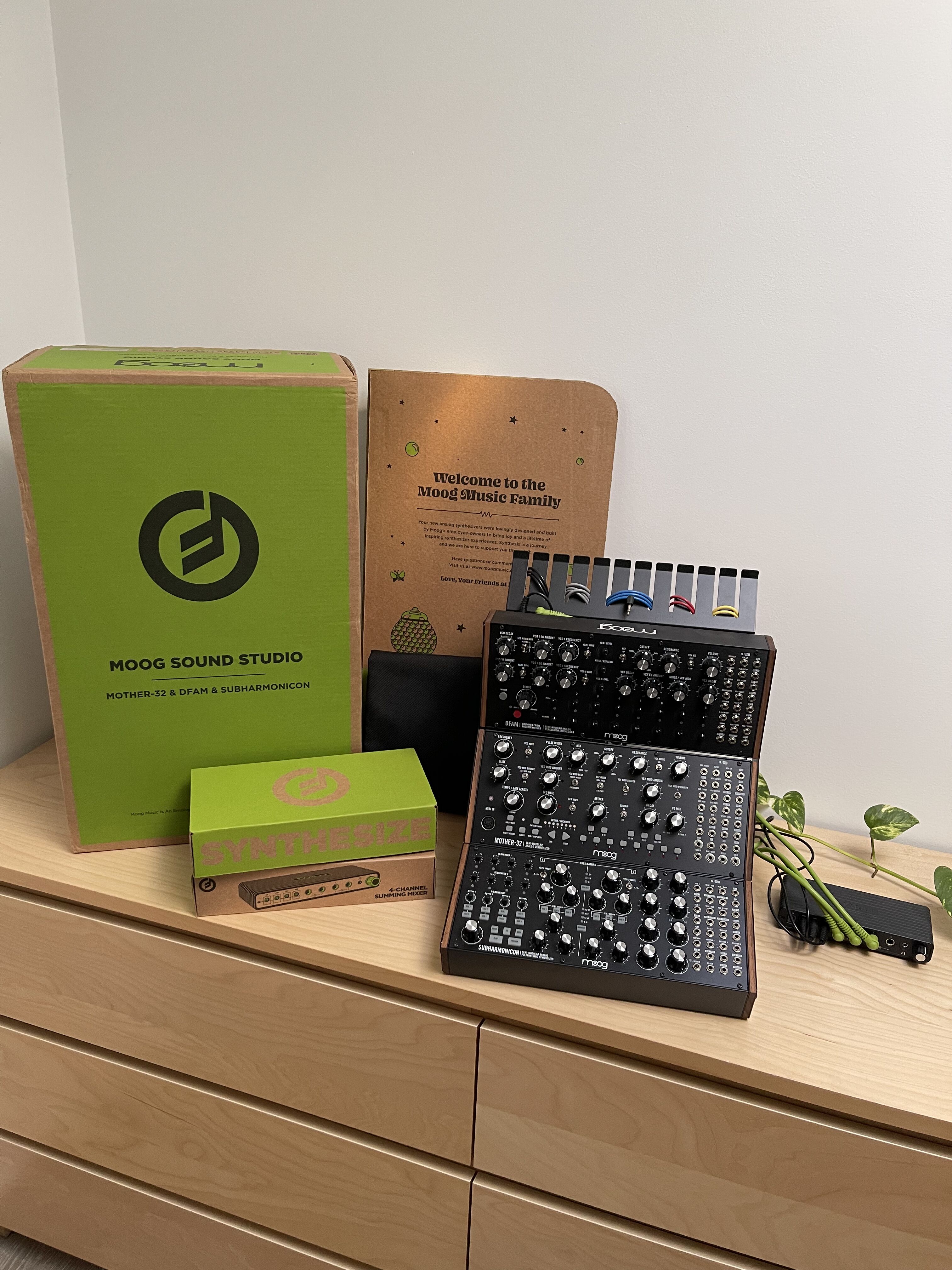 Moog Sound Studio 3 (Mother-32, Subharmonicon, DFAM) en parfait état, avec mixeur, patch cables, boîte originale et goodies.