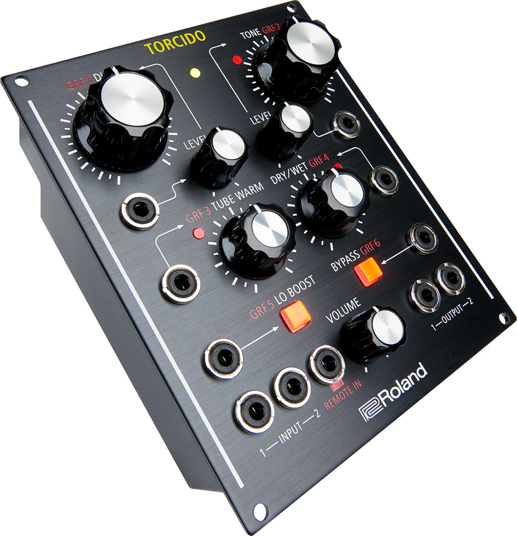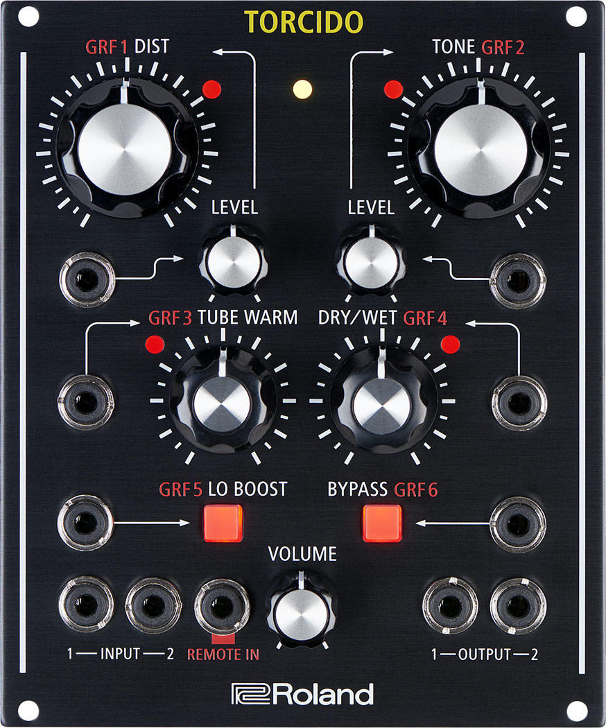 - Torcido reproduit le son de distorsion classique de Roland avec des contrôles CV/Gate de la quantité de distorsion, la tonalité et la « chaleur de la lampe ».