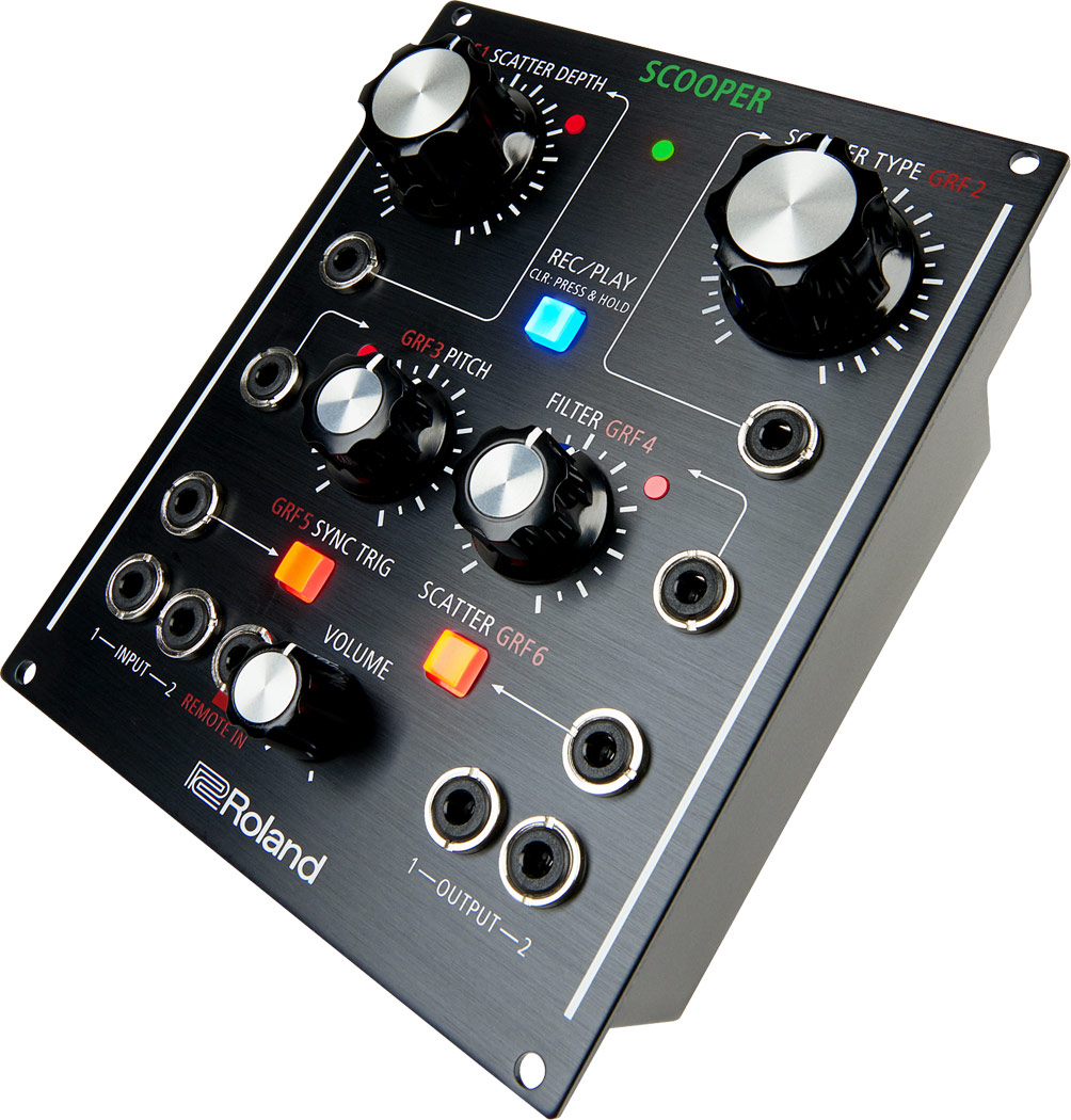 - Scooper combine un looper single-pass et un effet de scatter, et vous pourrez régler la profondeur/type de scatter, le pitch et le filtre par CV/Gate