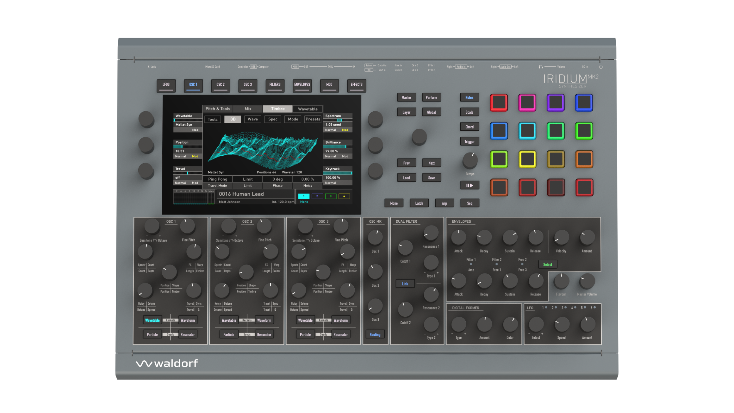 L’Iridium MK2 est un synthétiseur de bureau édité par Waldorf, successeur de l’Iridium sorti en 2020, et qui s’inscrit dans la lignée de l’architecture multimoteur des gammes Quantum et Iridium. Cette nouvelle génération embarque un processeur renouvelé avec une RAM et une mémoire flash étendues, ce qui élargit la capacité d’échantillonnage et ouvre la voie à de nouvelles possibilités de synthèse. Le design de l’appareil a également été revu.