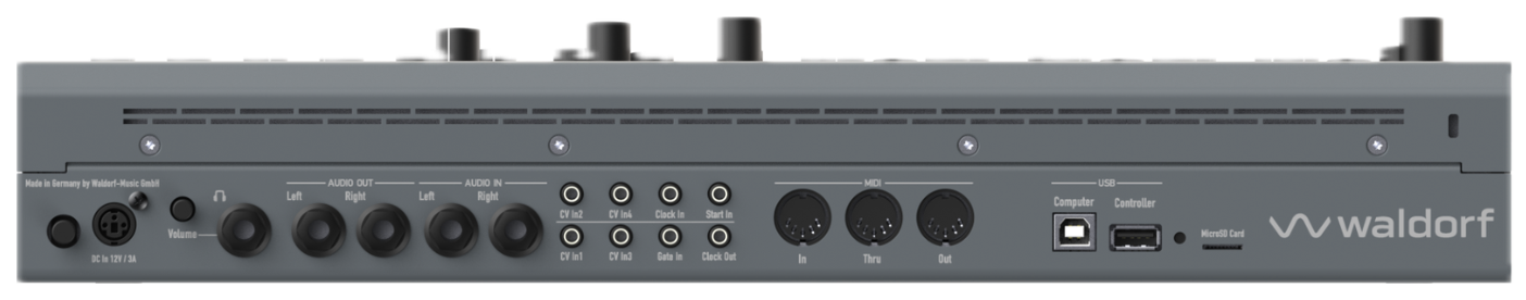 - Connectique : sorties/entrées audio stéréo TS, casque TRS, DIN MIDI In/Out/Thru, USB-B, USB-A, 4 entrées CV, horloge analogique In/Out, gate et start analogiques, port microSD