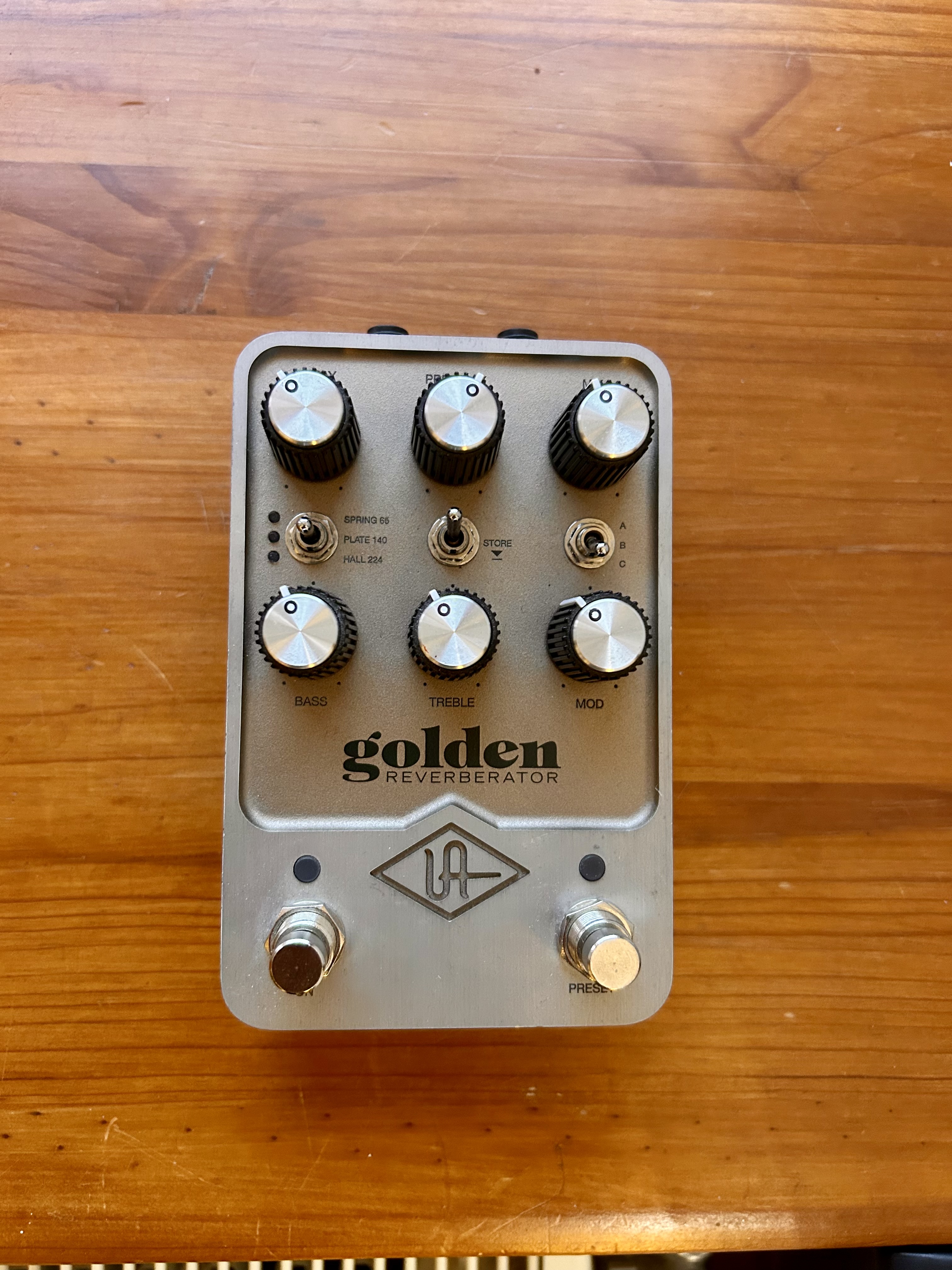 Passé cette étape on peut enfin savourer. La pedale pour moi est posée sur le bureau, les potards répondent très bien, les réglages sont précis et immédiat c’est tres agréable, on entend bien les différences de texture des reverbs et c’est vrai que le bouton modulation est un régale, il apporte encore plus de chaleur, me rappelle ma vieille Lexicon pcm80 qui avait un son bien tordu mais chaud. Finalement je suis content qu’ il n y ai pas 360 réglages possibles car c’est deja vaste ( certains reprochent à UA le fait de ne pas avoir fait 1 seule pedale au lieu des 6 existantes ) ( il se passerai quoi d’ ailleurs si on mettait le firmware d’ une autre pedale ? Pas possible, UA a bien verrouillé avec son logiciel ( qui chez moi a bugué plusieurs fois ( peut-être le câble ? )))