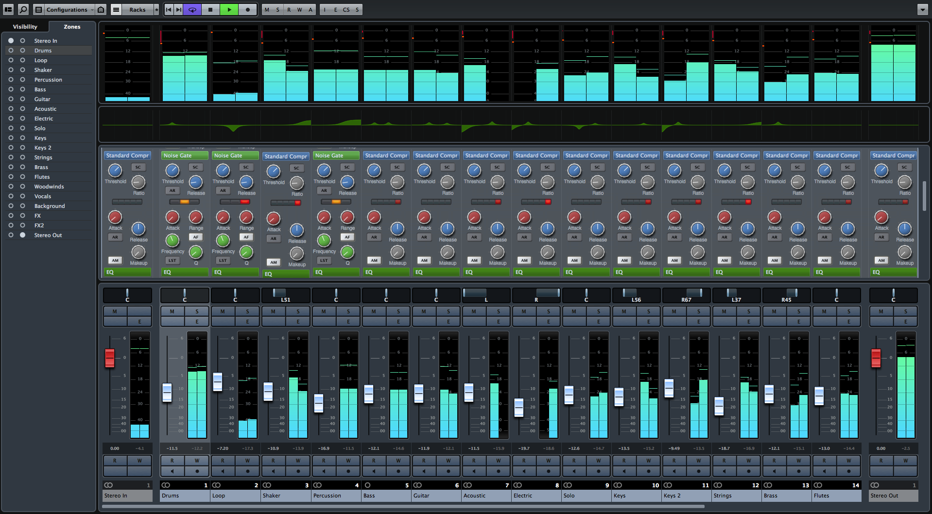 - Nouveaux Wave Meters qui affichent la forme d’onde des évènements audio à venir et défilent dans le mixer au-dessus du fader de volume