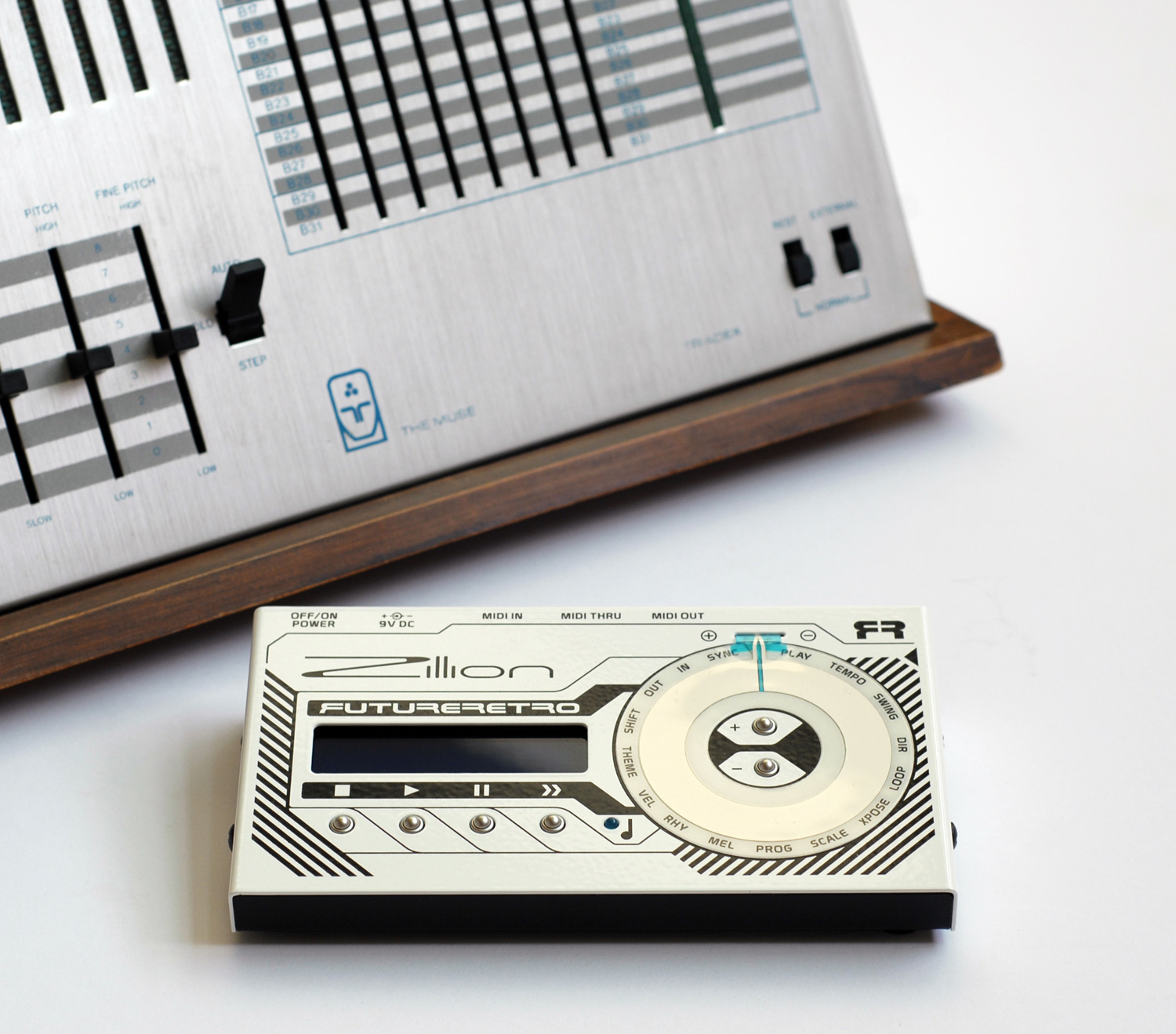 Le séquenceur comprend également 4 touches de contrôle de la lecture (lecture, stop, pause et avance par pas), d’un indicateur lumineux pour le tempo et d’un écran.