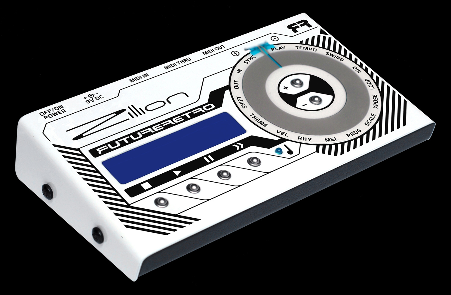 Zillion est un séquenceur MIDI algorithmique une piste offrant 16 modes d’opération : Playback, Tempo, Swing, Direction, Loop, Transpose, Scale, Scale Program, Melody, Rhythm, Velocity, Theme, Shift Register, MIDI OUT, MIDI IN, et Sync. Vous choisirez l’un de ces modes via un molette tactile.