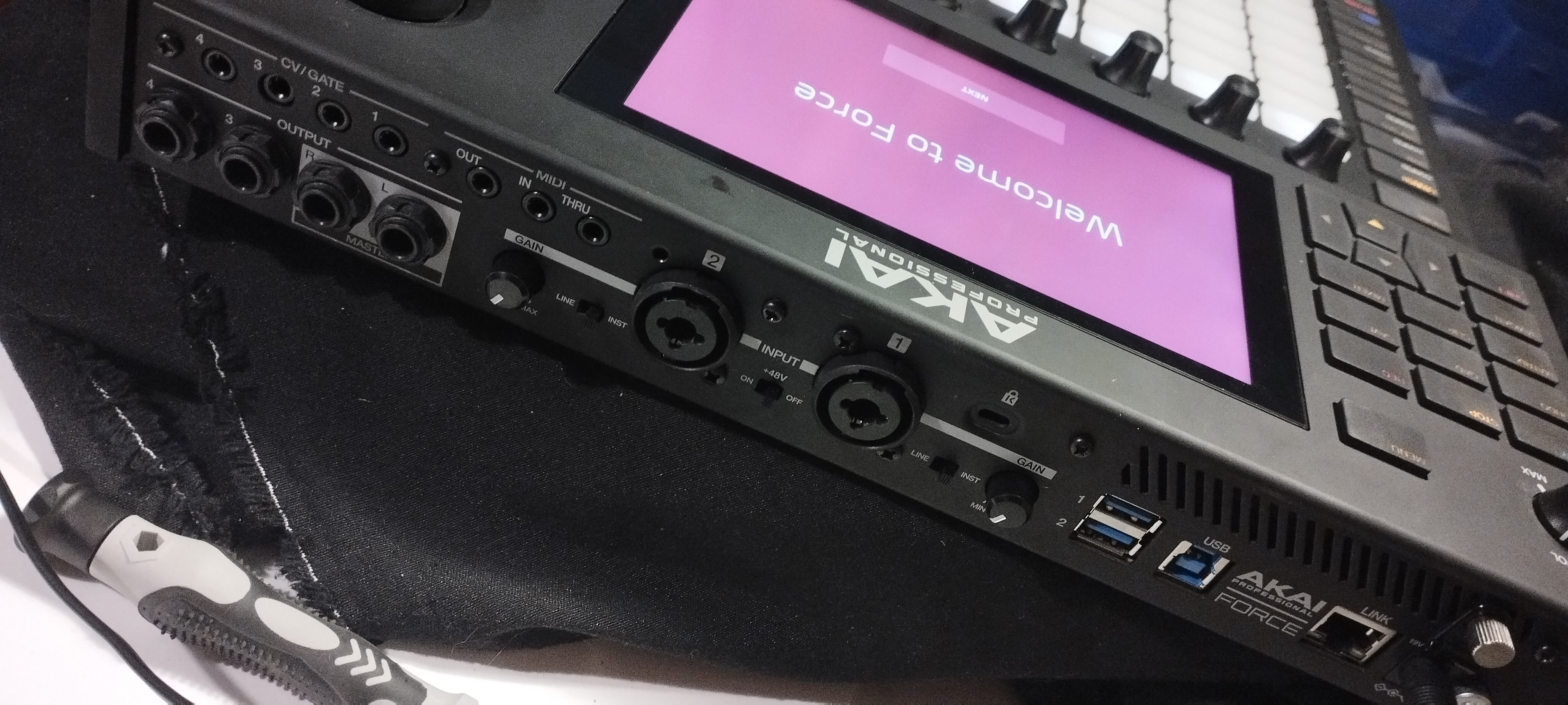 Akai force en parfait état avec flight case. Complet, accessoires, alim, boîte. Blister sur écrans encore présents. La machine est comme neuve.