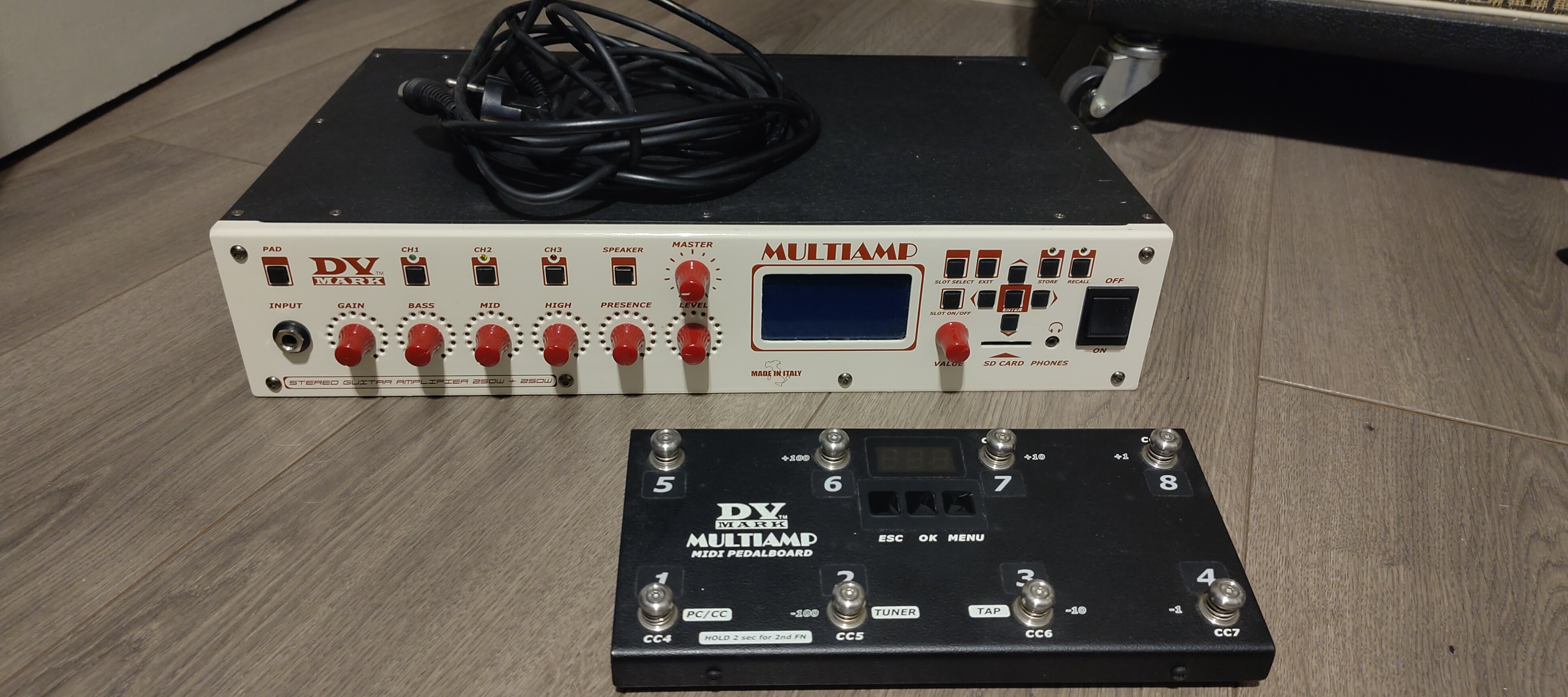 Je vends ce DV MARK MULTIAMP avec son pédalier midi et les câbles (alimentation et midi) en très bon état. Il contient de nombreuses simulations d'ampli et tous les effets auxquels vous pourriez penser.Le pédalier vous permet de programmer ce que vous désirez en contrôle midi pour piloter vos simulations d'ampli, effets, etc.