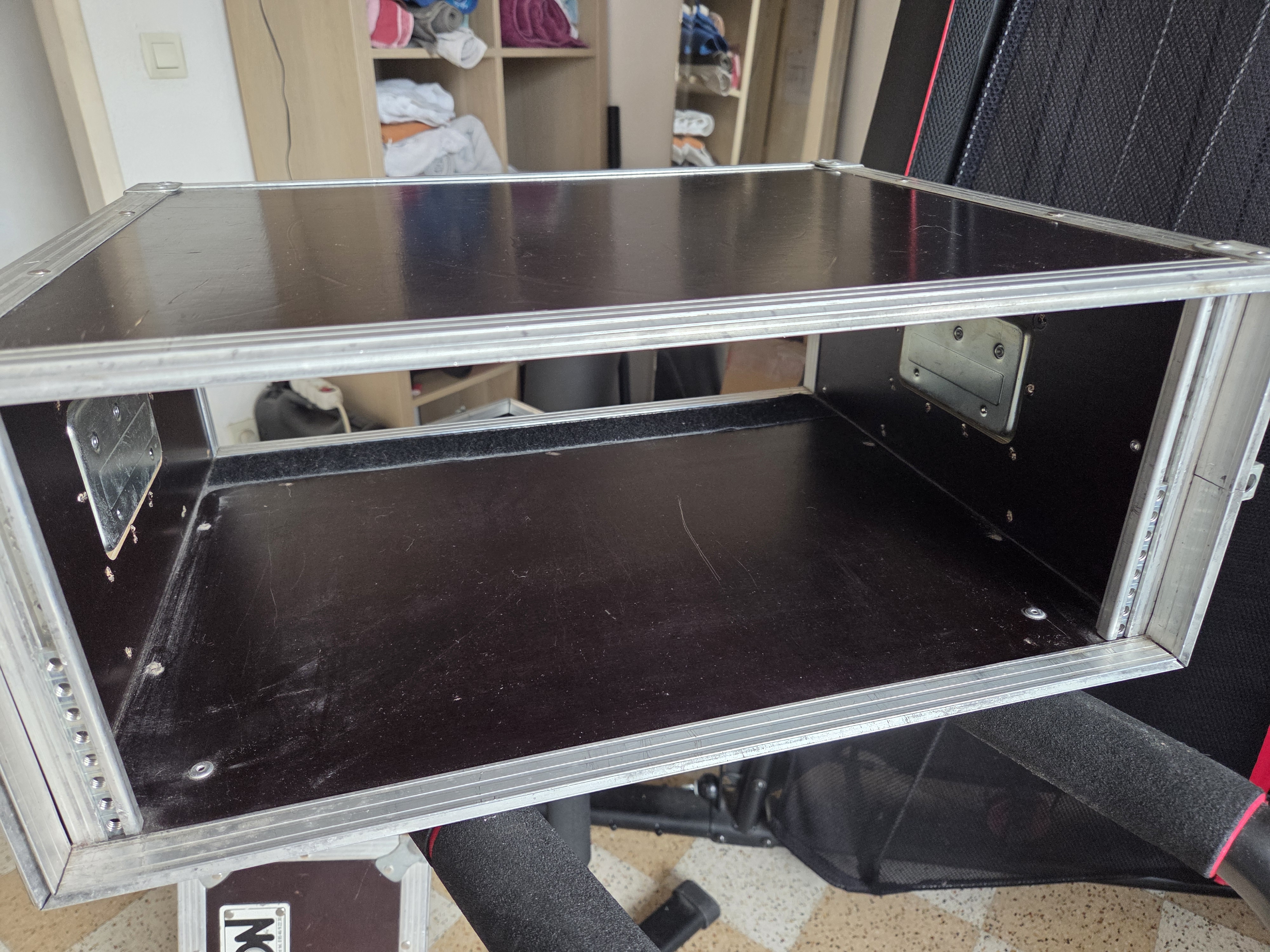 Je cède ce fly case 4U, acheté il y a de longues années avec une tête d’ampli qui vient de rendre l’âme.Les pieds en dessous ont été en partie découpés par le précédent utilisateur (voir photo) et il a un peu bougé, mais il n’y a aucune faille ou fente dans le bois. L’armature, les charnières et les poignets sont costauds, nickels.