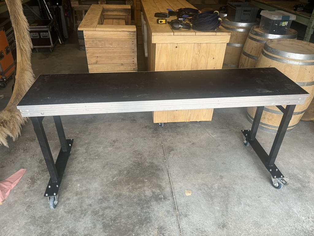 Ensemble composé d'un praticable de scène 200 x 50 cm avec châssis sur roue hauteur total 88 cm, idéal pour créer une régie DJ mobile assez compacte.