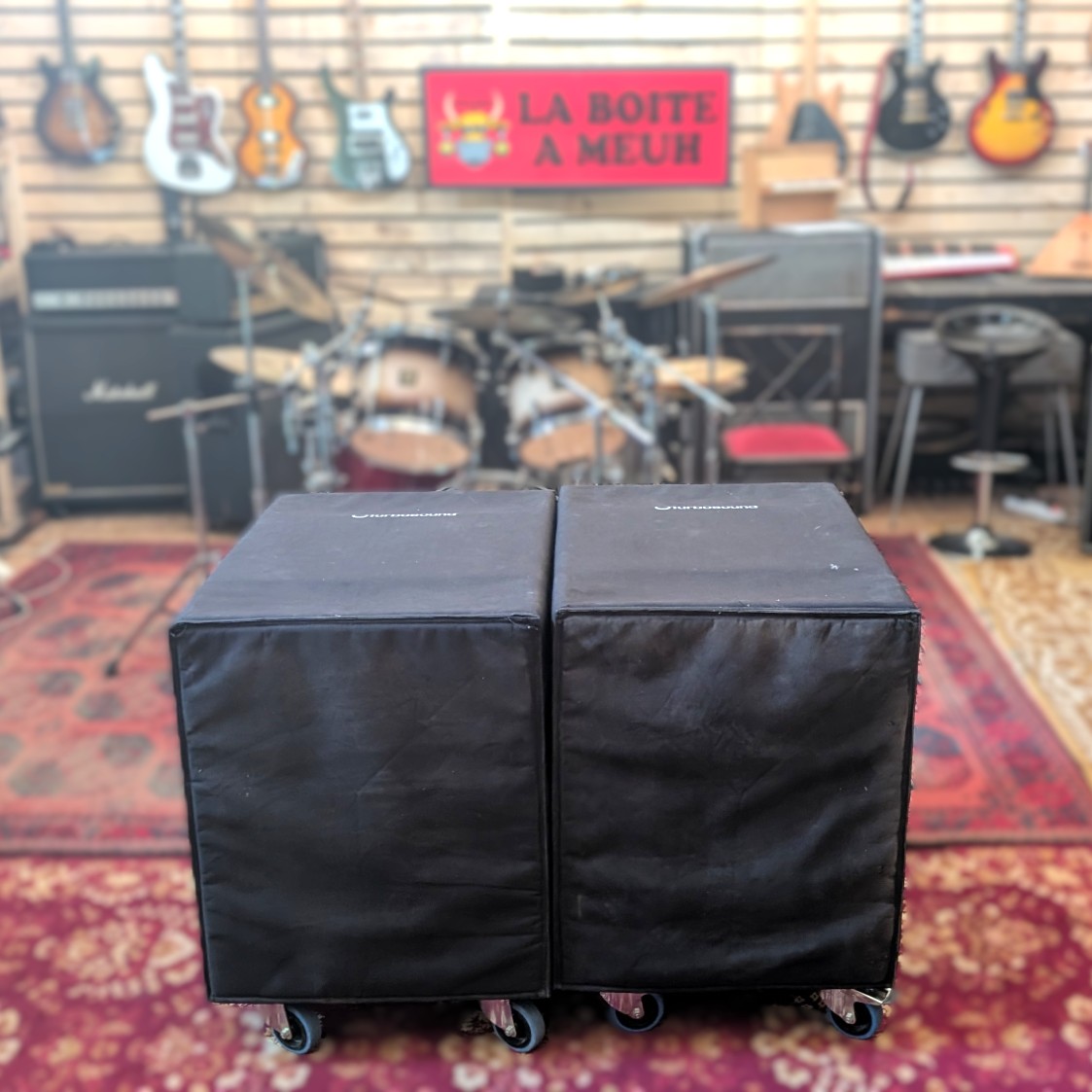 Le studio La Boîte à Meuh vend deux subs Turbosound Nuq-118B An d’occasion 1400€ la paire avec les housses.Ce sont des subs amplifiés avec un haut-parleur 18″