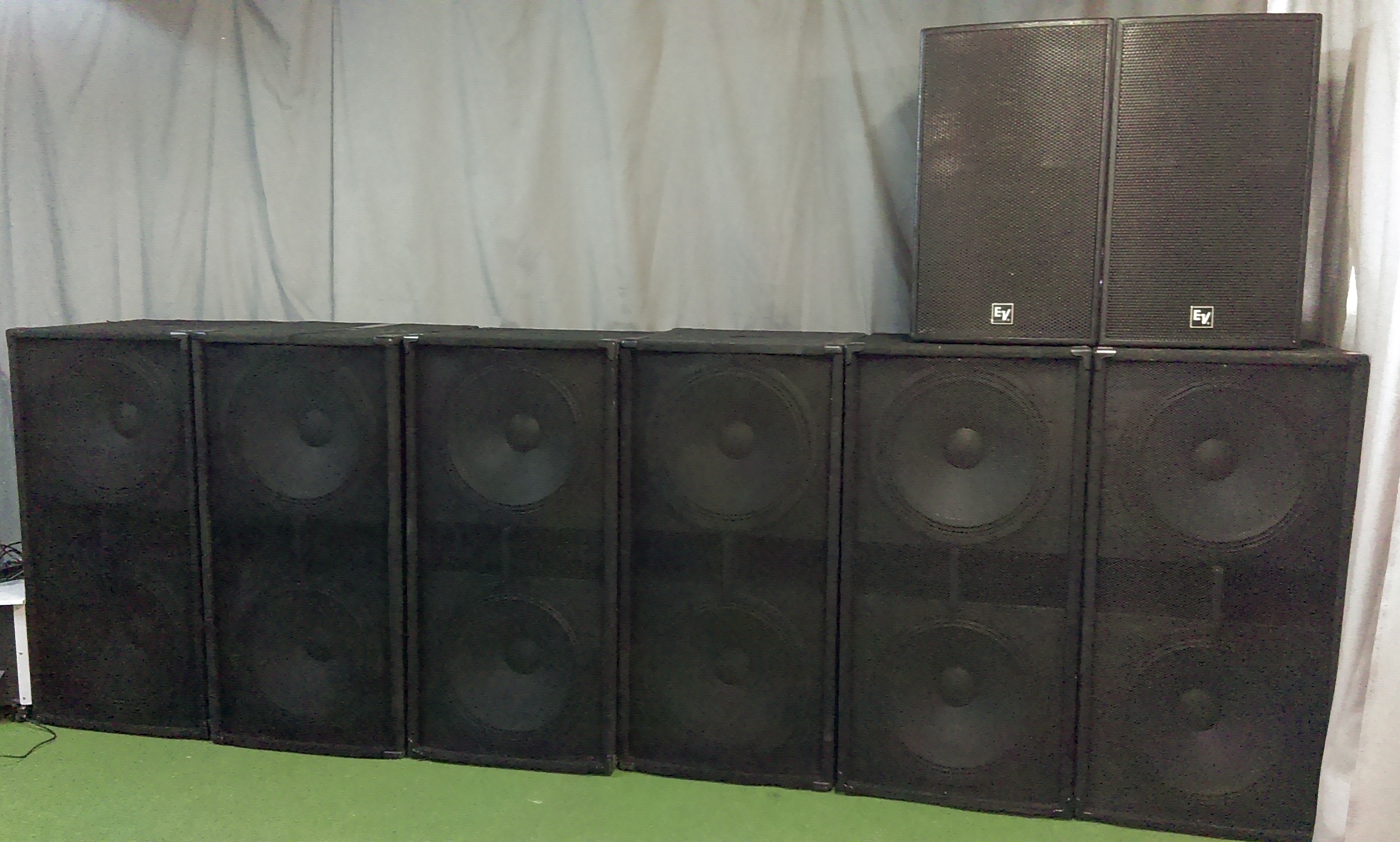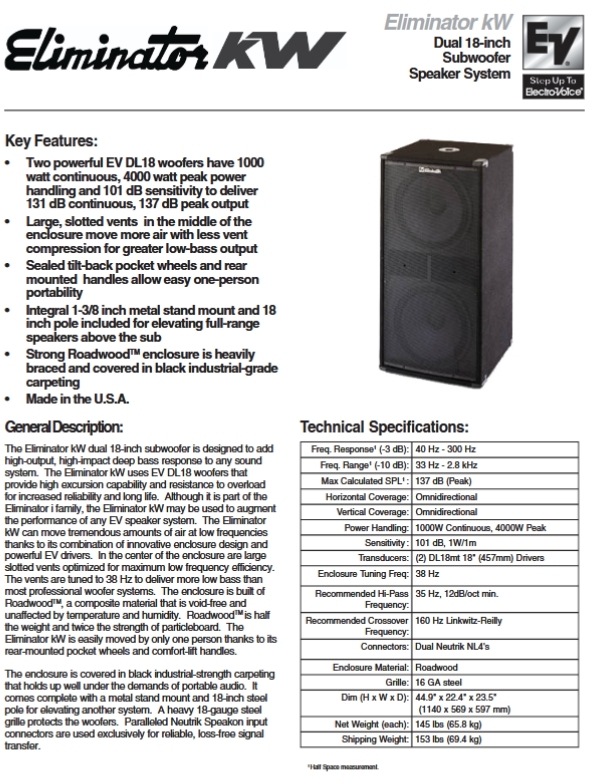 Je vends 4 caissons de basse Electro-Voice, Eliminator kw1000, par paire ( mais le prix est pour 1 seul ).une partie de la doc est jointe et elle est facile à trouver sur le net. Les caissons disposent de 2 roulettes intégrées dans le caisson ce qui permet de déplacer les caissons à la manière d'un diable à roulette. Connexion par speakon, possibilité de les brancher en série par connecteur XLR.