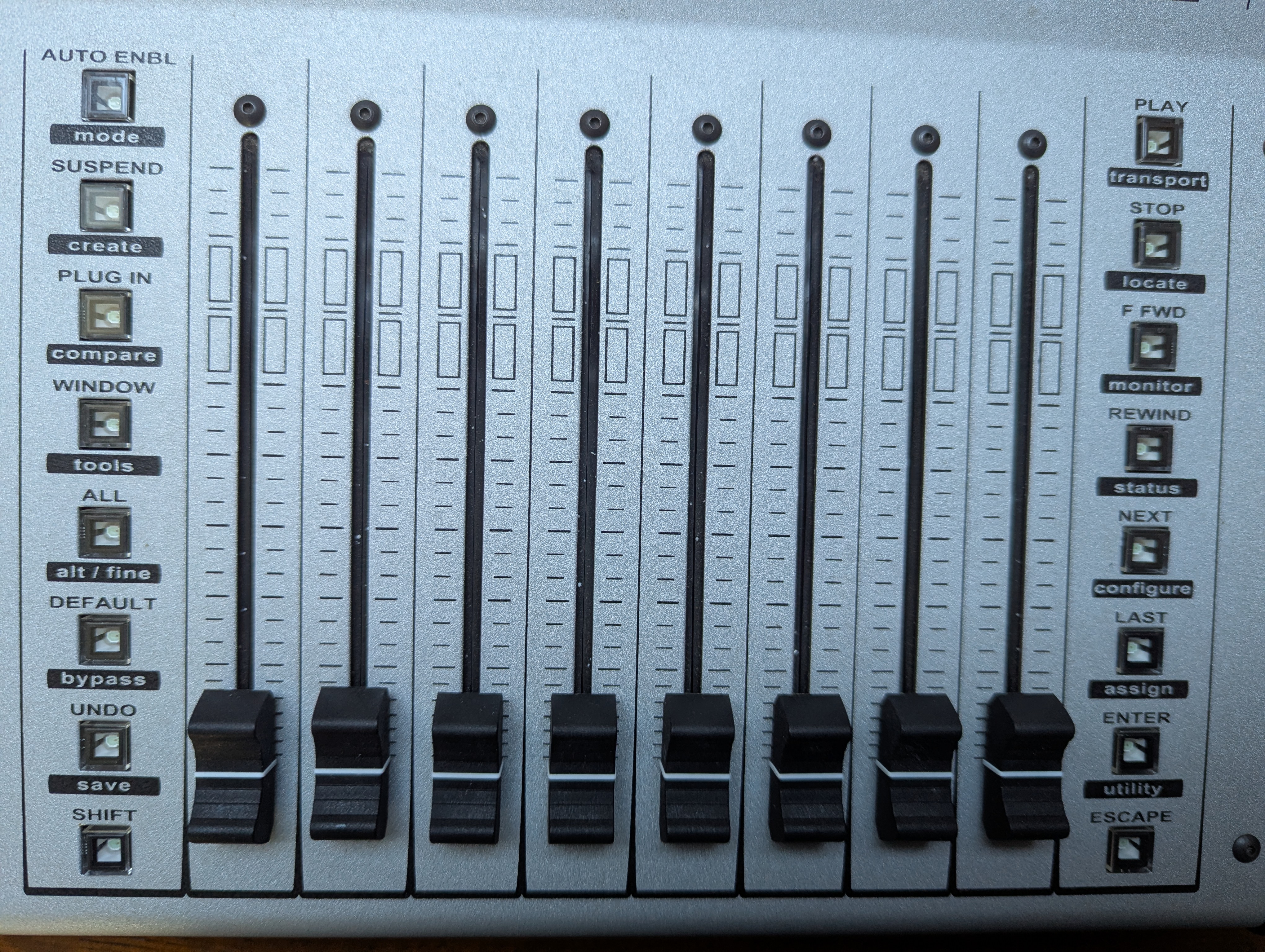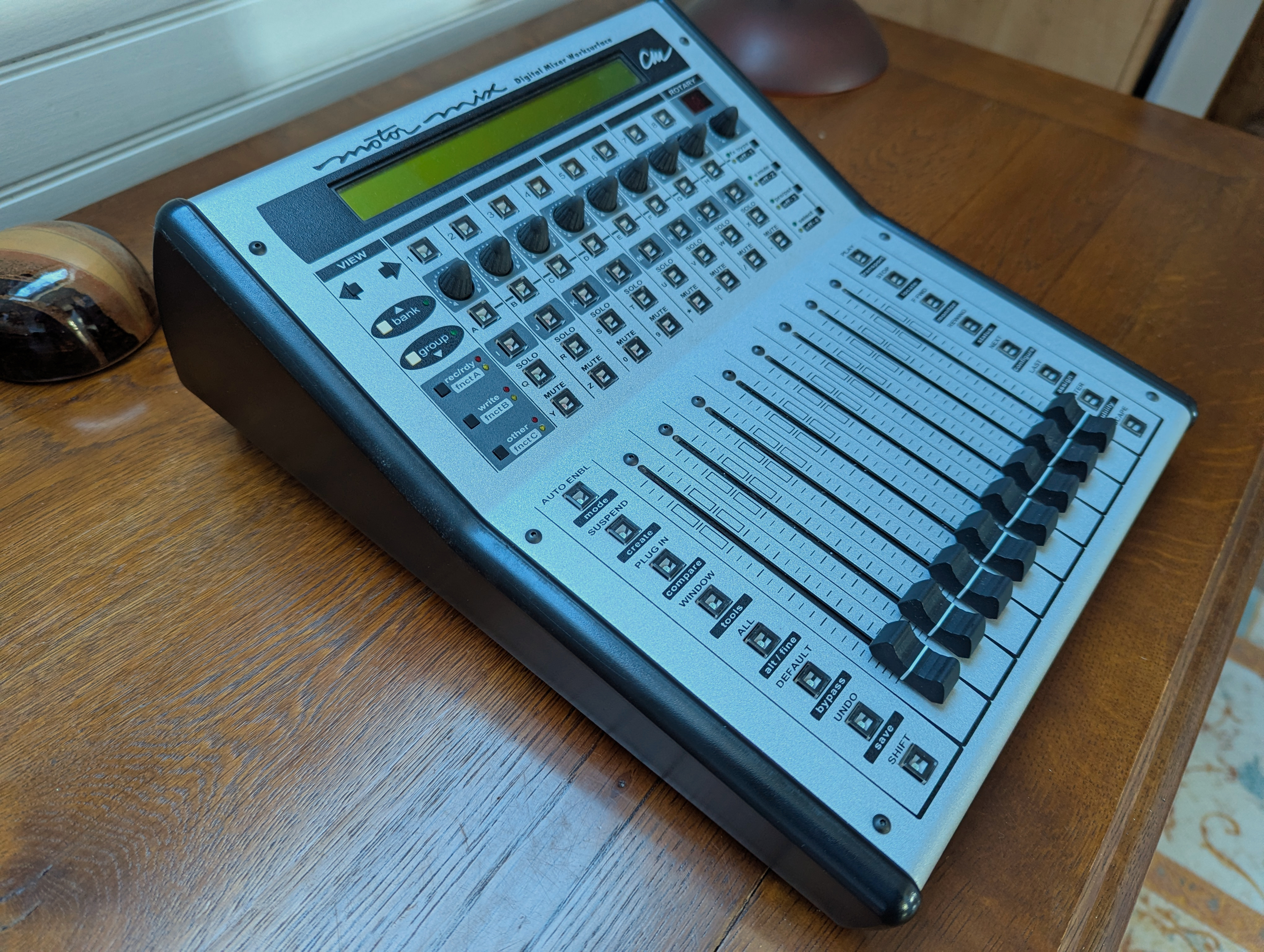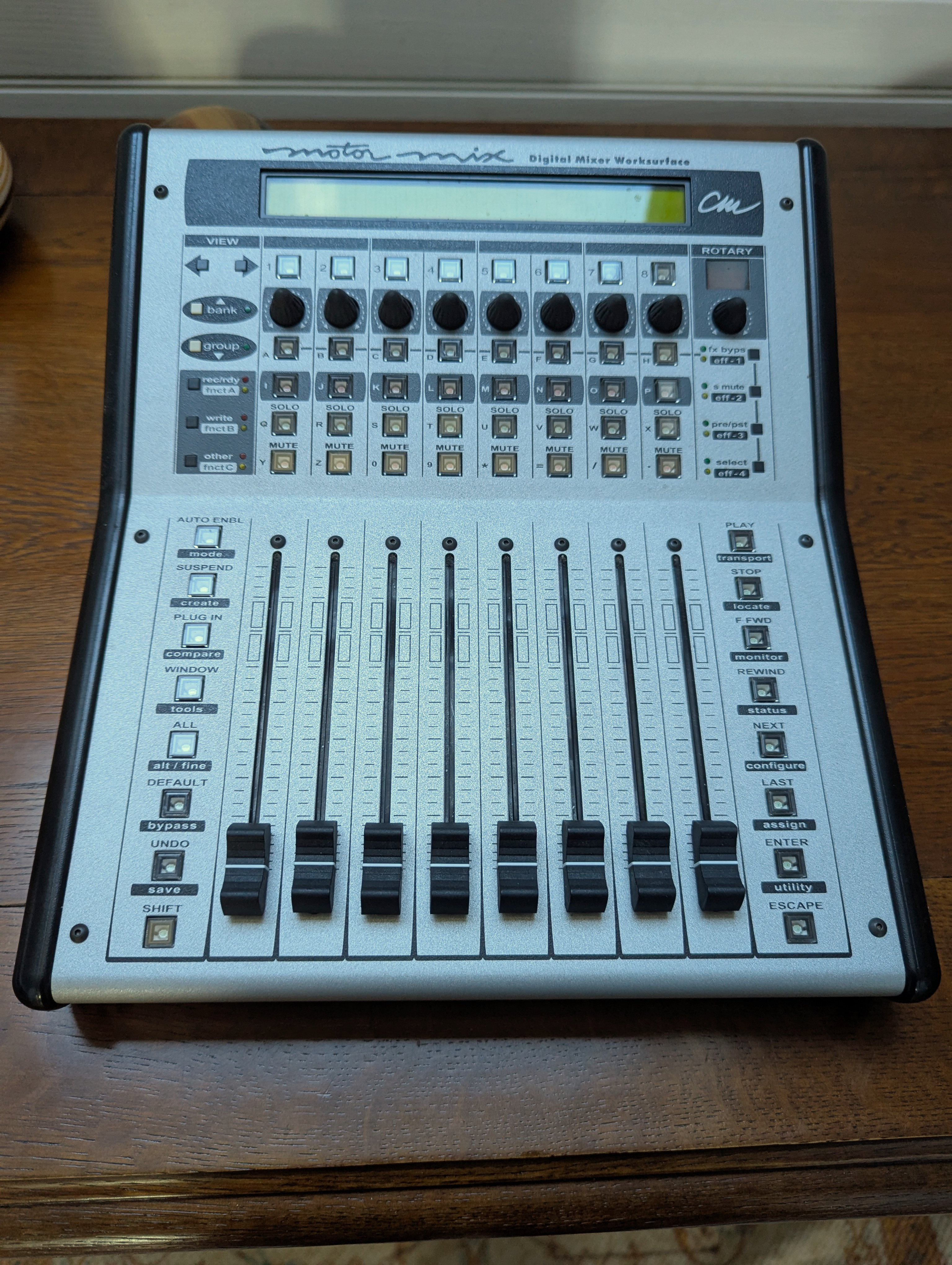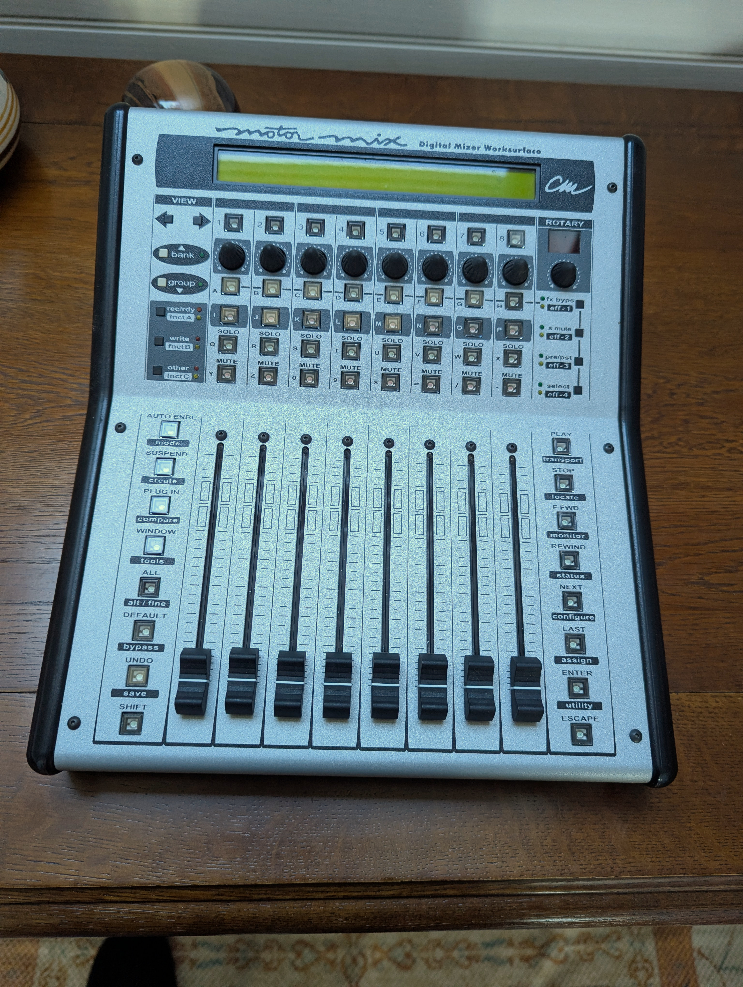 Contrôleur pour DAW avec 8 faders motorisés. Connexion au DAW par MIDI in/out. Mode d'emploi et manuel de développement.