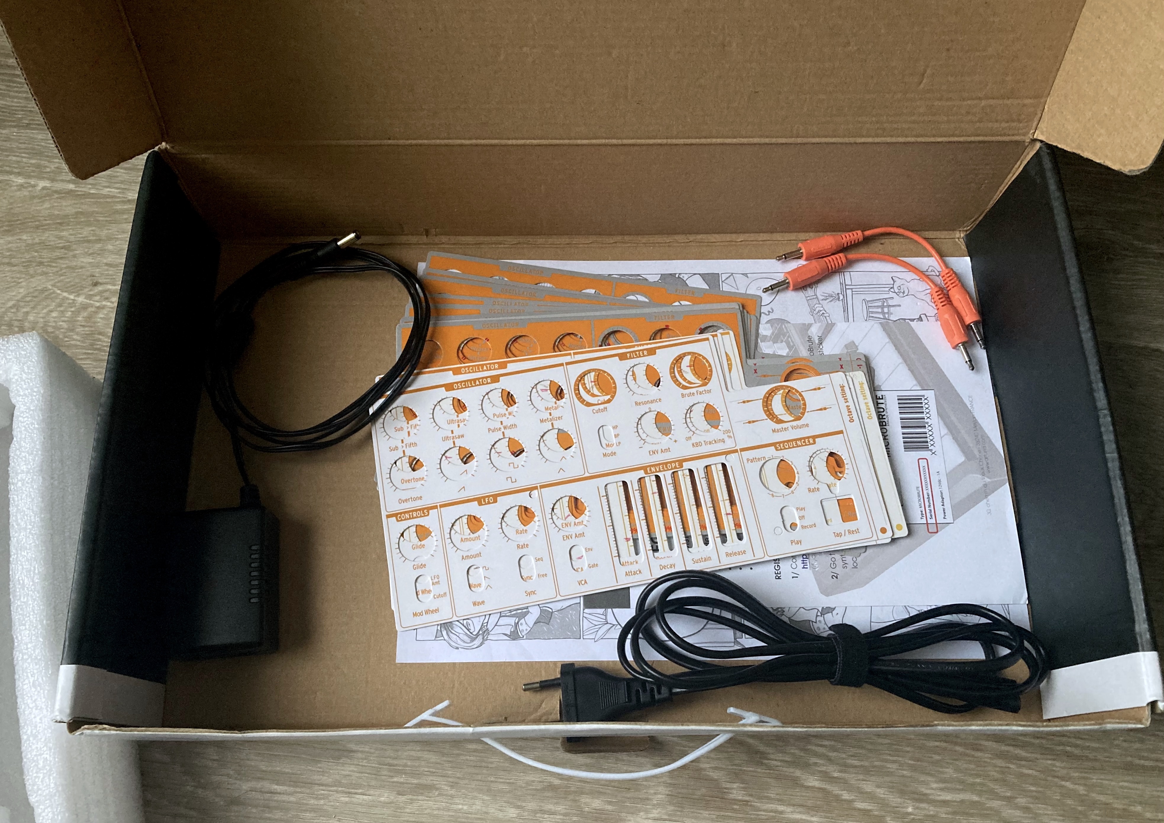 Avec sa boite, son alimentation, ses feuilles de presets et ses câbles de patchs.