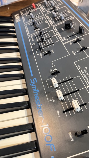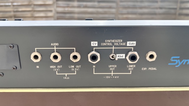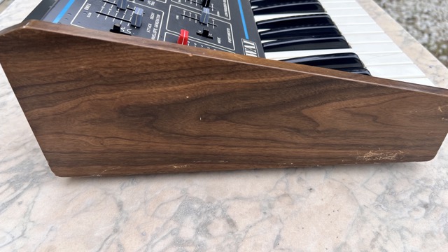 En parfait état de marche.Quelques traces sur les parties en bois ; une touche a été cassée puis recollée. Toutes les touches du clavier fonctionnent correctement. Le synthétiseur a été modifié en 2001 par Jean Loup Dierstein à Paris pour intégrer un contrôle de hauteur V/Oct. La modification repose sur un petit circuit imprimé supplémentaire et utilise deux prises jack 6,35 mm d'origine pour le contrôle de la porte externe et le contrôle de la tension de hauteur (Pitch CV). La troisième prise jack 6,35 mm d'origine a été retirée et remplacée par un commutateur à deux positions permettant soit le contrôle de la hauteur via le clavier, soit via l'entrée Pitch CV. Dans les deux positions, le clavier génère des impulsions de gate. Le câble d'alimentation gris d'origine a été remplacé par une prise européenne standard.