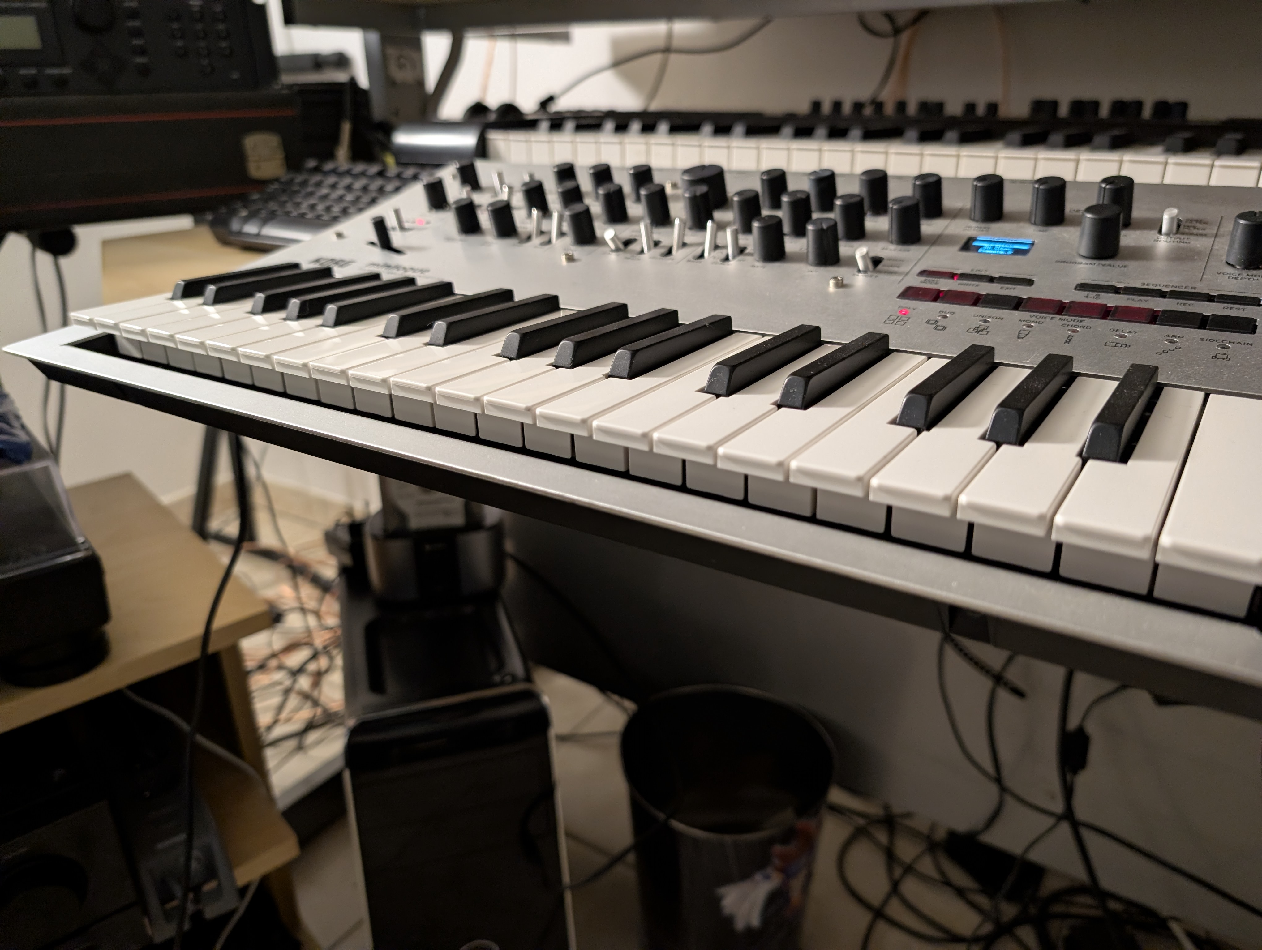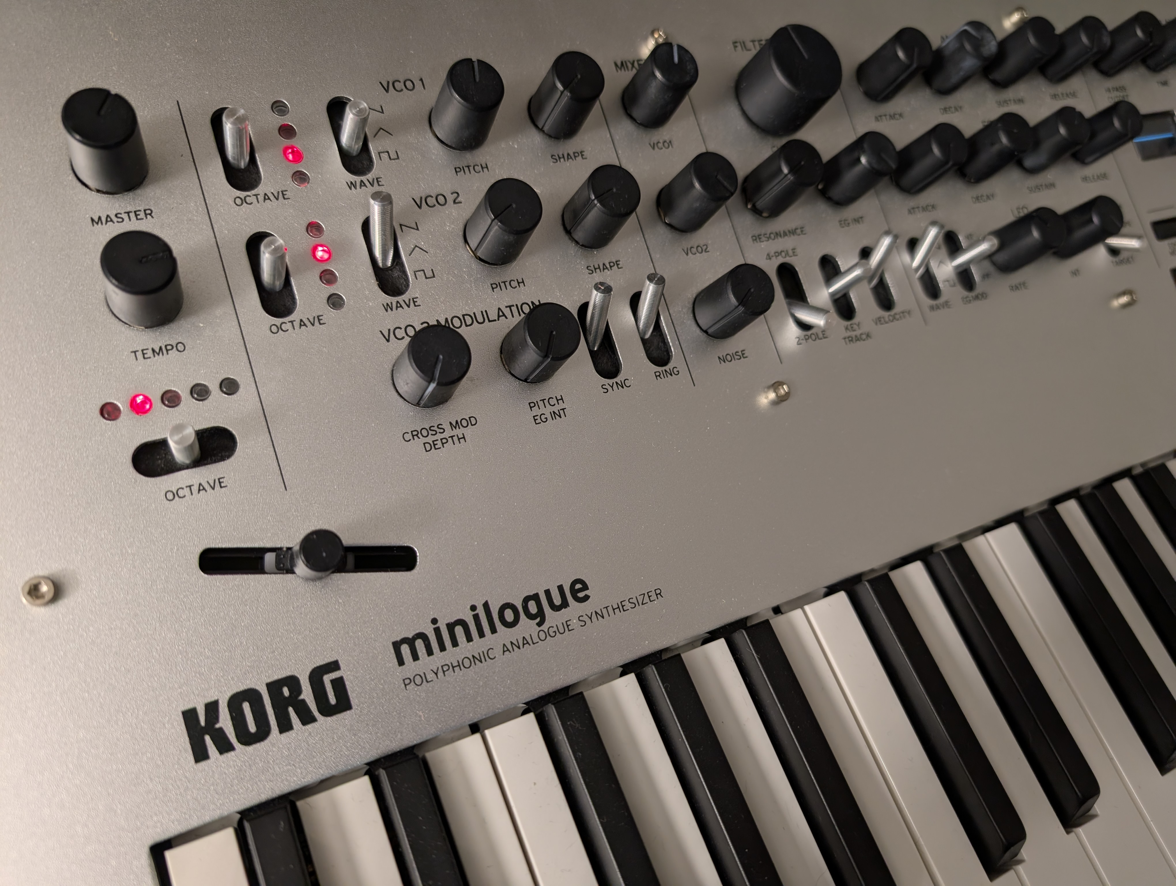 Korg Minilogue - complet avec boîte + notice + alimentation + facture d'origineLes boutons sont d'origine et ne collent pas (sauf celui du bender... Un peu)