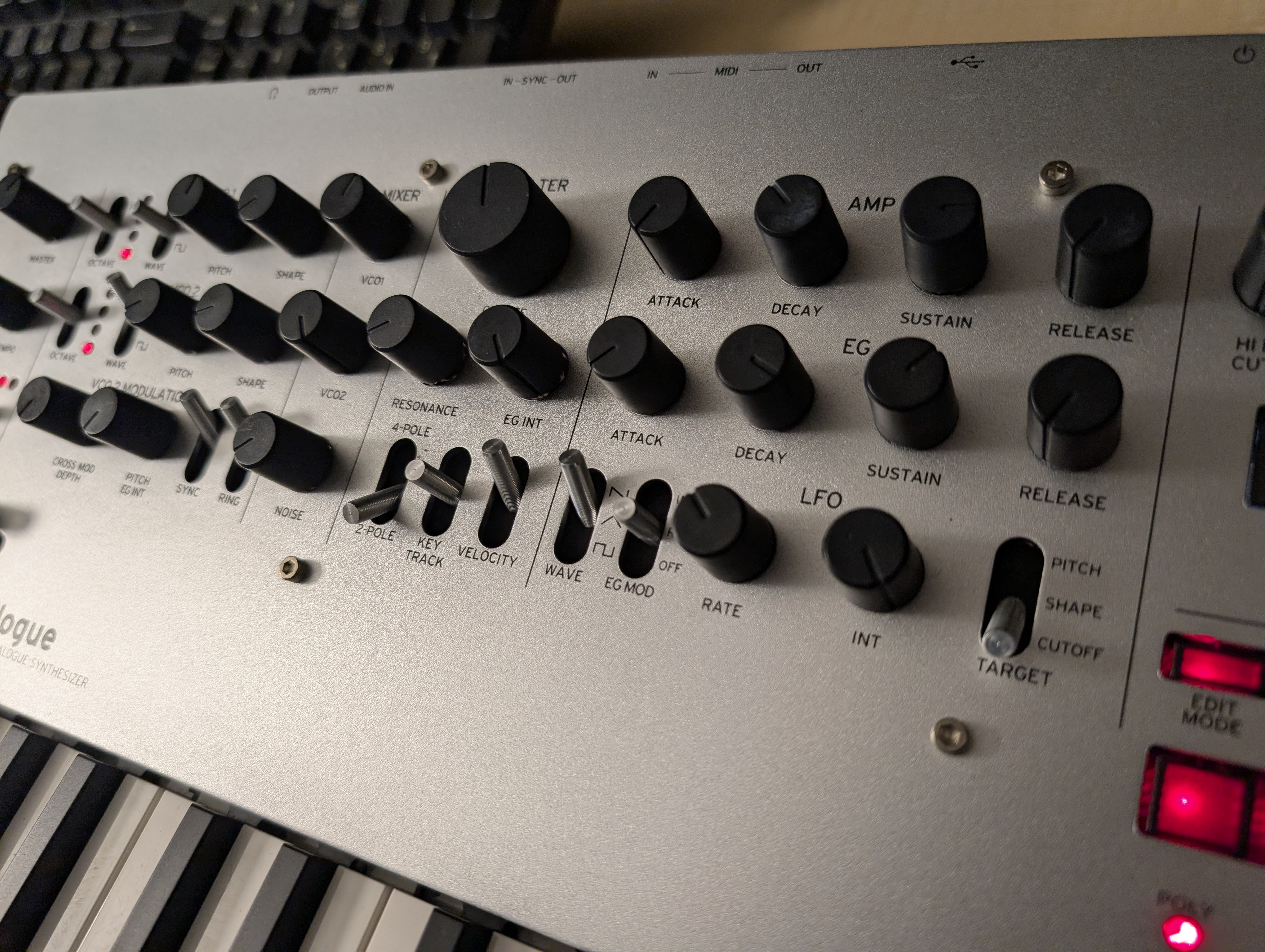 - LFO : Wave (Saw, Triangle, Square), EG Mod (Int, Rate, Off), Rate, Int, Target (Pitch, Shape, Cutoff)