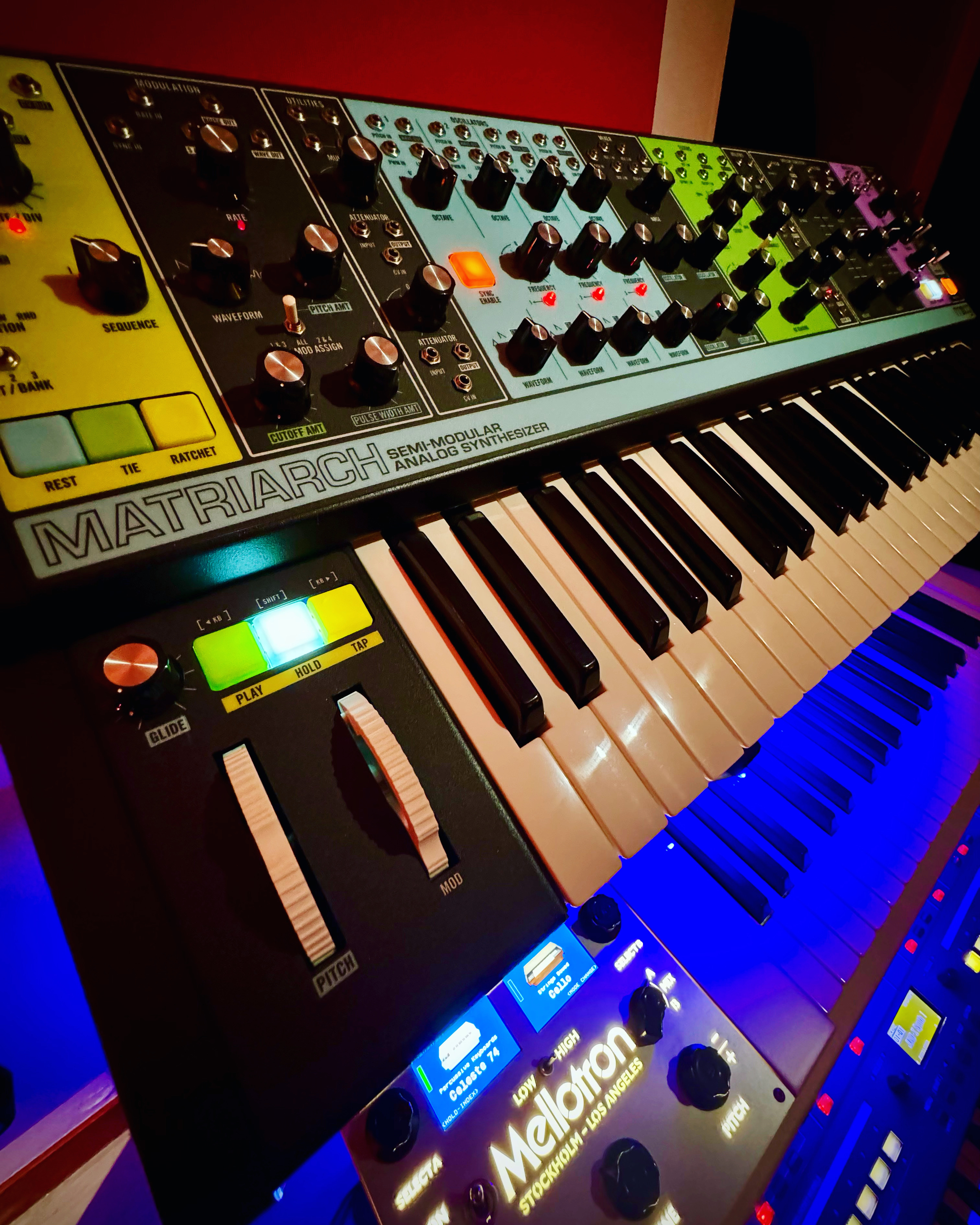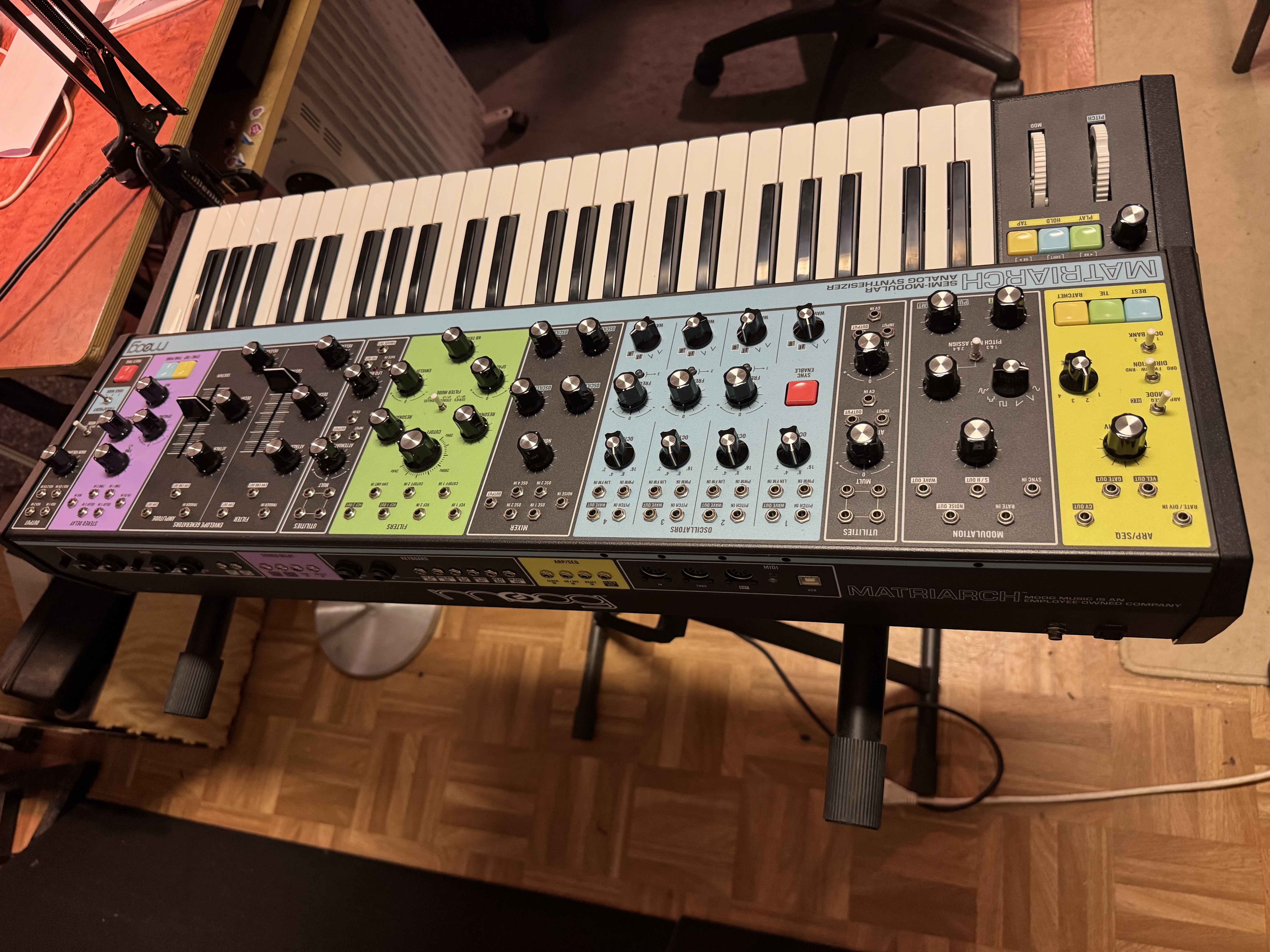 Son clavier est le meilleur clavier que j'ai eu pour le moment, j'avais un Keystation 61es M-Audio, remplacé par un Keystep ARTURIA avec aftertouch il y quelques années et bien le Fatar du Matriach est largement au-dessus d'ailleurs il me sert de clavier maître pour les instruments virtuels peuplant mon PC et mon petit MicroMonsta posé à côté du Moog, difficile d'utiliser un autre clavier après lui
