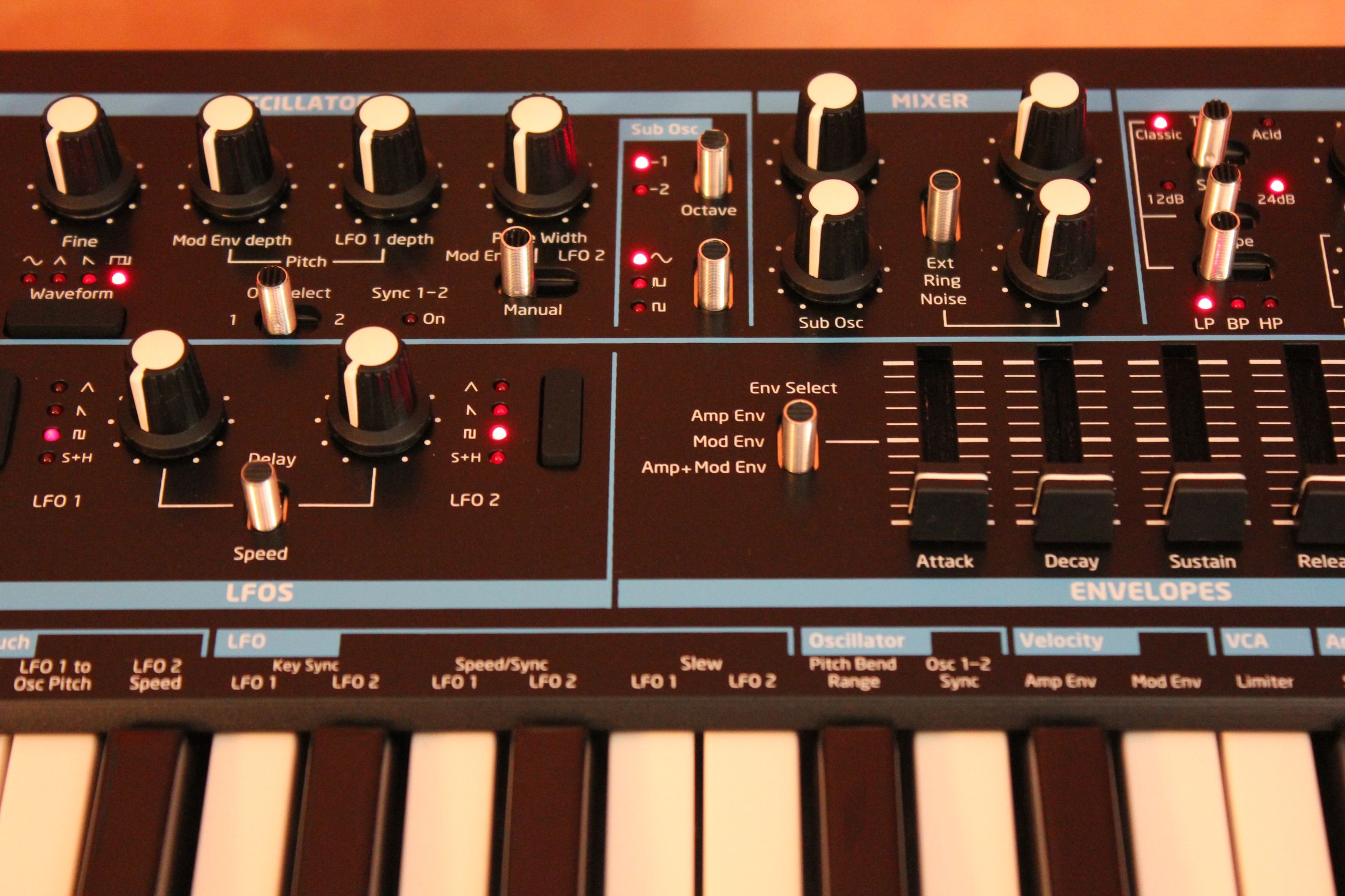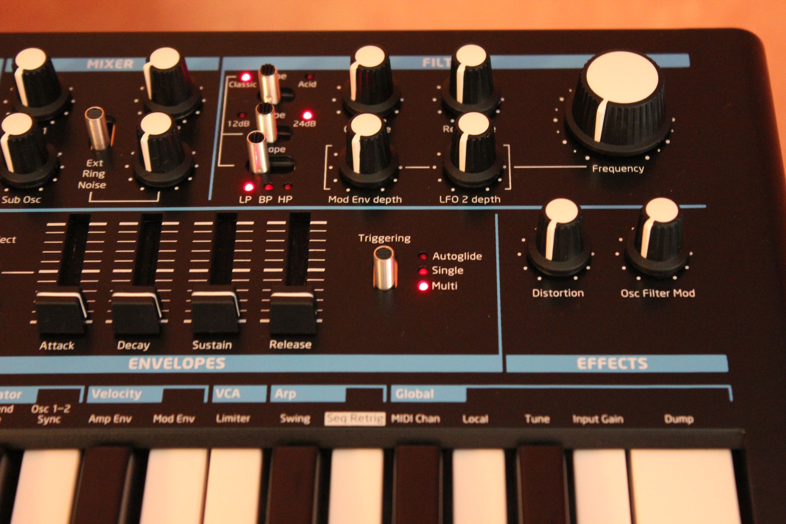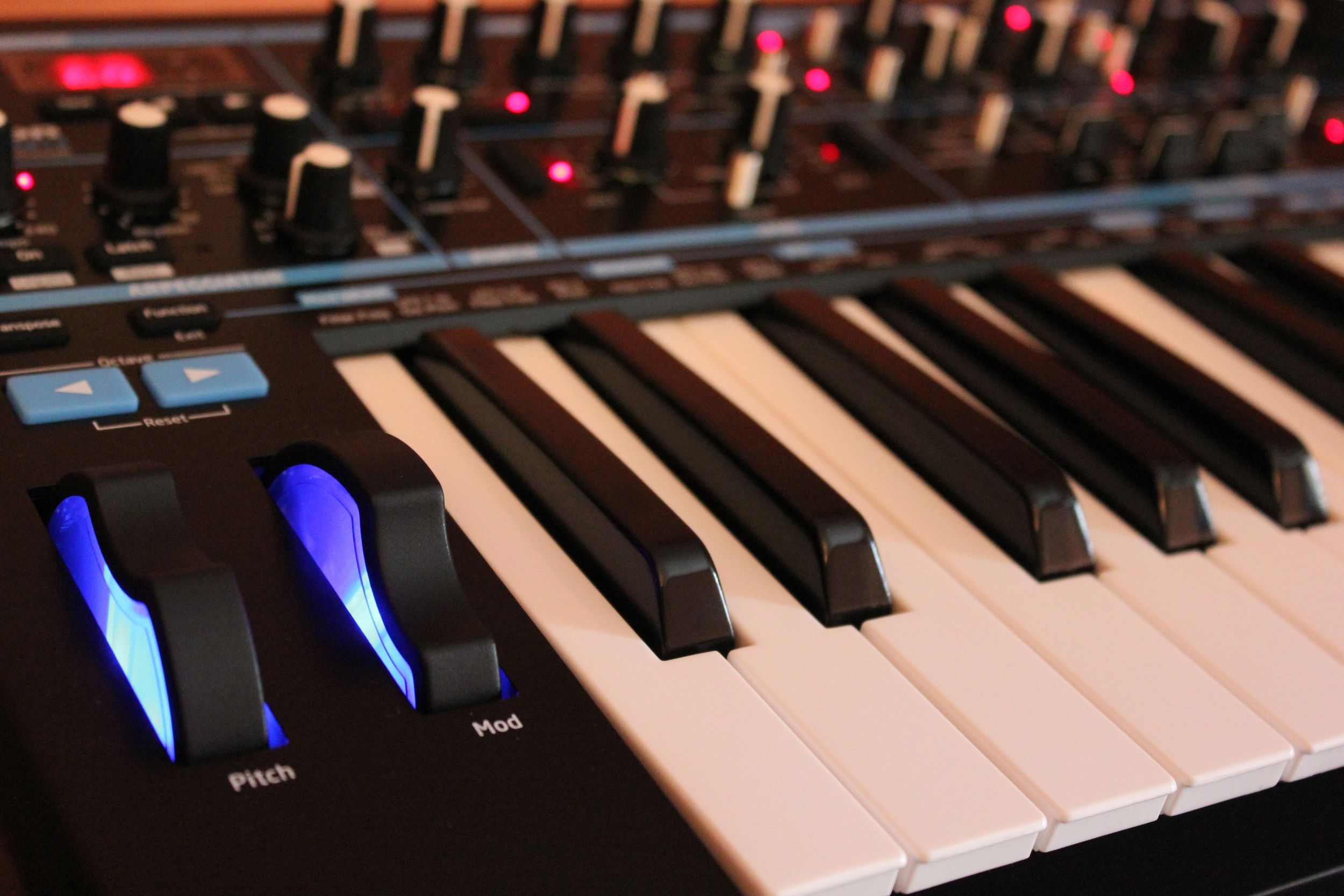La petite façade est couverte de commandes, tant mieux ! En haut à gauche, on commence par la section numérique avec écran 3 diodes – 7 caractères affichant numéro de programme, valeurs, transposition… c’est là qu’on peut choisir et sauvegarder les sons. Le potard de volume est aussi là, il n’a donc pas été oublié. Les commandes de synthèse sont logiquement réparties sur 2 rangées : l’audio en partie supérieure et les modulations en partie inférieure. On passe ainsi par les oscillateurs, le mixeur et le filtre ; puis l’arpégiateur, le LFO et les enveloppes. Seules exceptions, les deux potards de distorsion et modulation du filtre finissent tout en bas à droite. En tout, ce ne sont pas moins de 24 potards (dont un énorme pour la coupure du filtre), 11 sélecteurs, 13 boutons de toutes formes et 35 diodes qui nous facilitent la vie. À gauche du clavier, les 2 molettes de pitch (à ressort mou) et de modulation (libre) sont rétro-éclairées en bleu électrique du plus bel effet ! Les 25 touches du clavier sont sensibles à la vélocité et à la pression, très agréables au toucher, chapeau !