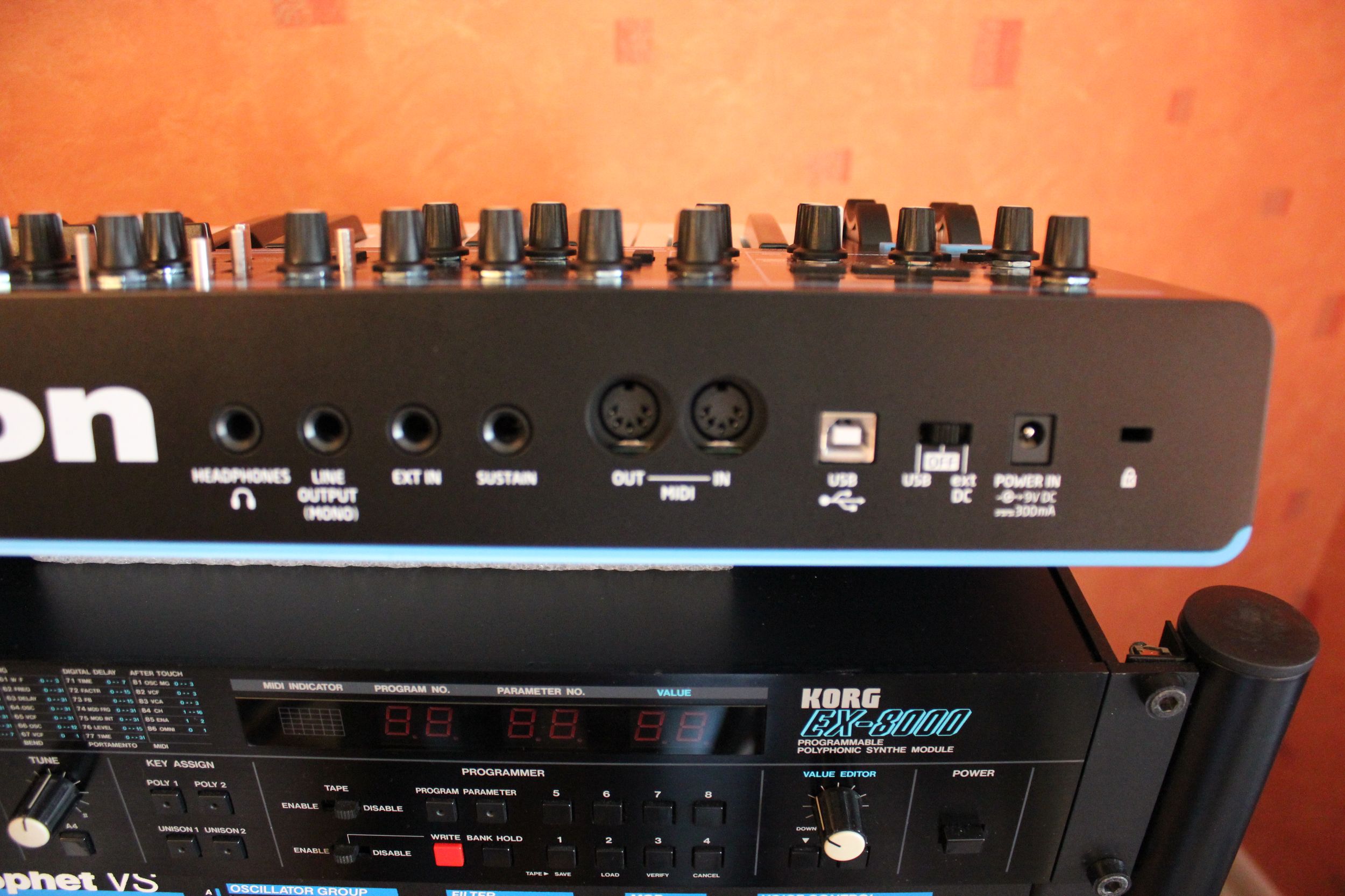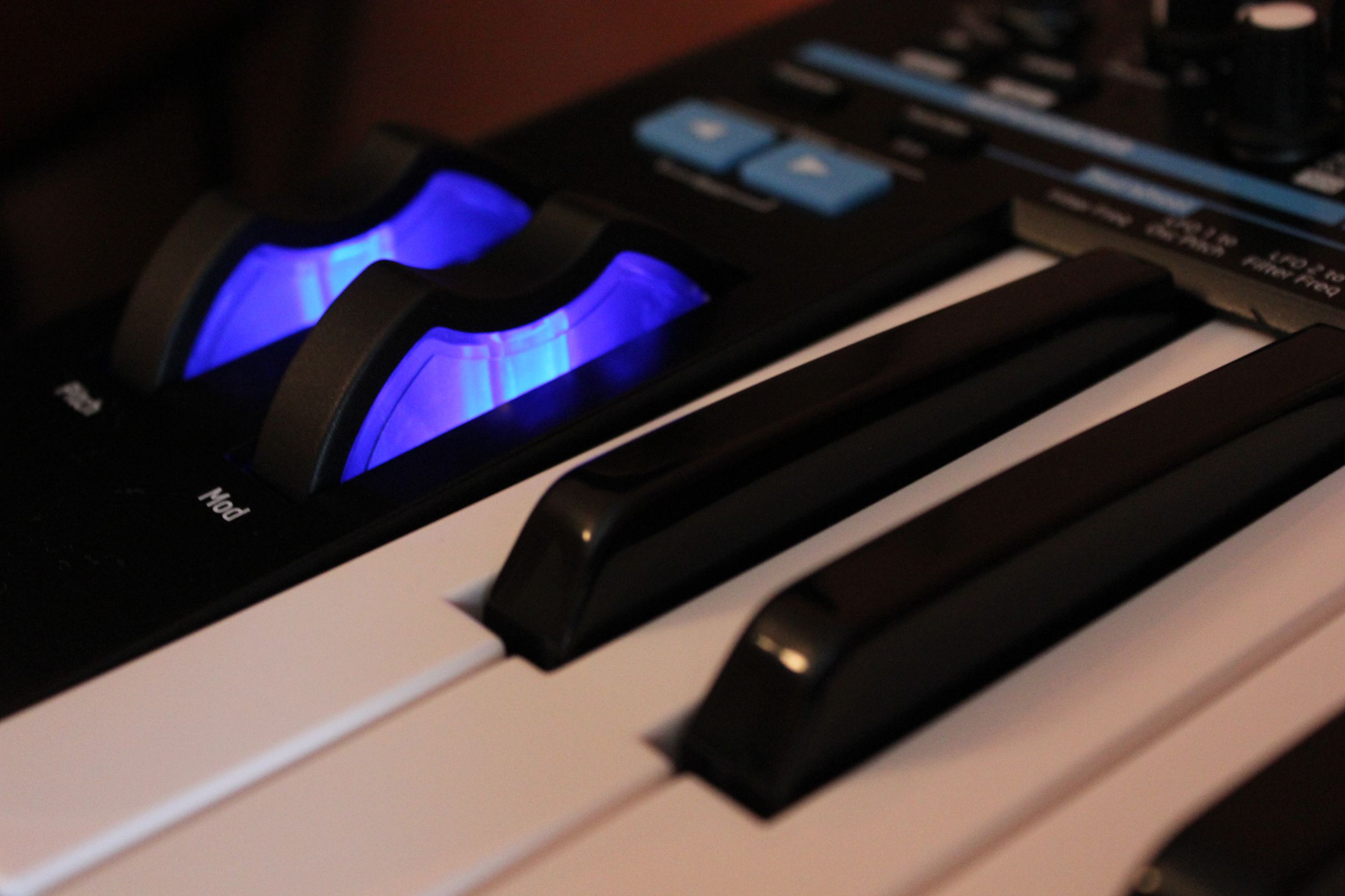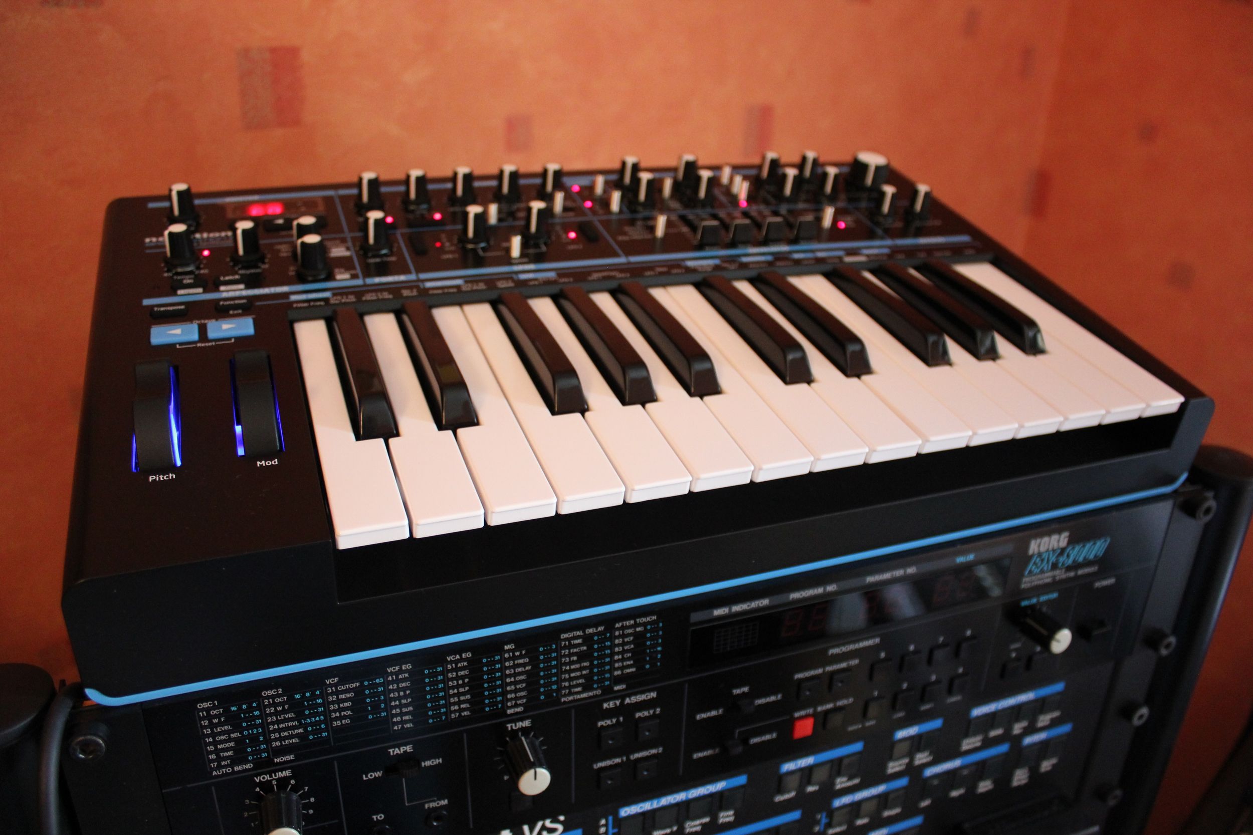 La petite façade est couverte de commandes, tant mieux ! En haut à gauche, on commence par la section numérique avec écran 3 diodes – 7 caractères affichant numéro de programme, valeurs, transposition… c’est là qu’on peut choisir et sauvegarder les sons. Le potard de volume est aussi là, il n’a donc pas été oublié. Les commandes de synthèse sont logiquement réparties sur 2 rangées : l’audio en partie supérieure et les modulations en partie inférieure. On passe ainsi par les oscillateurs, le mixeur et le filtre ; puis l’arpégiateur, le LFO et les enveloppes. Seules exceptions, les deux potards de distorsion et modulation du filtre finissent tout en bas à droite. En tout, ce ne sont pas moins de 24 potards (dont un énorme pour la coupure du filtre), 11 sélecteurs, 13 boutons de toutes formes et 35 diodes qui nous facilitent la vie. À gauche du clavier, les 2 molettes de pitch (à ressort mou) et de modulation (libre) sont rétro-éclairées en bleu électrique du plus bel effet ! Les 25 touches du clavier sont sensibles à la vélocité et à la pression, très agréables au toucher, chapeau !