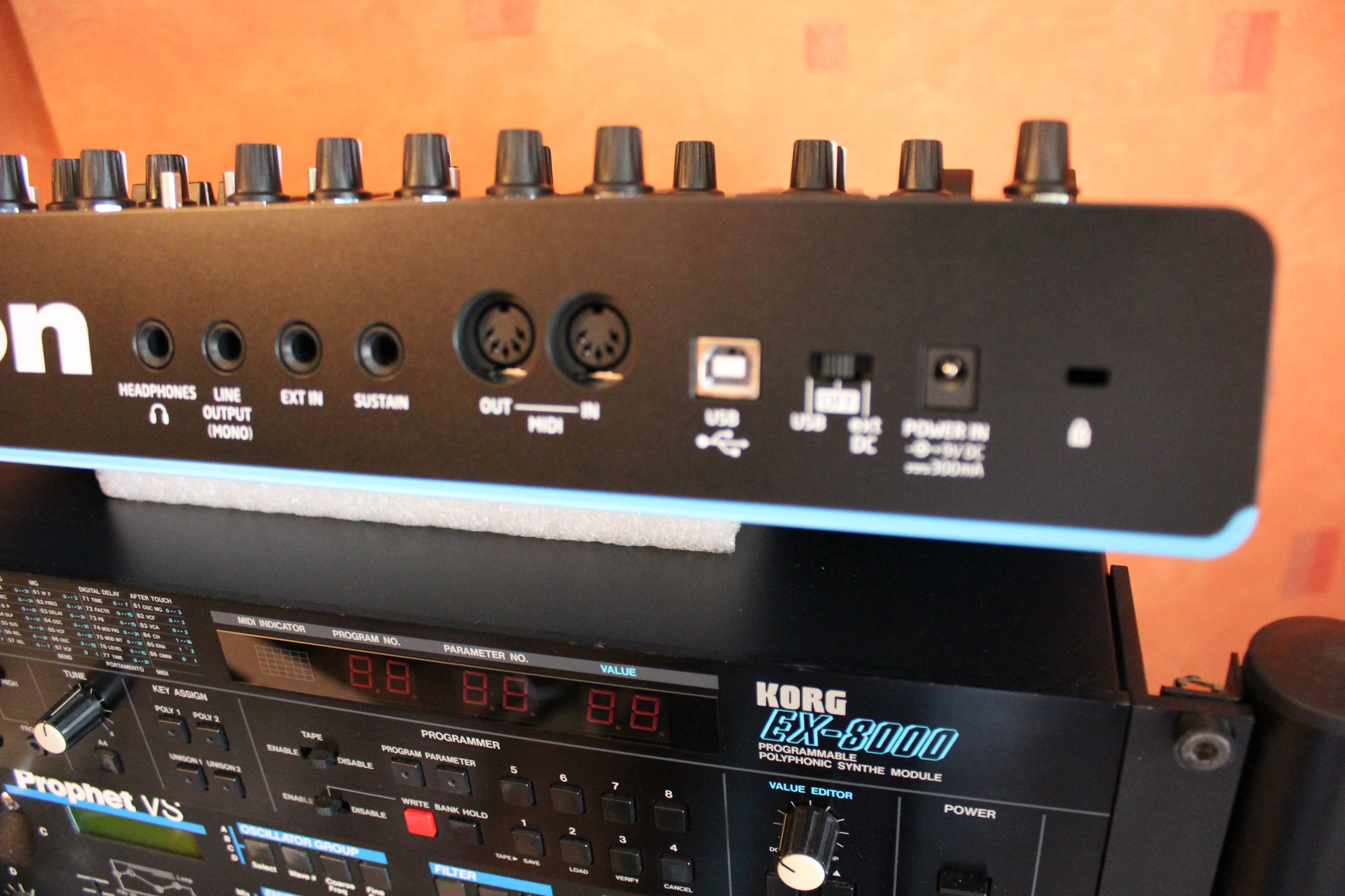 Le panneau arrière reprend l’ensemble de la connectique, à savoir : sortie audio mono, sortie casque, entrée audio mono (gain réglable en interne de –10 à 60 dB) et connecteur pour pédale de maintien (type interrupteur à détection de polarité automatique à l’allumage). Tout ce beau monde est au format jack 6,35 TS sauf la prise casque, logiquement en TRS. Le son est toutefois mono. Il y a aussi un duo d’entrée / sortie MIDI (notes, CC / NRPN, dumps) et une prise USB 1.1 vers hôte pour le MIDI (en natif, sans pilote) et l’alimentation (5V / 0,5A mini). Cette dernière peut également se faire via la traditionnelle borne pour transfo hélas externe DC 9V / 500 mA, de type bloc mural avec un cordon un peu court ; la bascule entre les sources de courant se fait à l’aide d’un sélecteur à 3 positions (off / transfo / USB). La prise USB ne fait toutefois pas du Bass Station II une interface Midi / USB vers le monde extérieur. Enfin, une attache antivol Kensington est prévue, mais pas la moindre prise CV / Gate en vue, seule omission à notre sens dans un monde analogique parfait.
