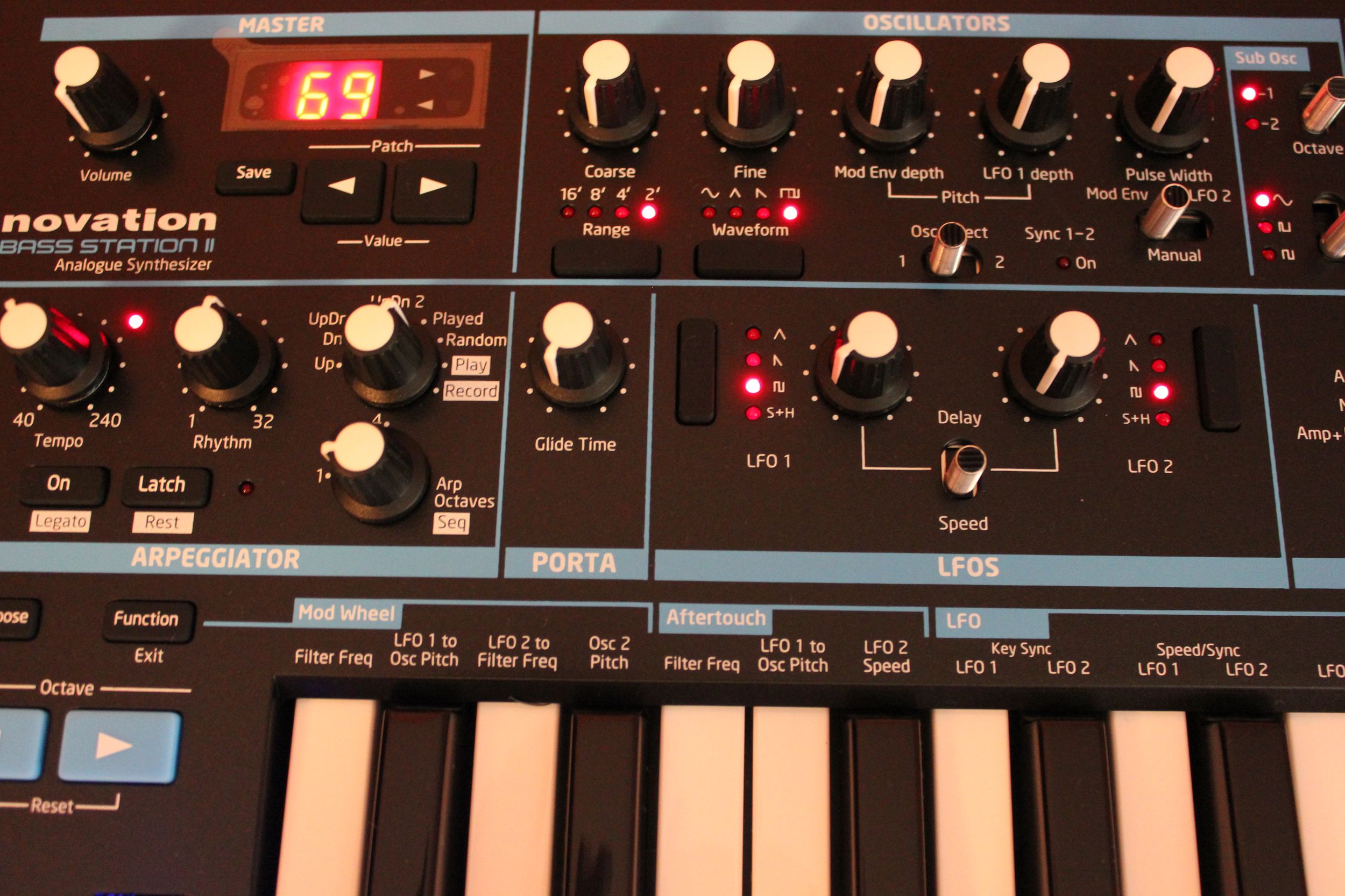 Le Bass Station II ne serait pas un Novation sans son arpégiateur programmable. Il s’agir d’un module bien fourni, synchronisable à une horloge interne ou MIDI, avec son potard de tempo dédié. Il y a 32 motifs d’arpèges directement accessibles, reprenant diverses signatures rythmiques plus ou moins complexes. L’arpégiateur peut agir sur 1 à 4 octaves, suivant 6 modes de jeu : haut, bas, alternés (x2), comme joué ou aléatoire. On peut même ajouter une certaine quantité de swing.