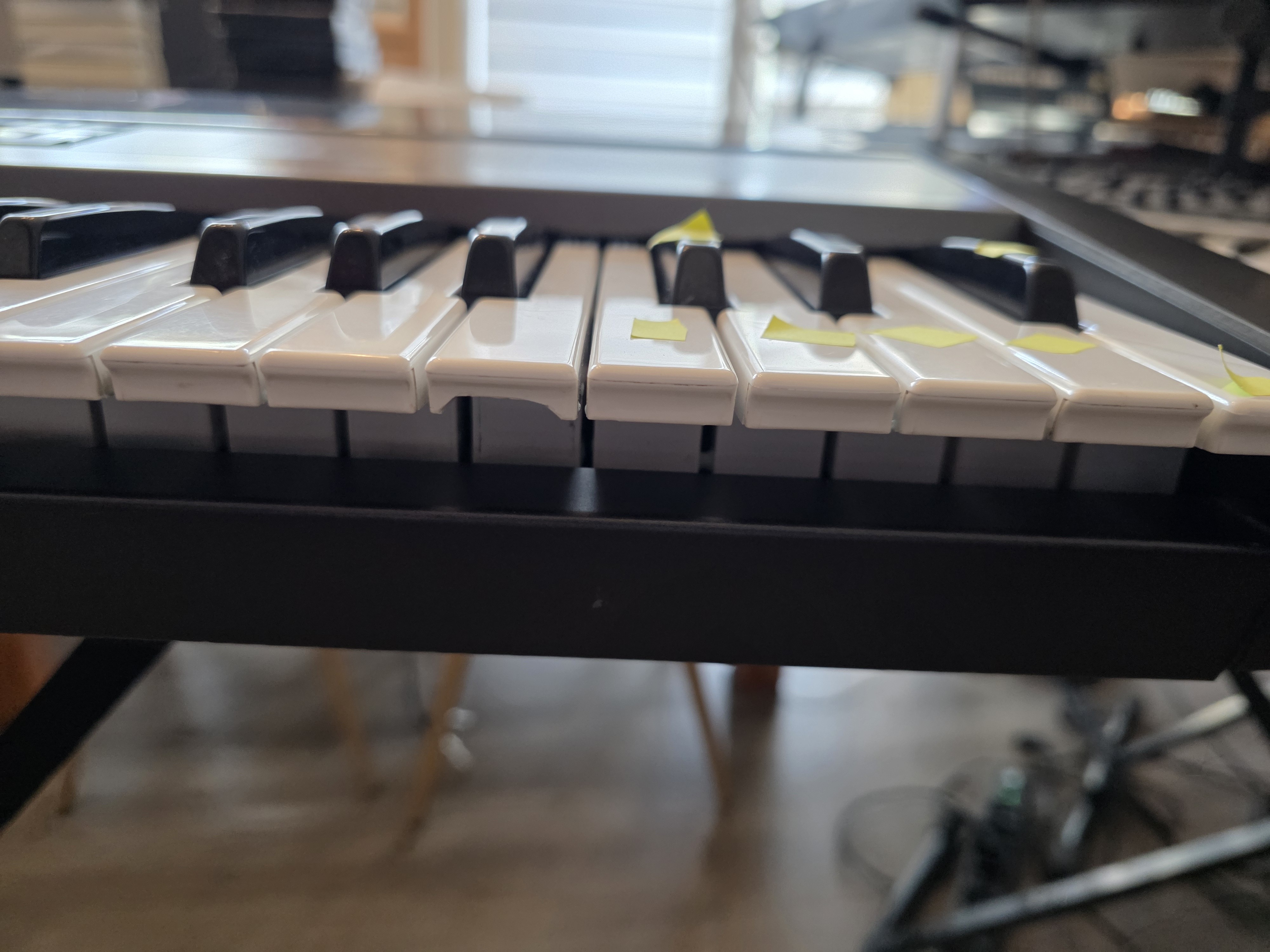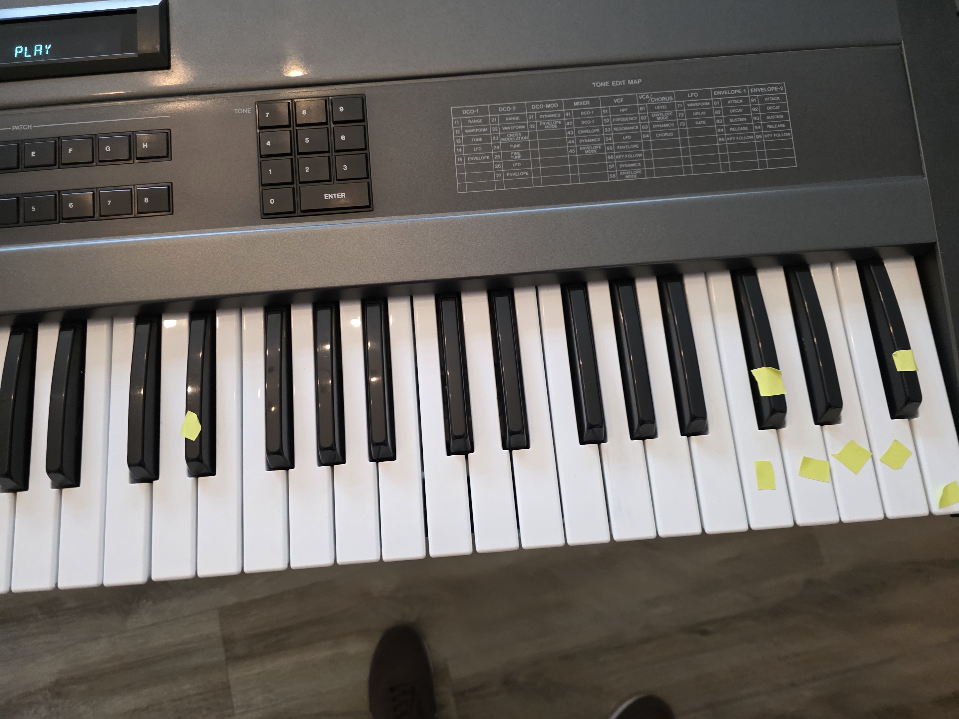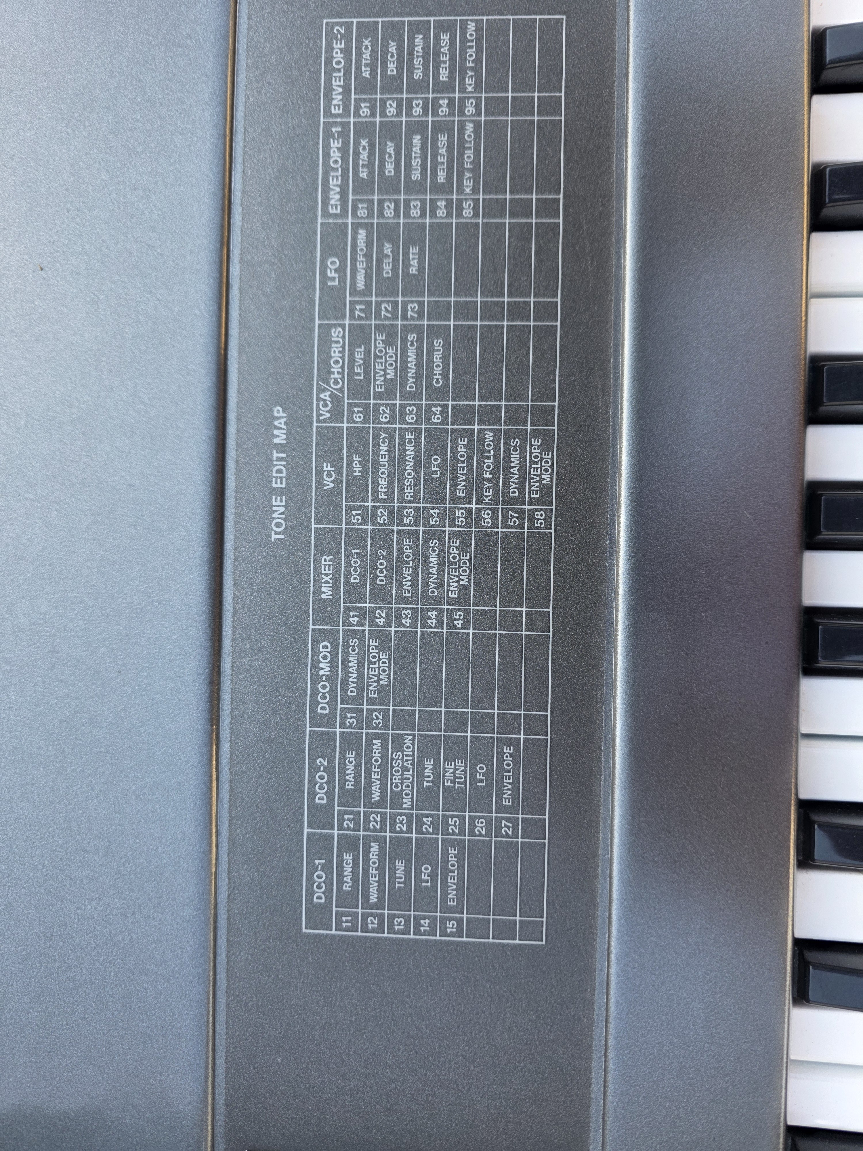 L'aspect esthétique de l'appareil est en très bon état. À noter que le clavier nécessite une révision car certaines touches ne répondent plus (identifiées en jaune sur les photos). Cependant, l'ensemble fonctionne parfaitement lorsqu'il est piloté par un clavier maître. Toutes les autres touches sont opérationnelles.