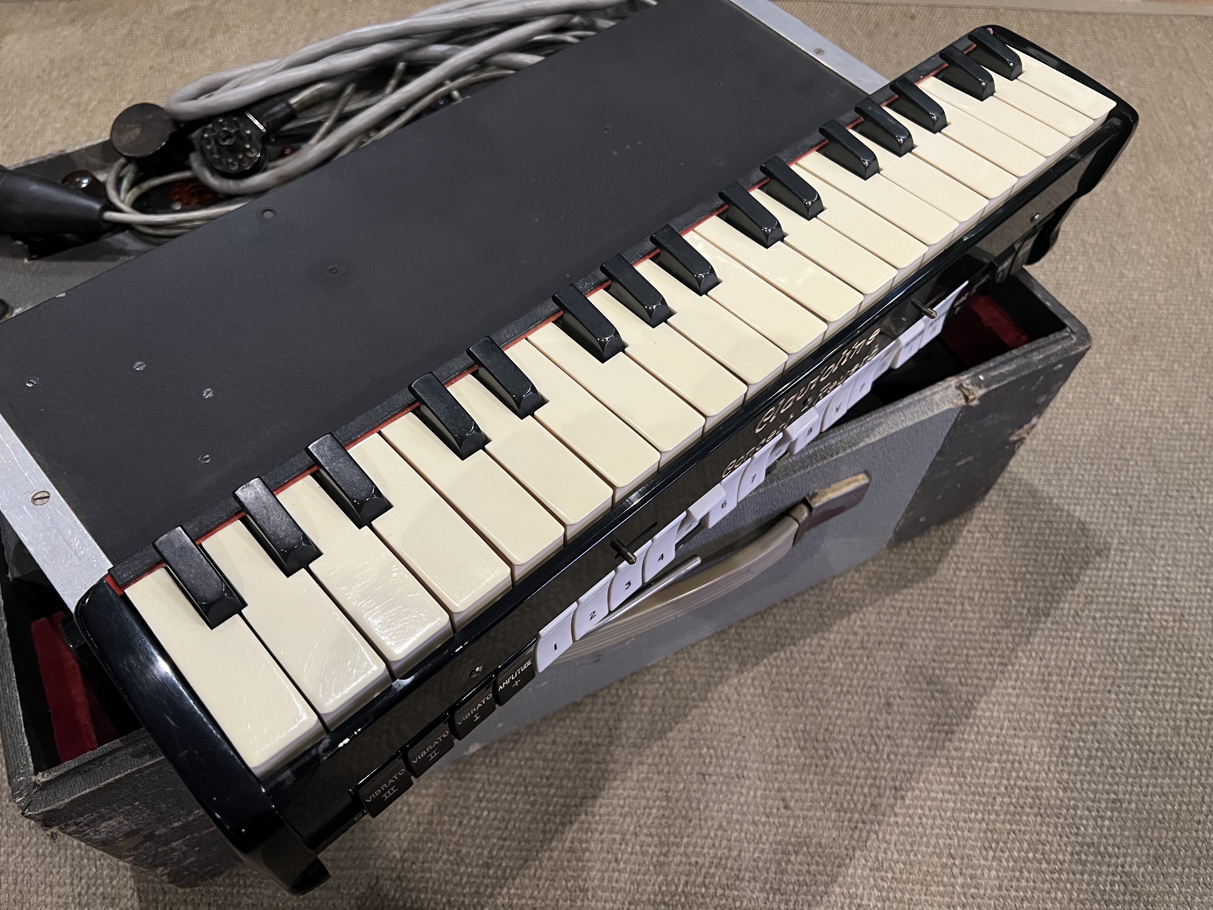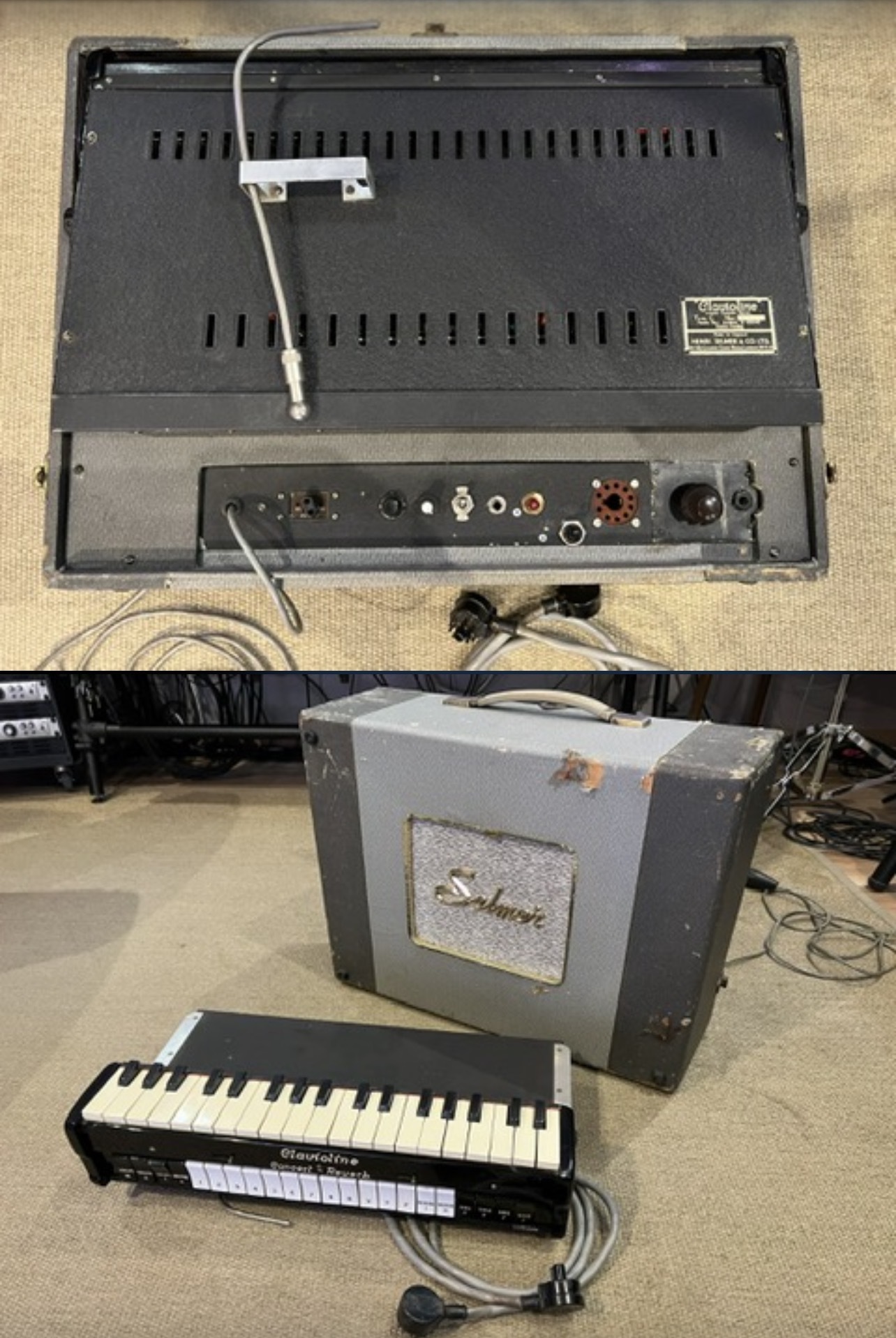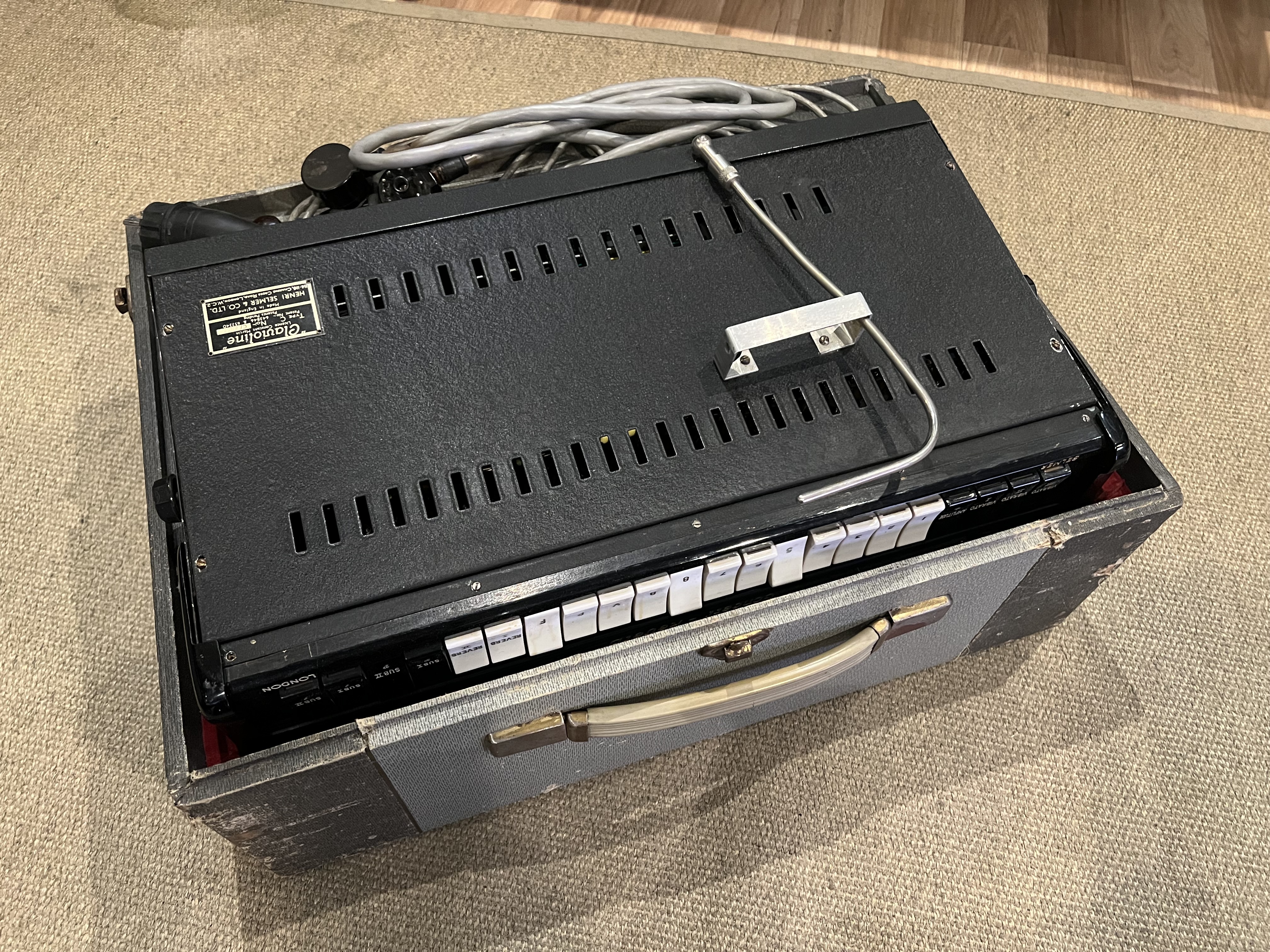 Un des modèles de Clavioline les plus rares et les plus avancés. La reverb est incroyable. Entièrement restaurée par un spécialiste et fonctionnelle. Une entrée audio à être ajoutée à l’ampli pour y rentrer un autre instrument, comme une guitare par exemple.
