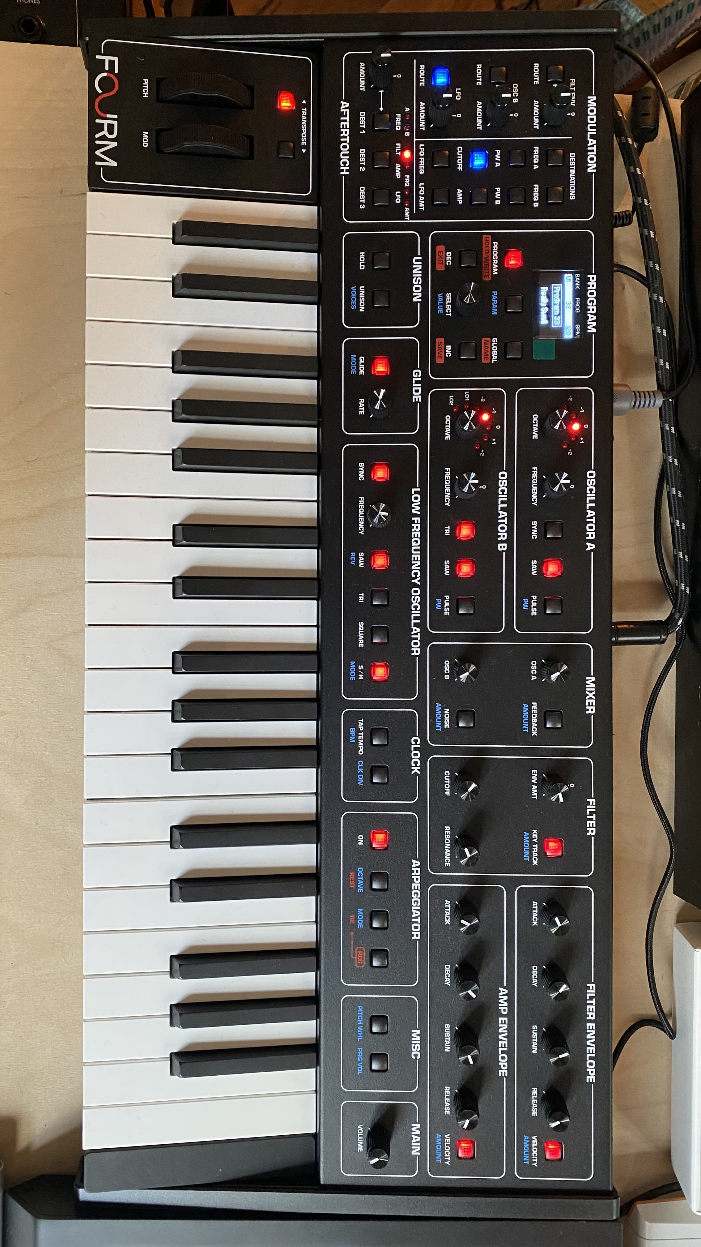 Déjà l’apparence laisse à désirer avec des flancs plastiques, des potards étroits, une alim déportée, des boutons rouges, et un clavier horrible tout juste du niveau d’un Microkorg (je m’attendais pas à ça on voit les cartes au travers) on part sur des bases disons… Fragiles. La bestiole est petite et pèse pas grand chose (4kg). De couleur noire et badigeonnée de rouge, de bleu et blanc, coiffée d’un nom à coucher dehors, le ‘Fourm’ se targue d’un ramage "Prophetien" pour effacer son plumage dirons nous 'cheap'. Soit! Alors écoutons et manipulons le Fourm (purée le blase, j’ai du mal!!) …. 10mn…… 20mn……. 30mn ... Je tournicote de ci de là.....Mouais… Première impressions: On dirait bien un clavier entrée de gamme de chez Roland (genre JDX) avec un son très typé Prophet 5 . Boom! Désolé mais c'est comme ça que je l'ai ressenti et j'ai pris mon temps (j'ai même comparé avec un Take5 juste à côté). Comme Moog avec son Mini, Korg avec ses MS, Roland et ses SH, Oberheim et son Obx, Sequential surf sur ce qui a fait son succès et son ‘mythe’.