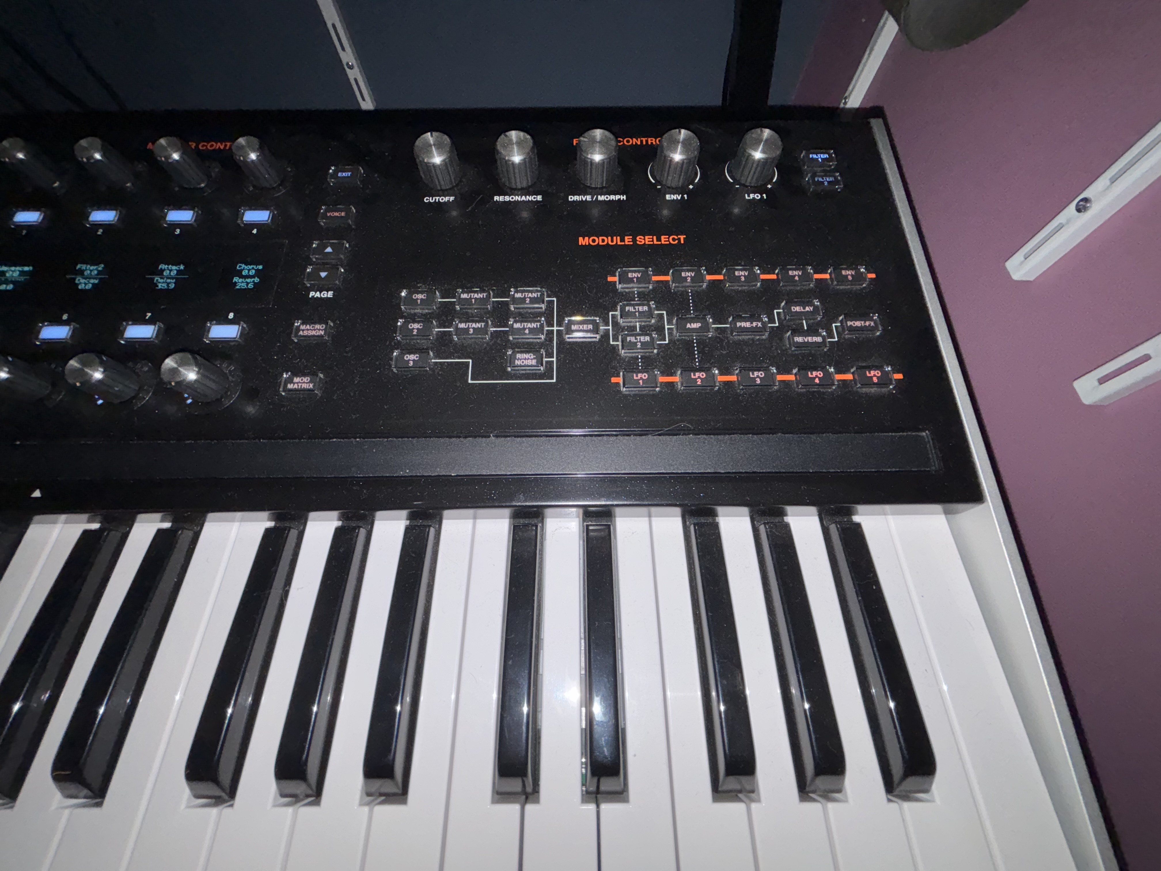 - Le synthé est très beau, ce qui est important, car cela le rends agréable à utiliser. C'est le synthé le plus agréable à utiliser dans le noir que j'ai jamais eu car toutes les commandes sont allumées et les écrans sont hyper agréables et pas du tout fatigants à l'œil. Je m'en suis rendu compte au début, un jour où j'avais commencé à travailler dessus en fin de journée, et d'un coup j'ai réalisé que la nuit était tombée et que j'étais dans le noir. Avec mes autres synthés, j'aurais à un moment ou à un autre été dérangé et j'aurais dû allumer la lumière. Là, vous pouvez pratiquement travailler dans le noir tellement l'ergonomie lumineuse est bien pensée. Chapeau ASM.