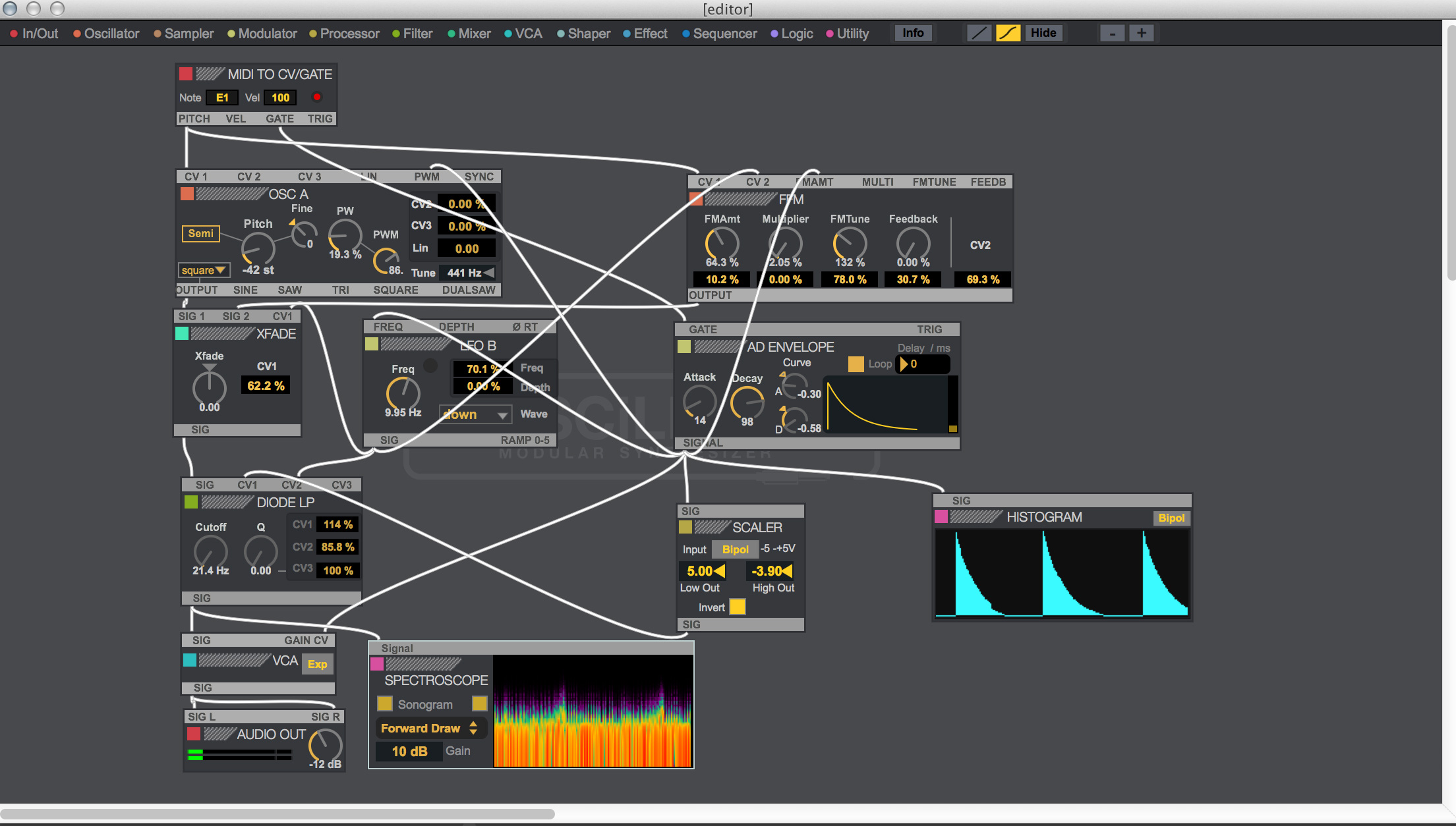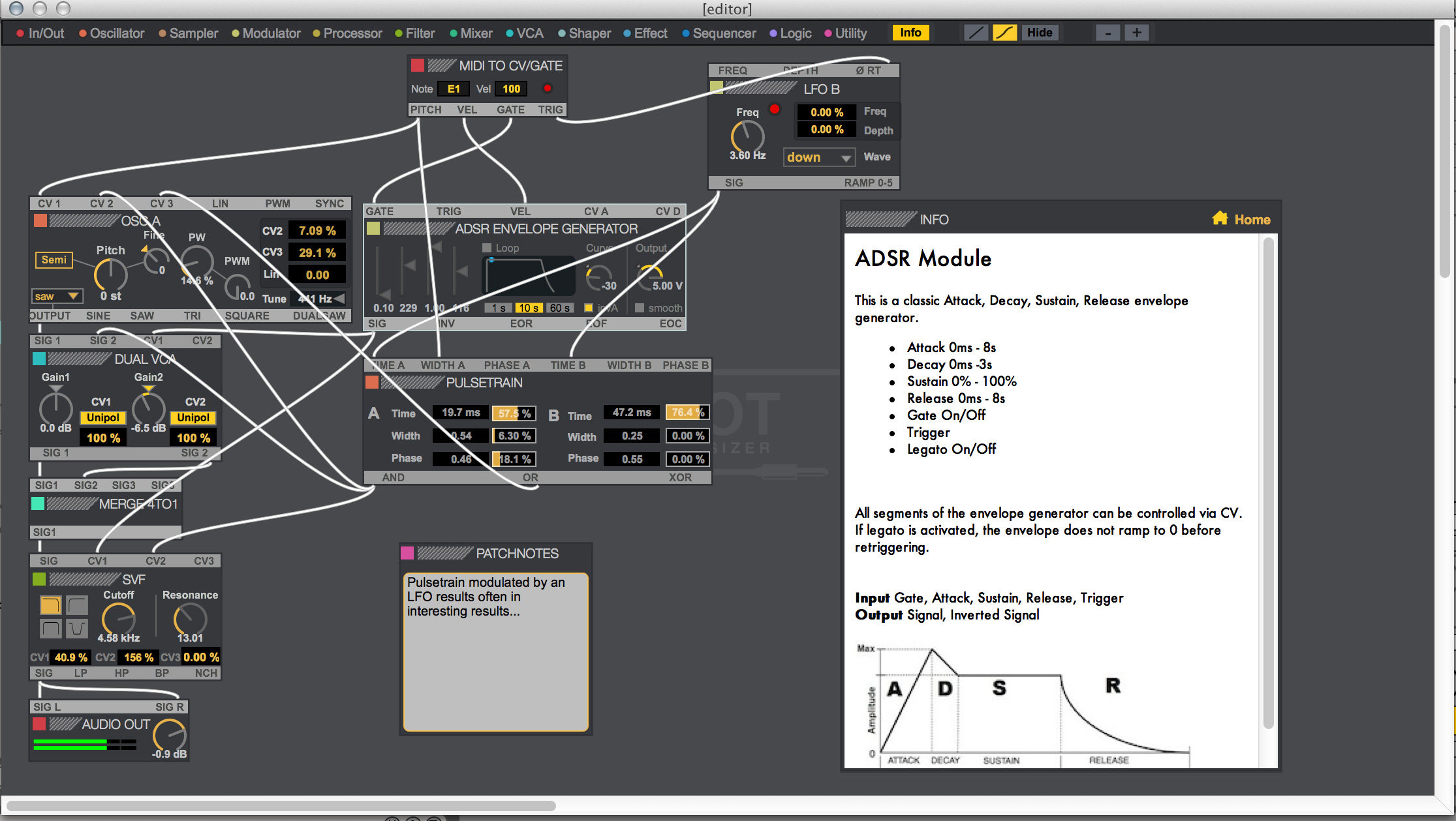 Oscillot supporte 6 voix de polyphonie et l’interface graphique vous permet d’afficher ou non les cordons si votre patch commence à être illisible. Une fenêtre d’Editor vous donne accès à toutes les informations de chaque module (fonctions détaillées, fonctionnalités, types de signal qu’il peut envoyer et recevoir), vous pourrez zoomer, ajouter des commentaires, des noms…