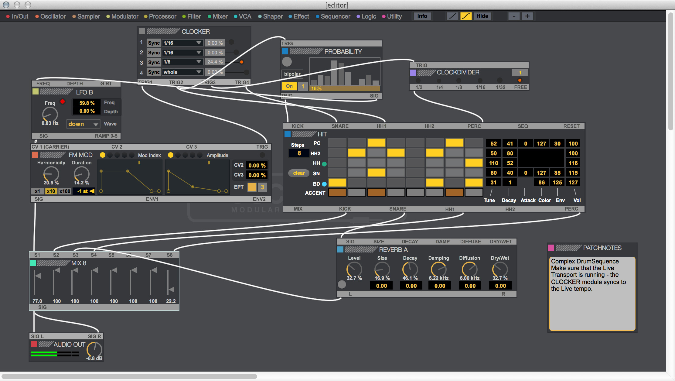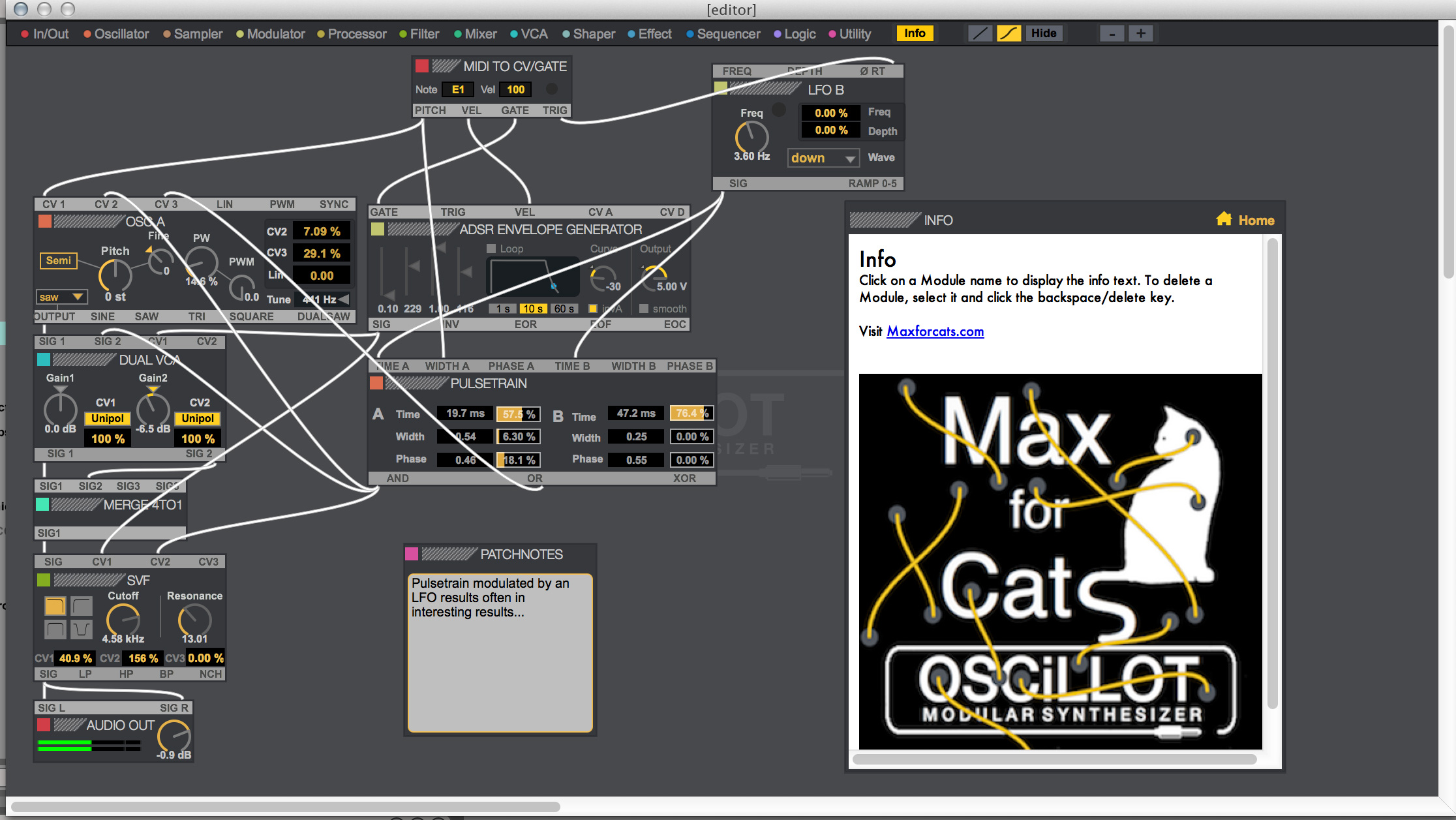 Oscillot est un système complet comprenant une centaine de modules (oscillators, processeurs, filtres, mixers, modulateurs, amplis, séquenceurs, utilitaires, effets…) que vous assemblerez via des câbles virtuels. Ces patches pourront ensuite être édités et sauvegardés et Max for Cats prévoit d’ajouter de nouveaux modules dans le futur.