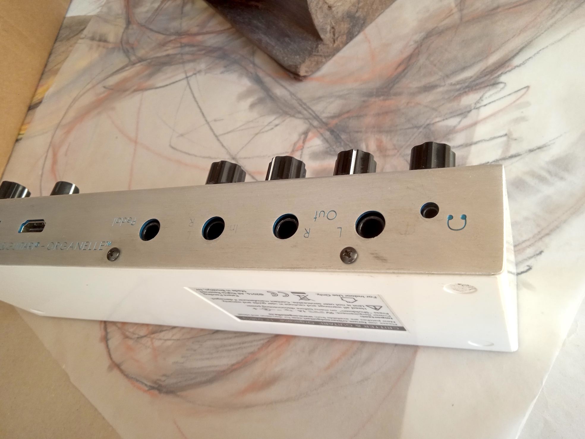 Pas d’alim originale, mais je fournis un inverseur de polarité qui permet de l’utiliser avec n’importe quelle alimentation 9V (type Boss).