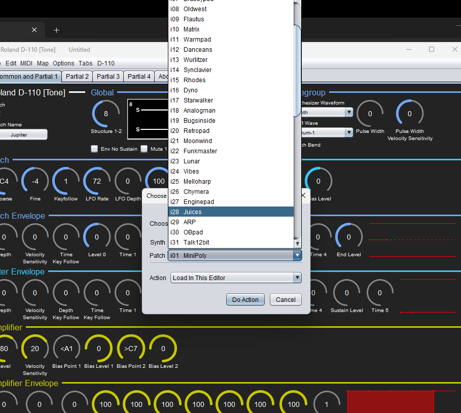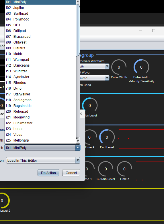 Chargement de 64 Patches à la fois, simple sélection et clique droit pour écouter/jouer le timbre en direct.