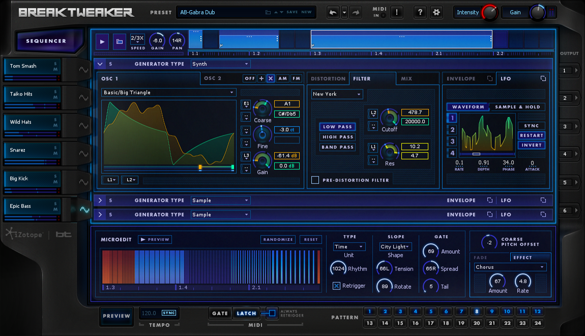 BreakTweaker n’est pas juste une simple boîte à rythmes, mais plutôt un environnement de sculpture rythmique et mélodique incluant un séquenceur et les outils de manipulation sonore et de synthèse dont iZotope a le secret. Une banque d’échantillons de batterie est également fournie par BT.
