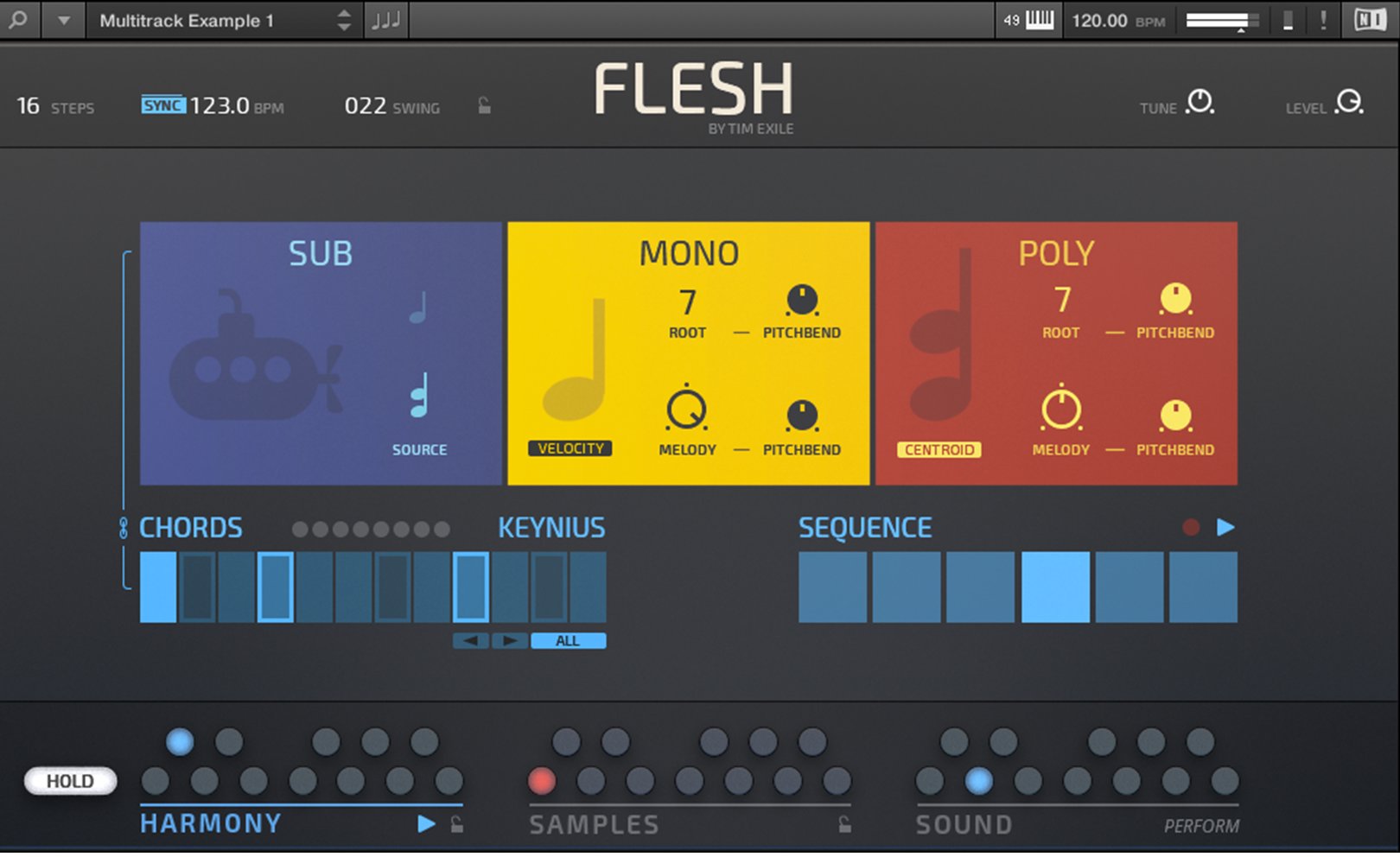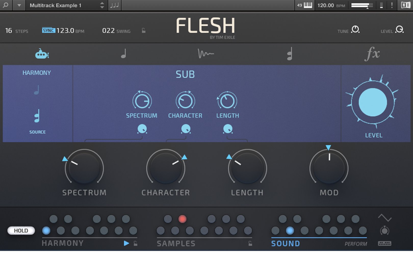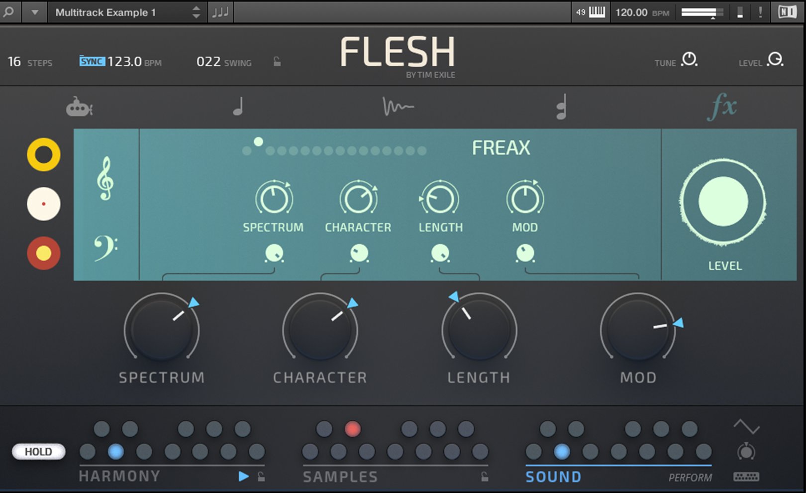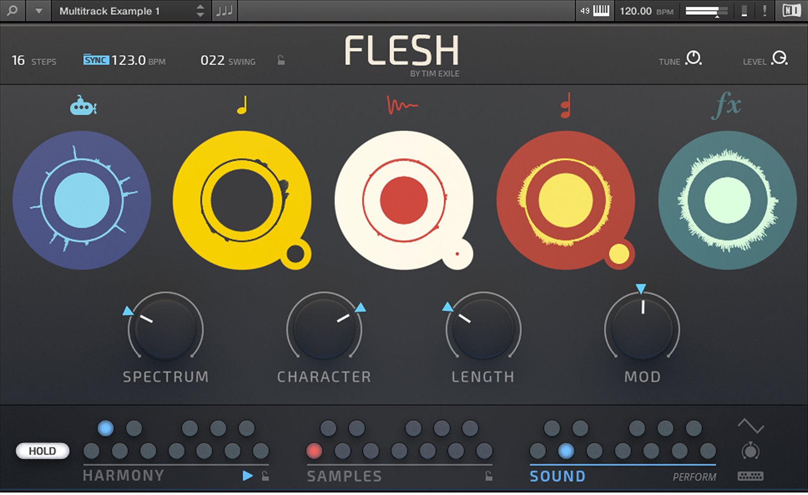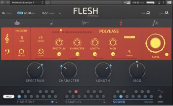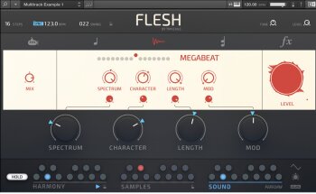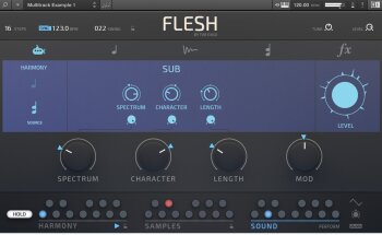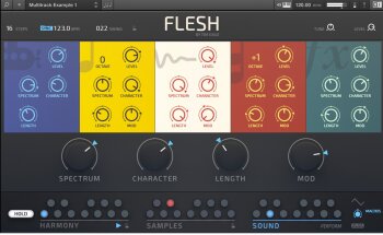 Flesh est conçu pour Reaktor 6 et le Reaktor 6 Player. Tim Exile a développé ici un instrument qui combine synthèses granulaire, à tables d’ondes, un moteur de samples, un générateur de sub à de la modulation et des effets. Il inclut de plus 70 snapshots de lignes de basses, de mélodies, de pads, etc.